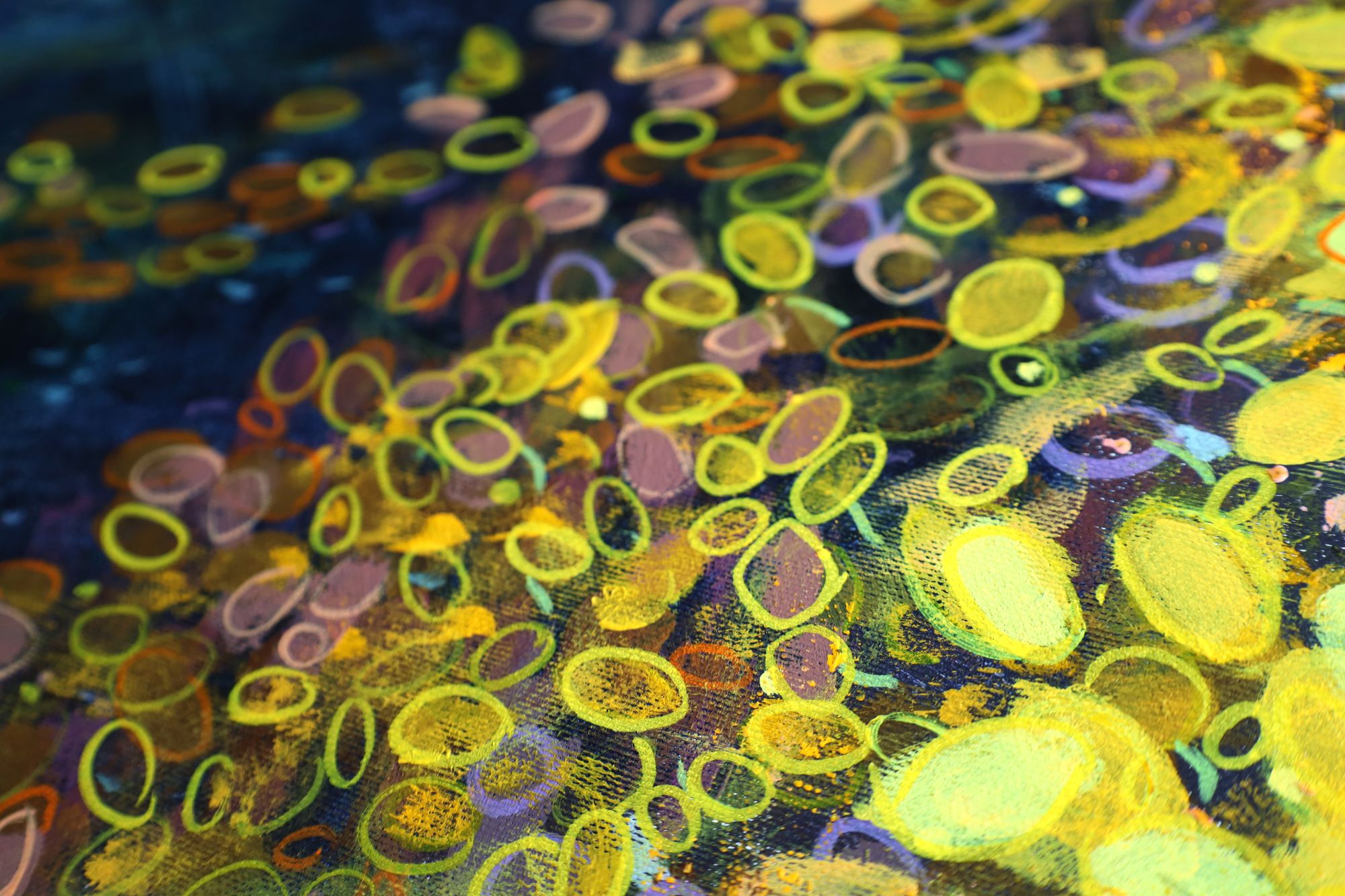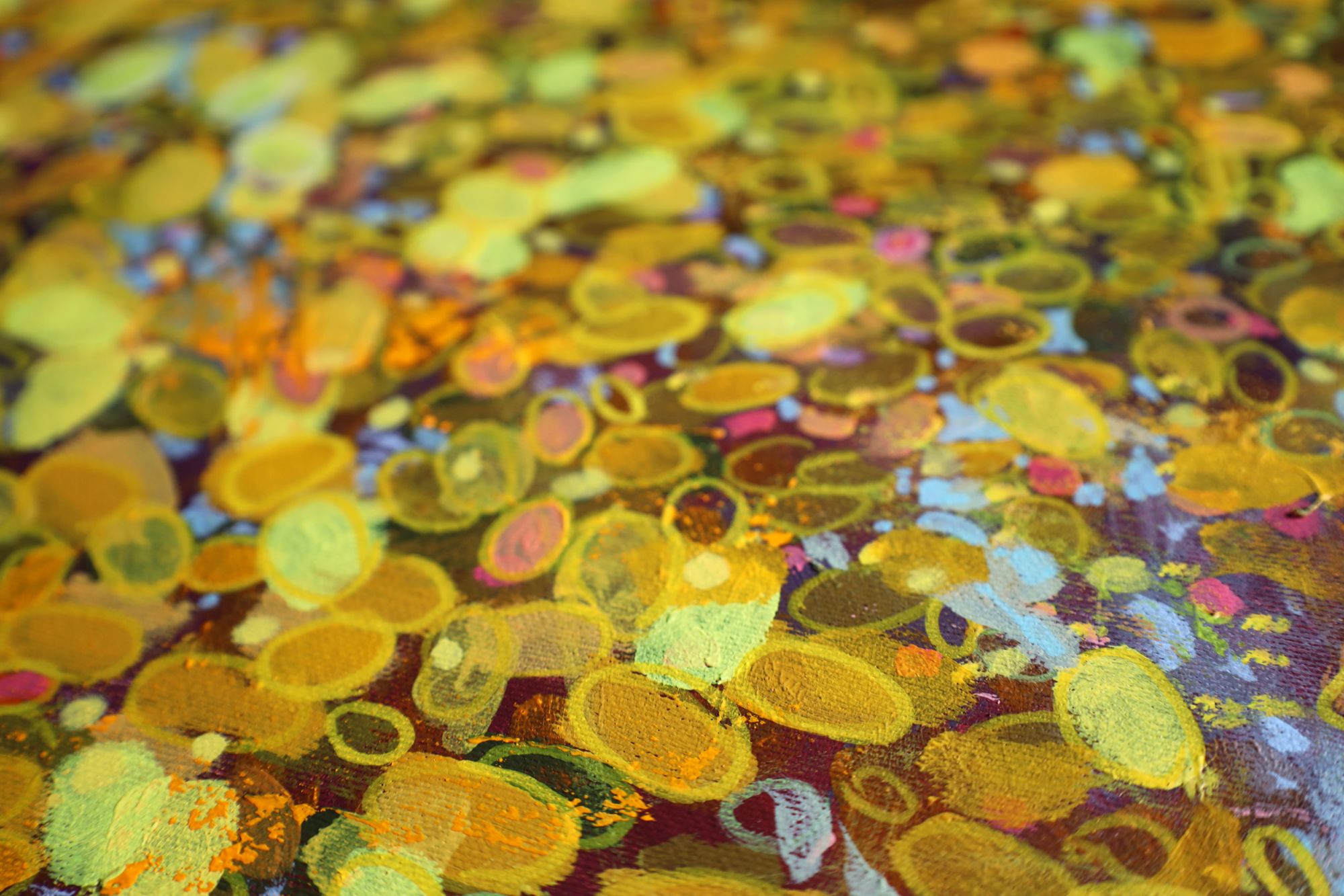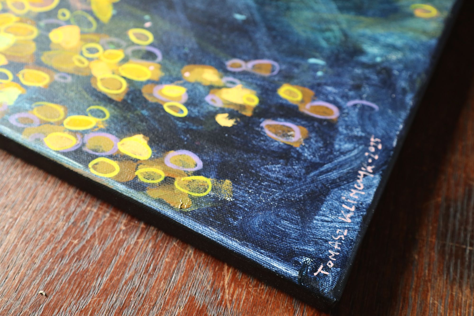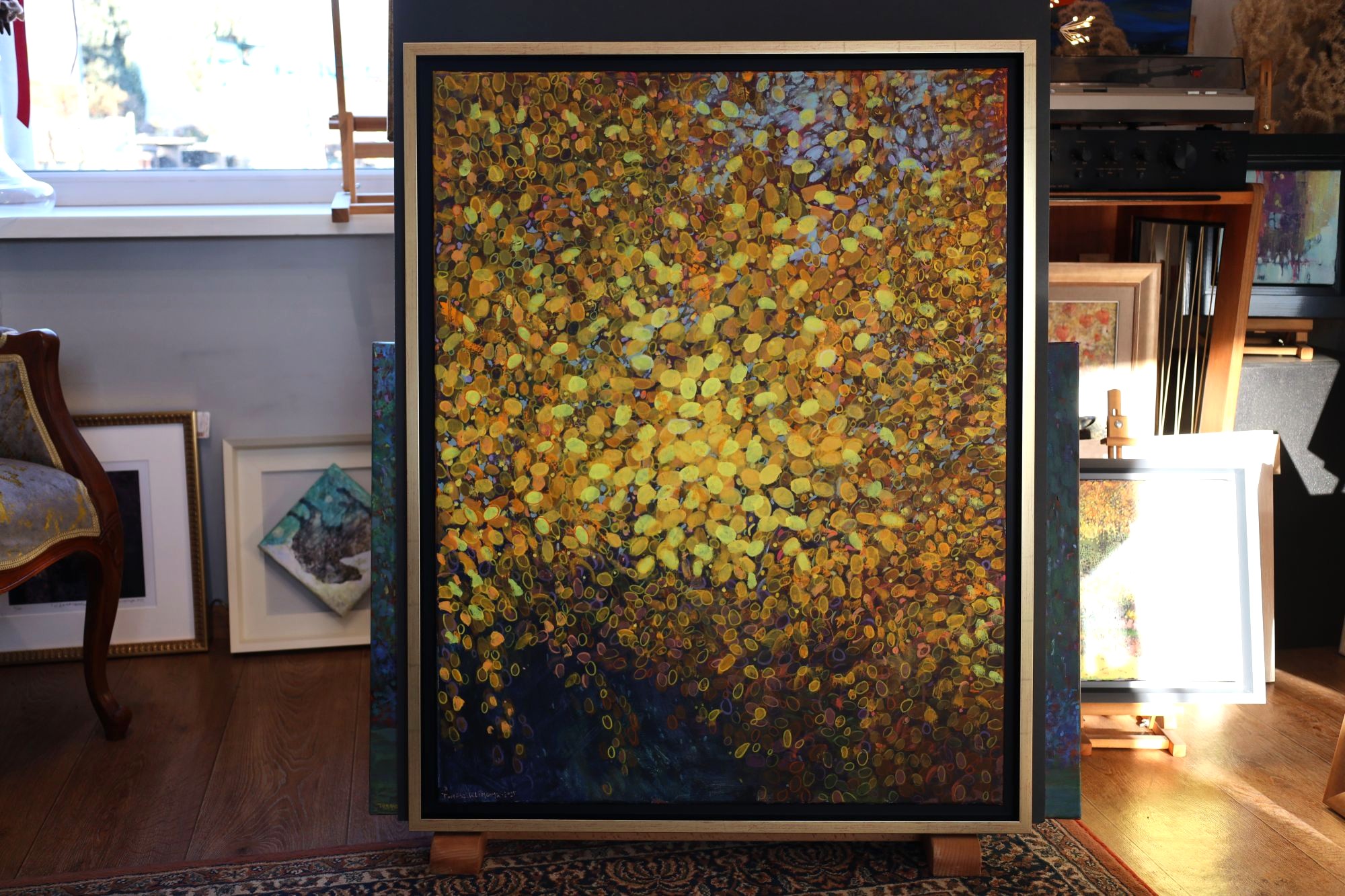 Nowoczesny obraz ręcznie malowany przez artystę. Szalony motyw ogrodu, pełen ciepła i słońca. Utrzymany w odcieniach żółci z refleksami błękitu i fioletu. Cała feeria barw ! Ten mocno energetyzujący obraz doda Twojemy wnętrzu charakteru !