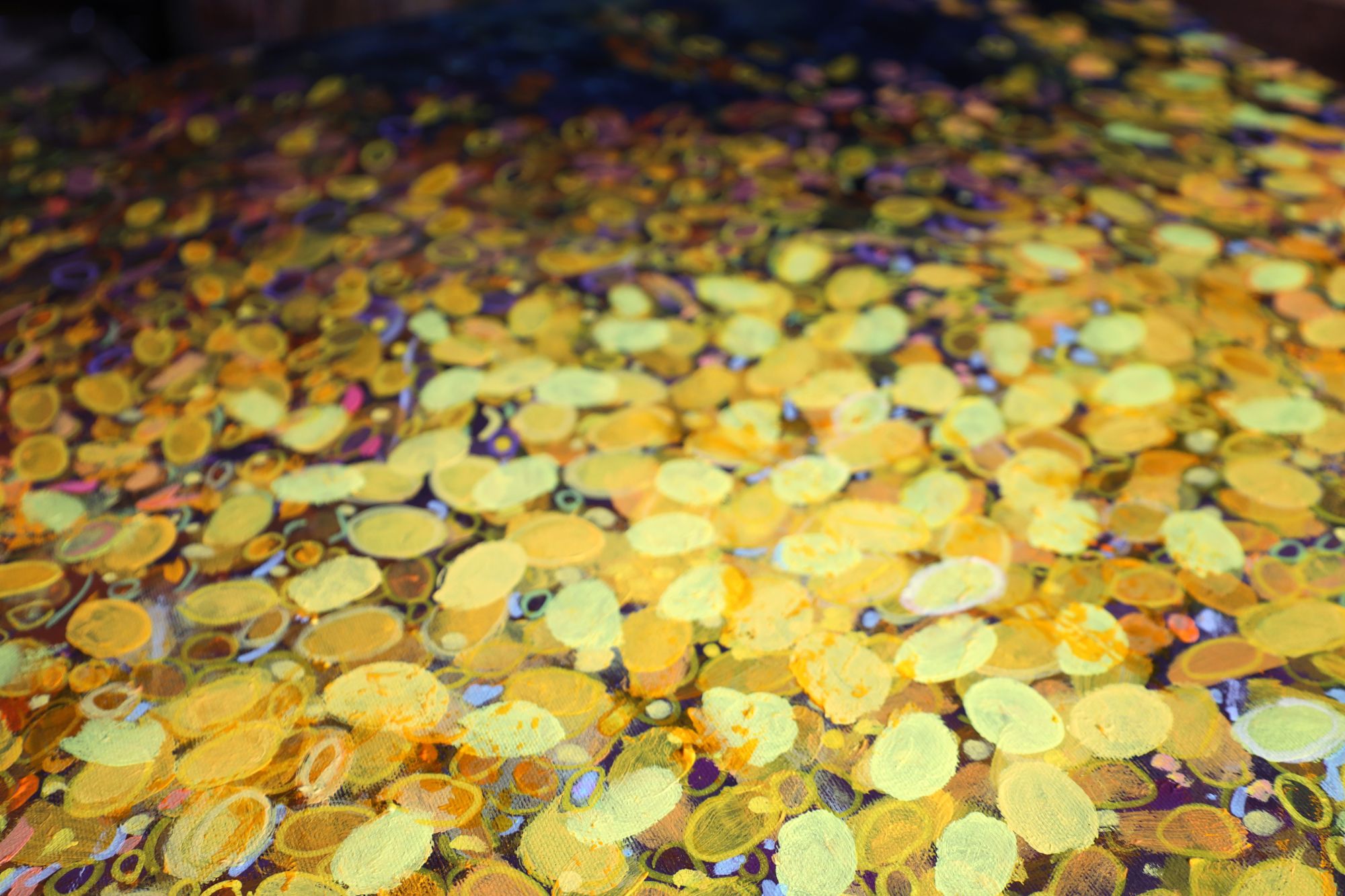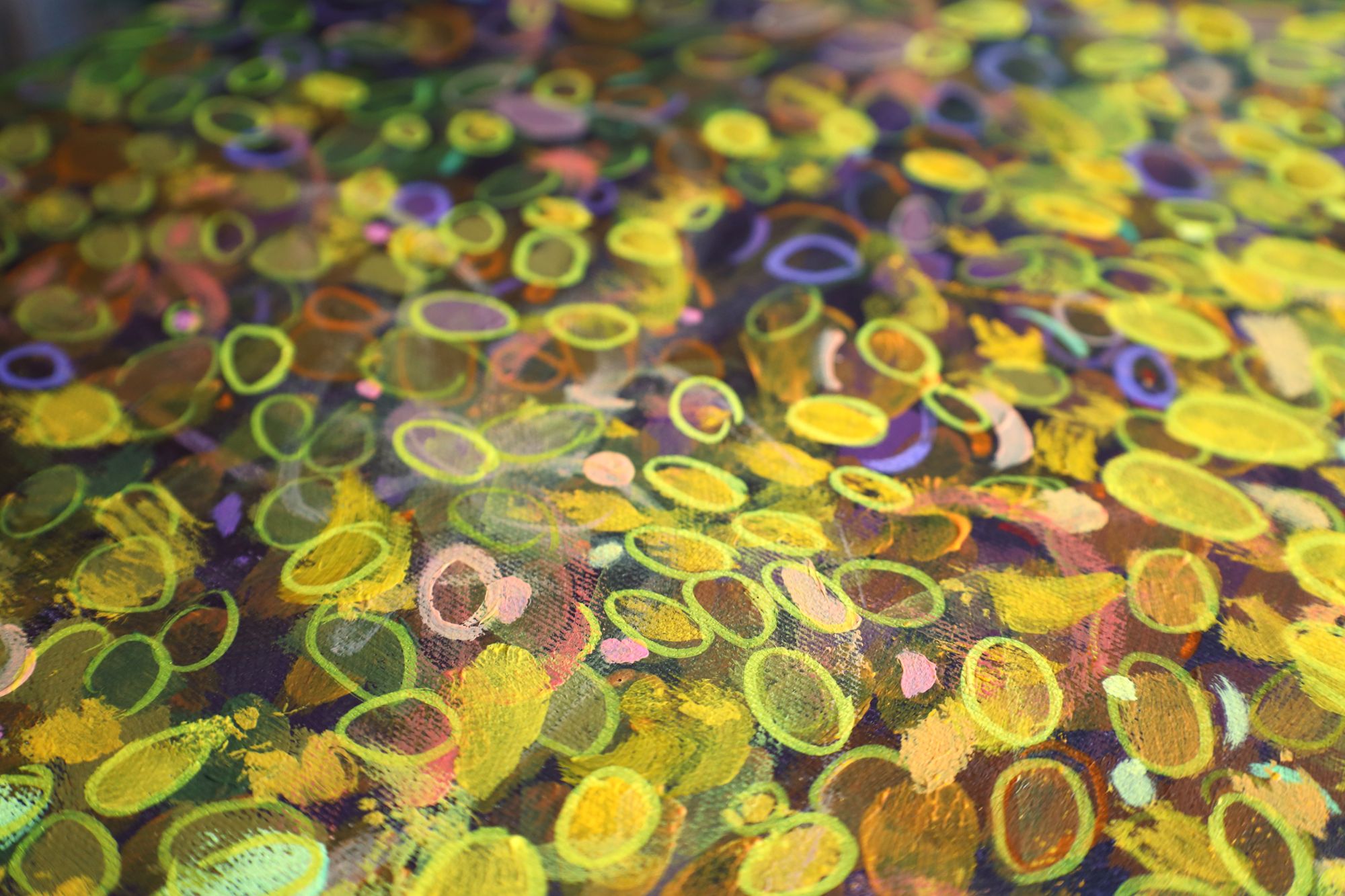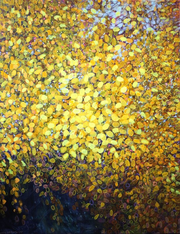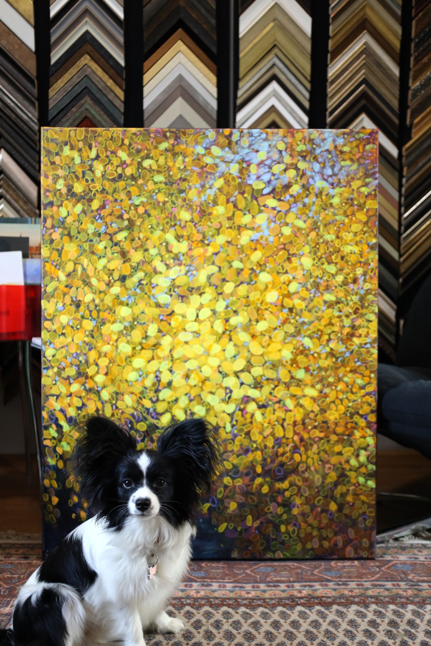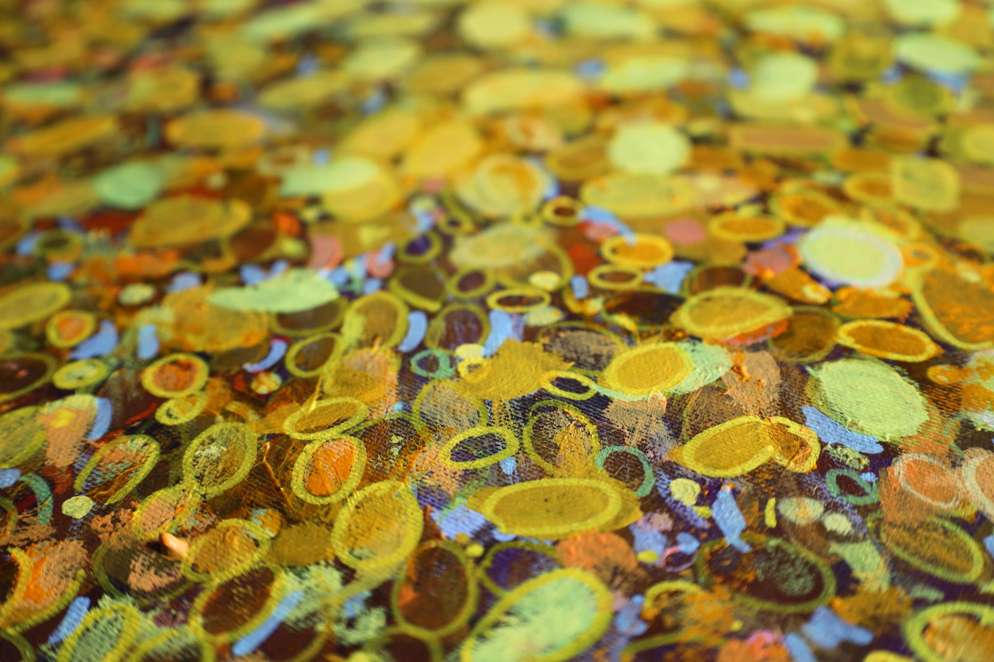 Nowoczesny obraz ręcznie malowany przez artystę. Szalony motyw ogrodu, pełen ciepła i słońca. Utrzymany w odcieniach żółci z refleksami błękitu i fioletu. Cała feeria barw ! Ten mocno energetyzujący obraz doda Twojemy wnętrzu charakteru !