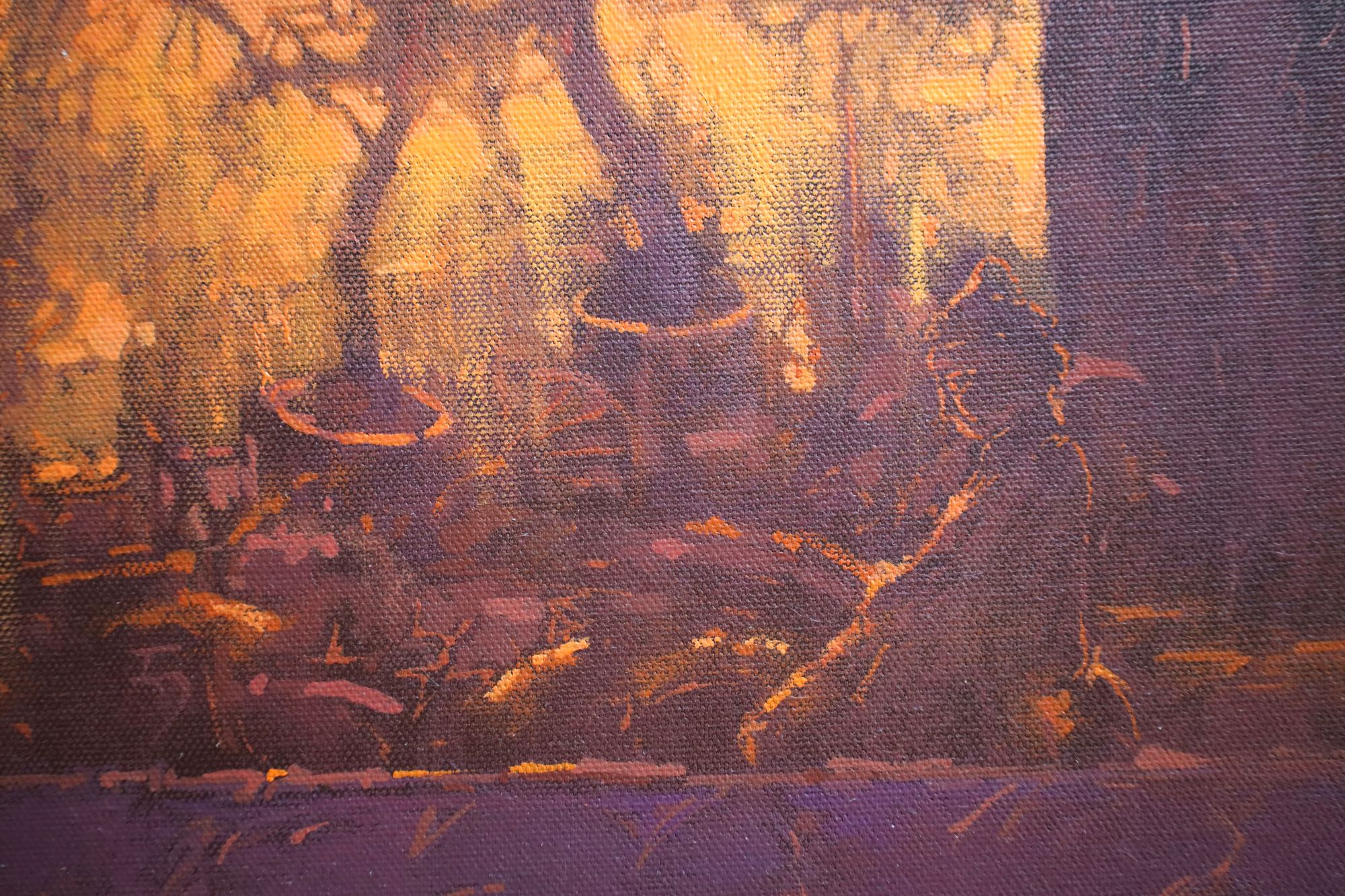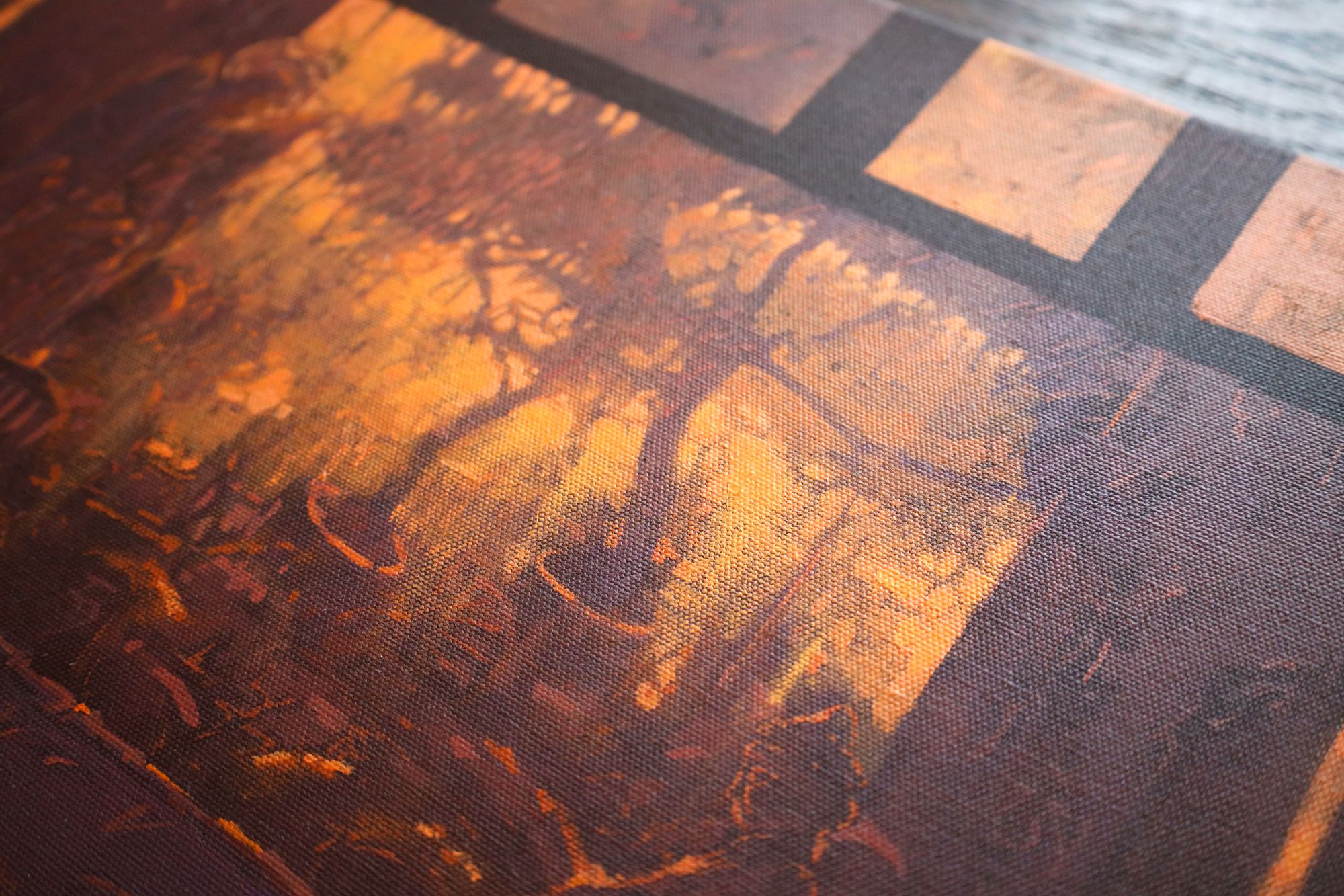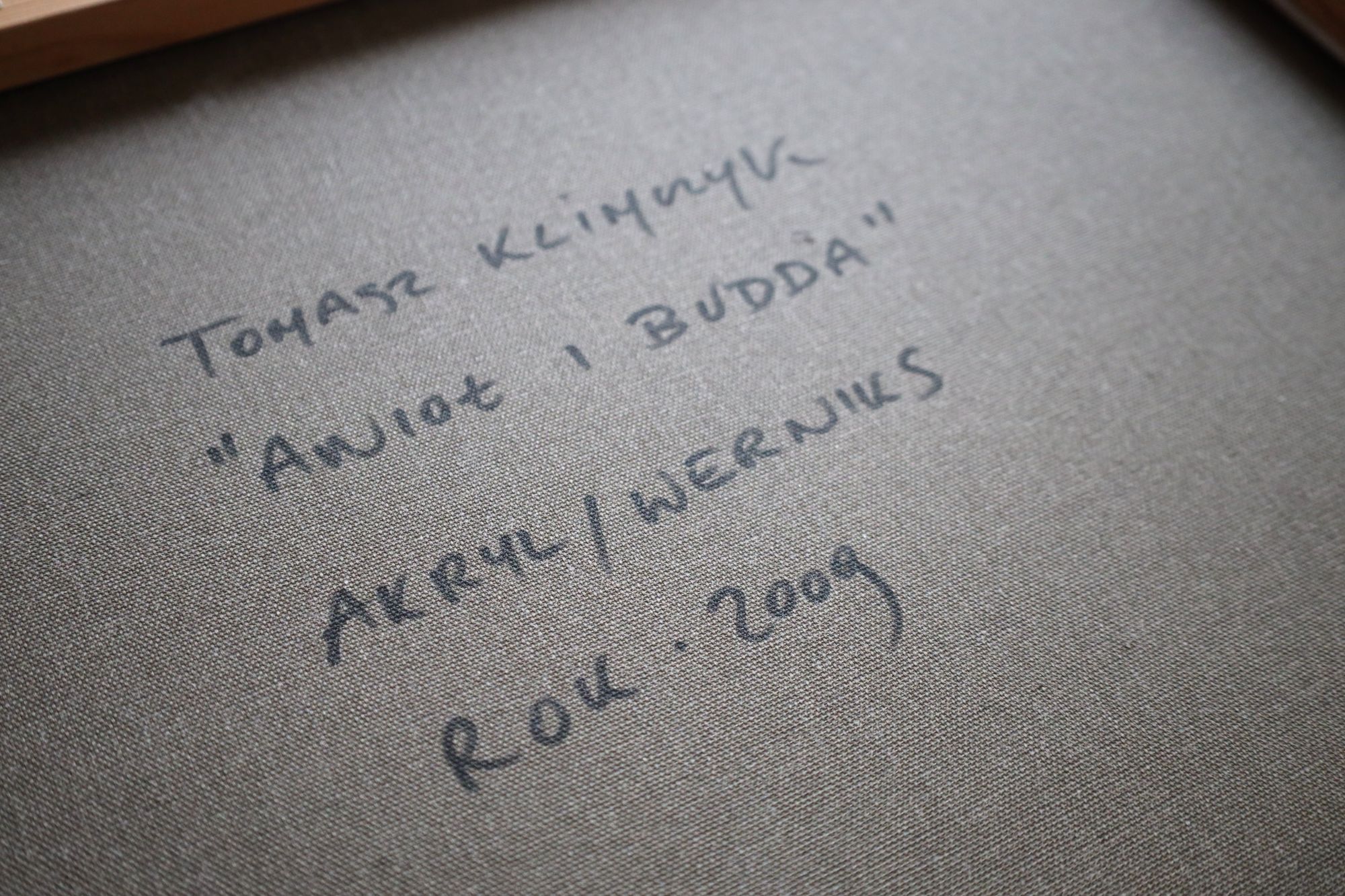 Obraz akrylowy na płótnie ręcznie malowany przez artystę. Obraz przedstawia figurę Anioła oraz figurkę Buddy w ciepłym blasku poranka. Jasne promienie światła wlewają się przez okno, tworząc harmonijną grę kolorów, które podkreślają jej ciszę i spokój. Utrzymany w ciepłych odcieniach bordowych. Jest to jeden z trzech 'kadrów’ namalowanych w 2009 roku.