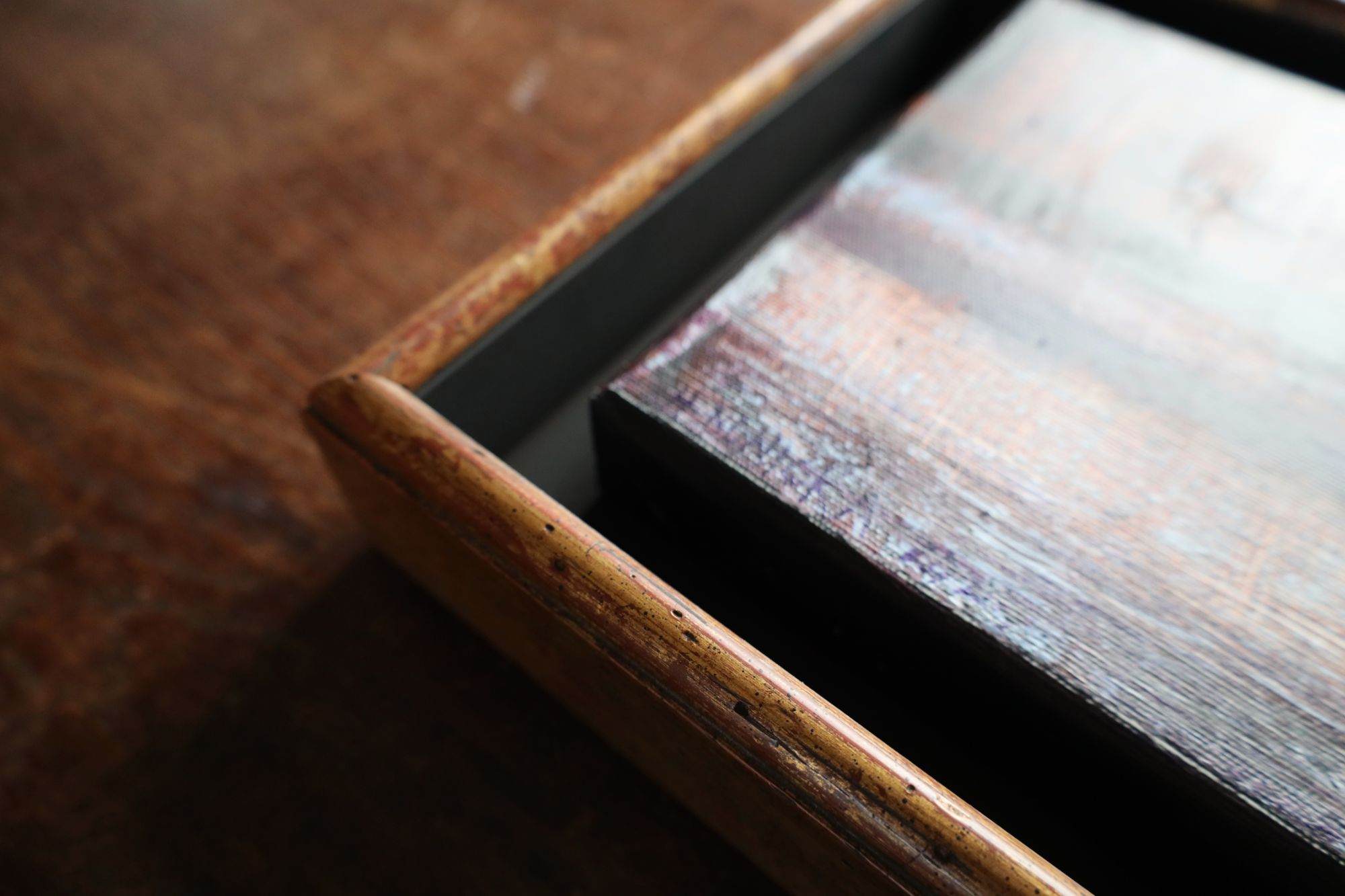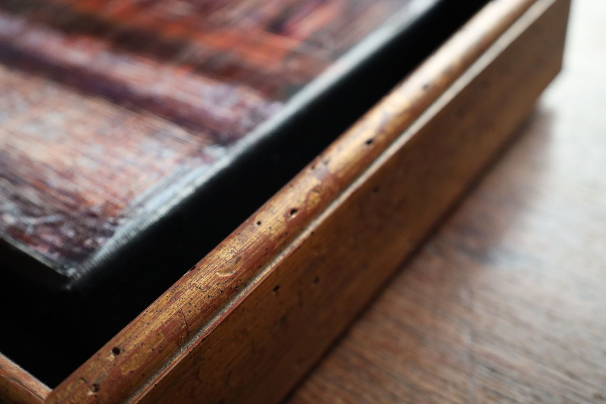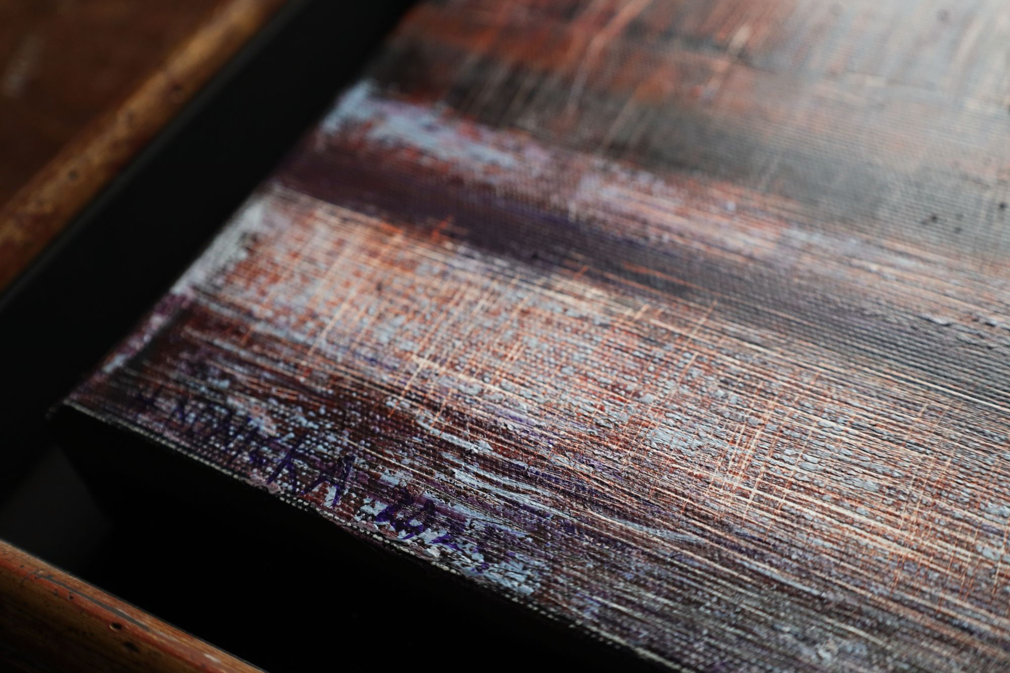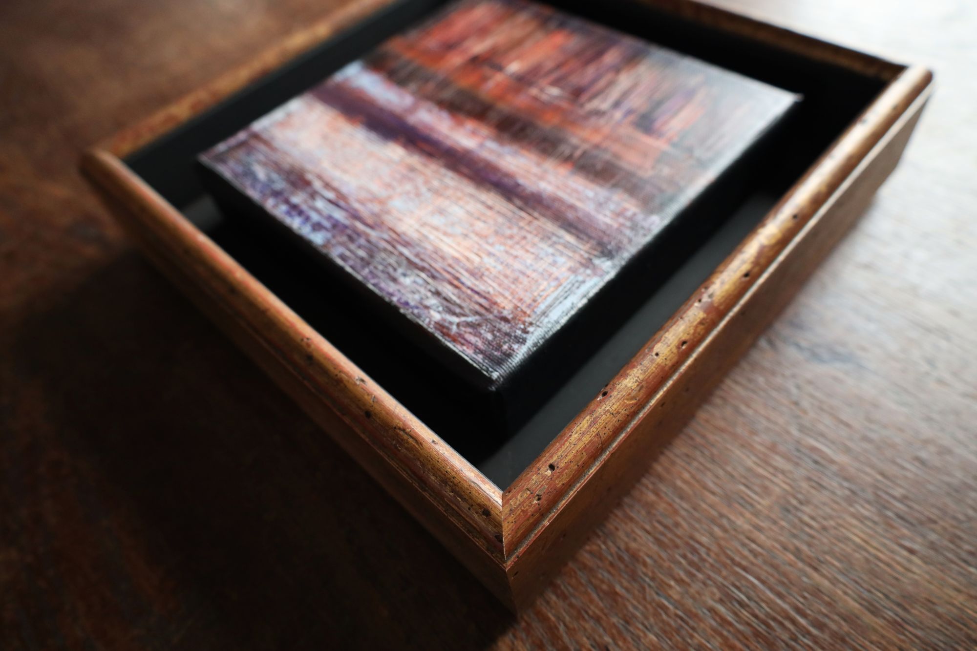 Obraz jest oprawiony w drewnianą ramę typu american box , ręcznie wykończoną, w kolorach brązu i złota. Wysokość obrazu w ramie to 6,5 cm.