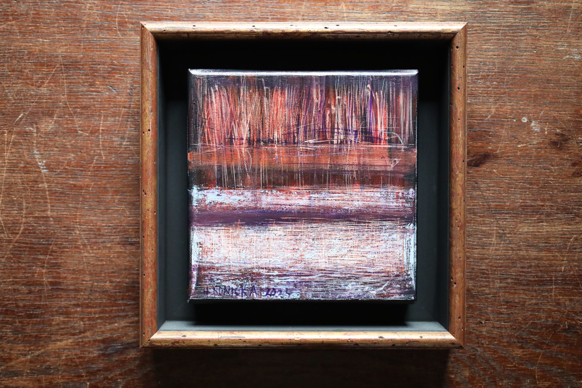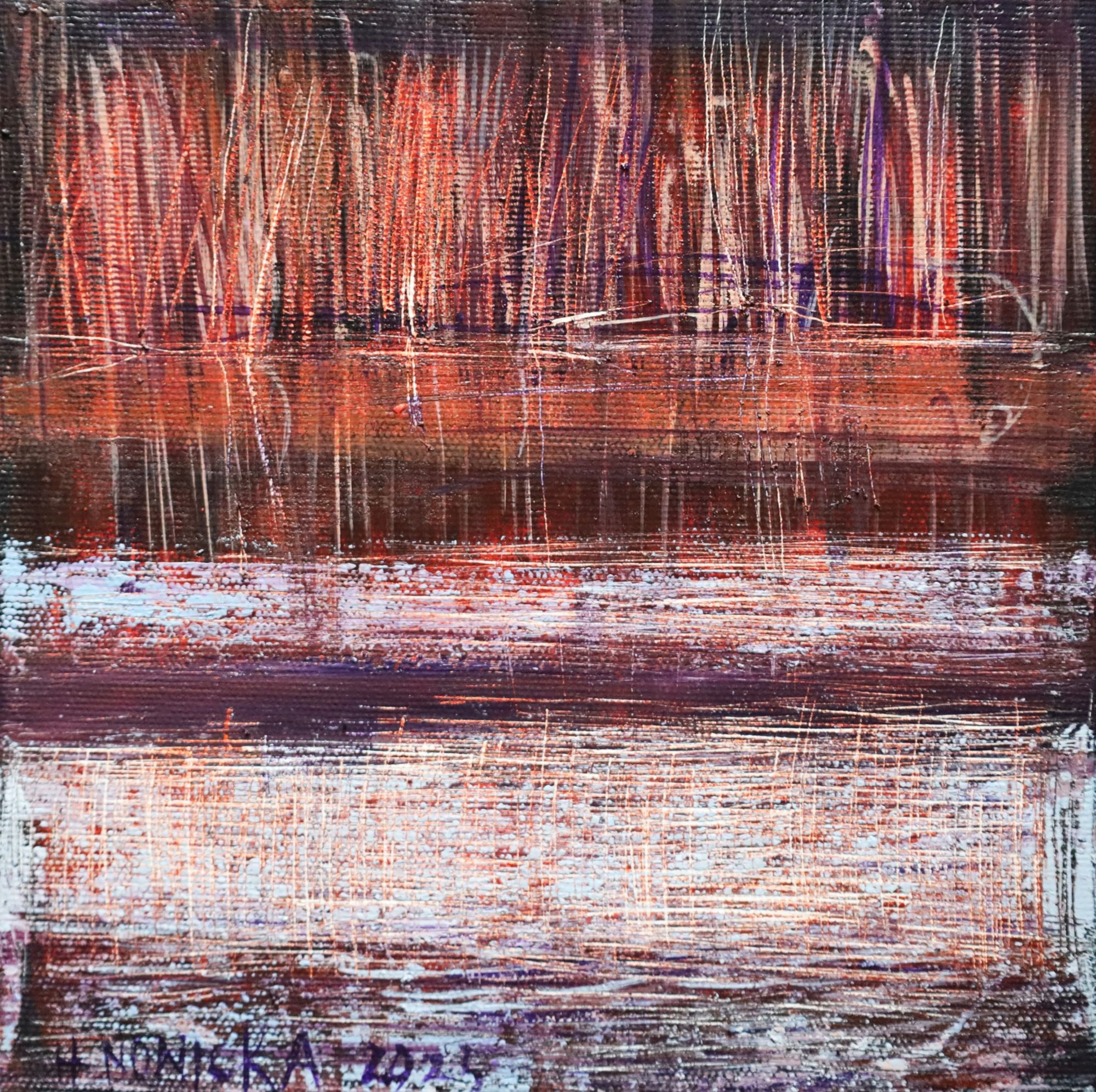 Obraz w stylu impresjonistycznym, przedstawiający fragment brzegu rzeki. Utrzymany w przyjemnych, ciepłych kolorach. Obraz bardzo nowoczesny, wykonany techniką akrylową na płótnie. Mały format.