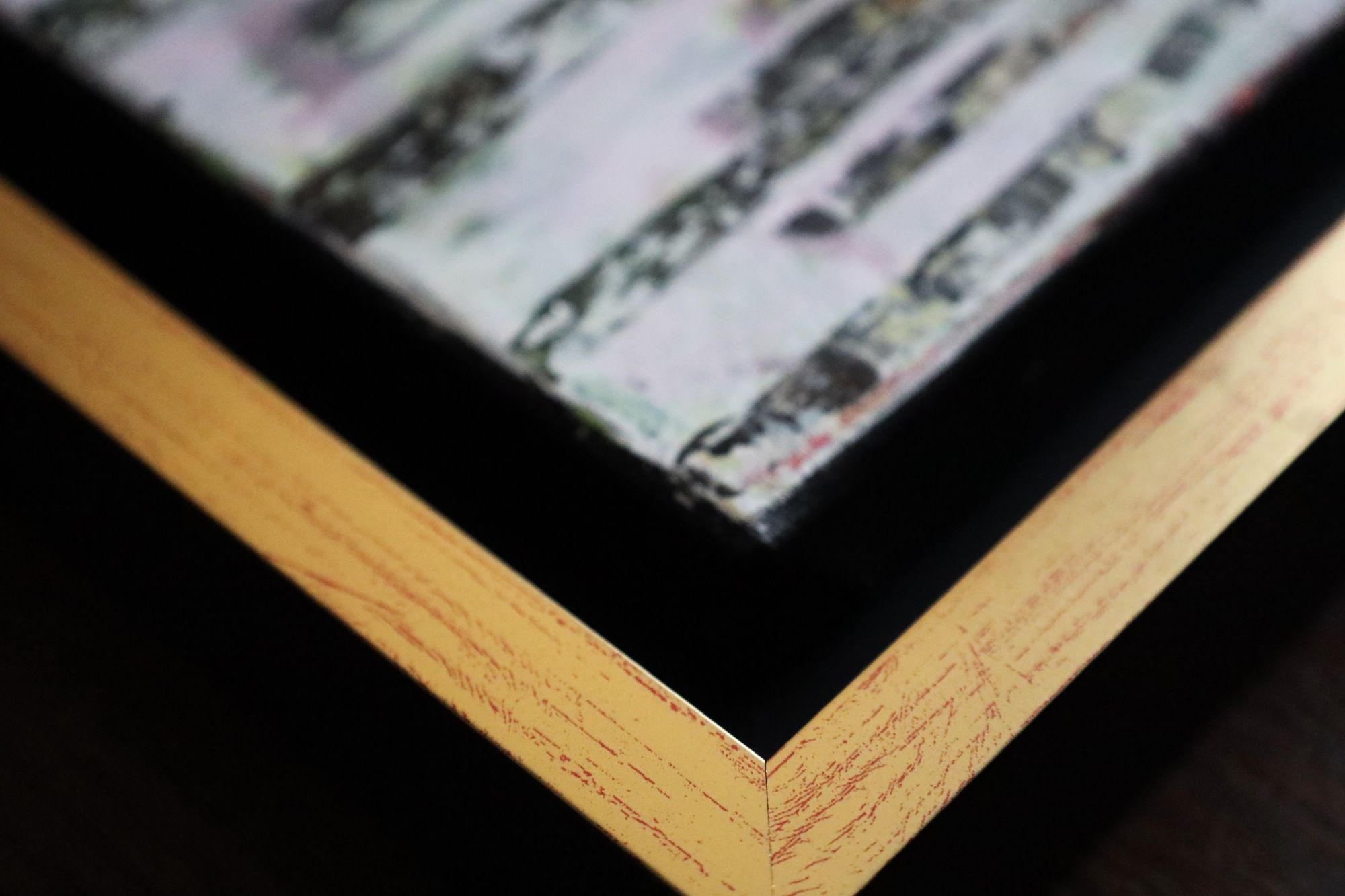 Obraz jest oprawiony w drewnianą ramę typu american box , ręcznie wykończoną, w kolorach złota.