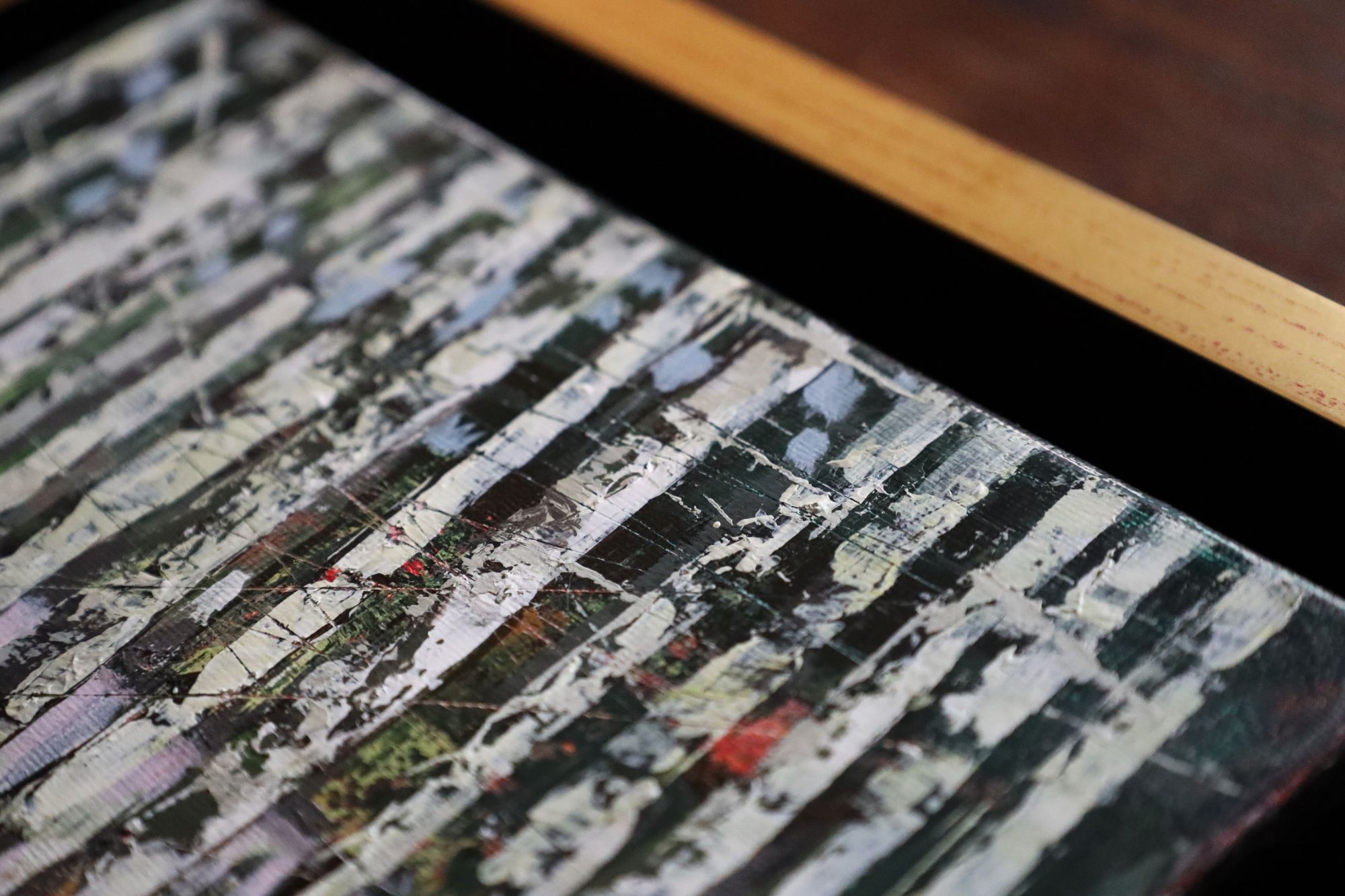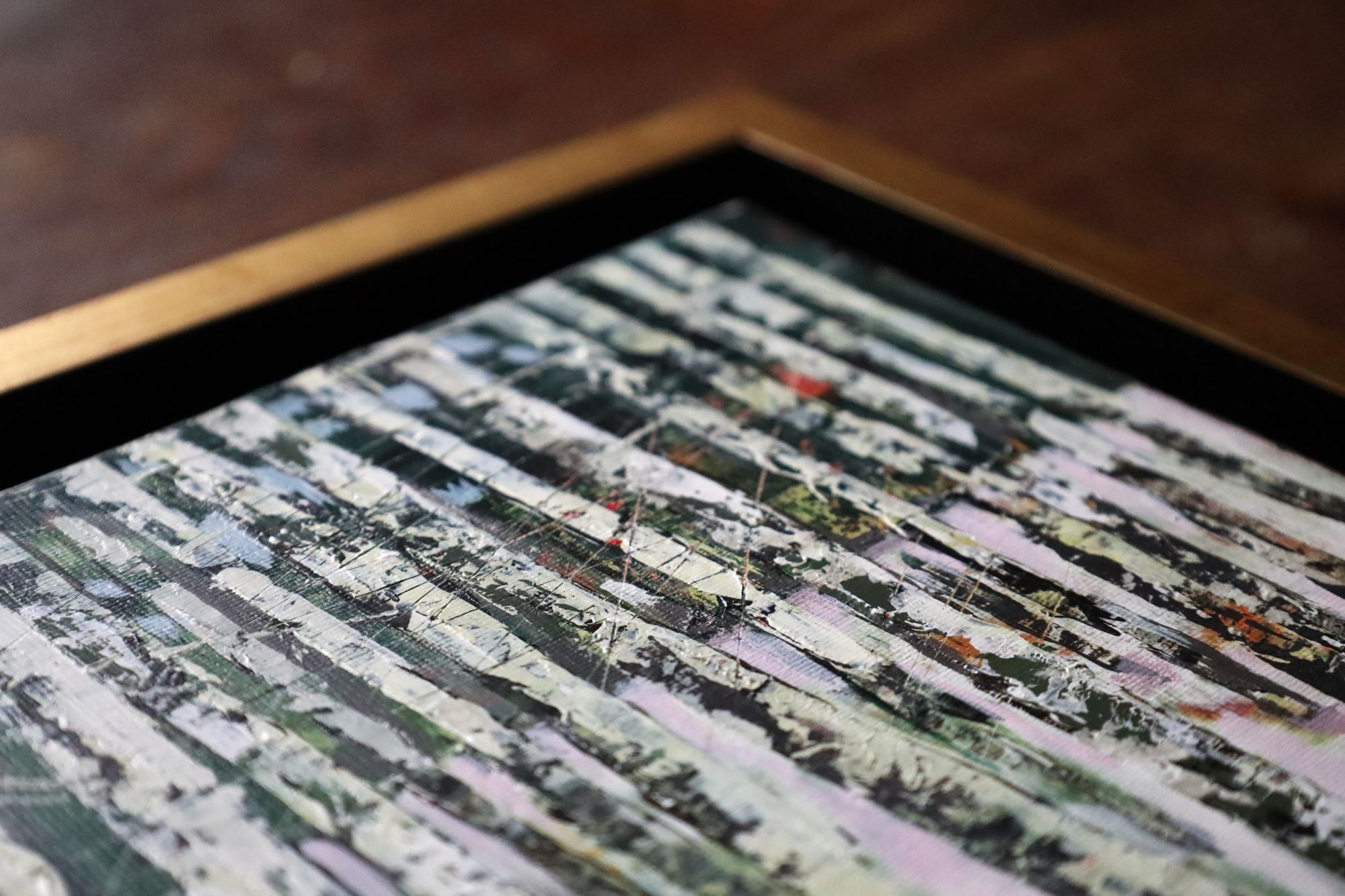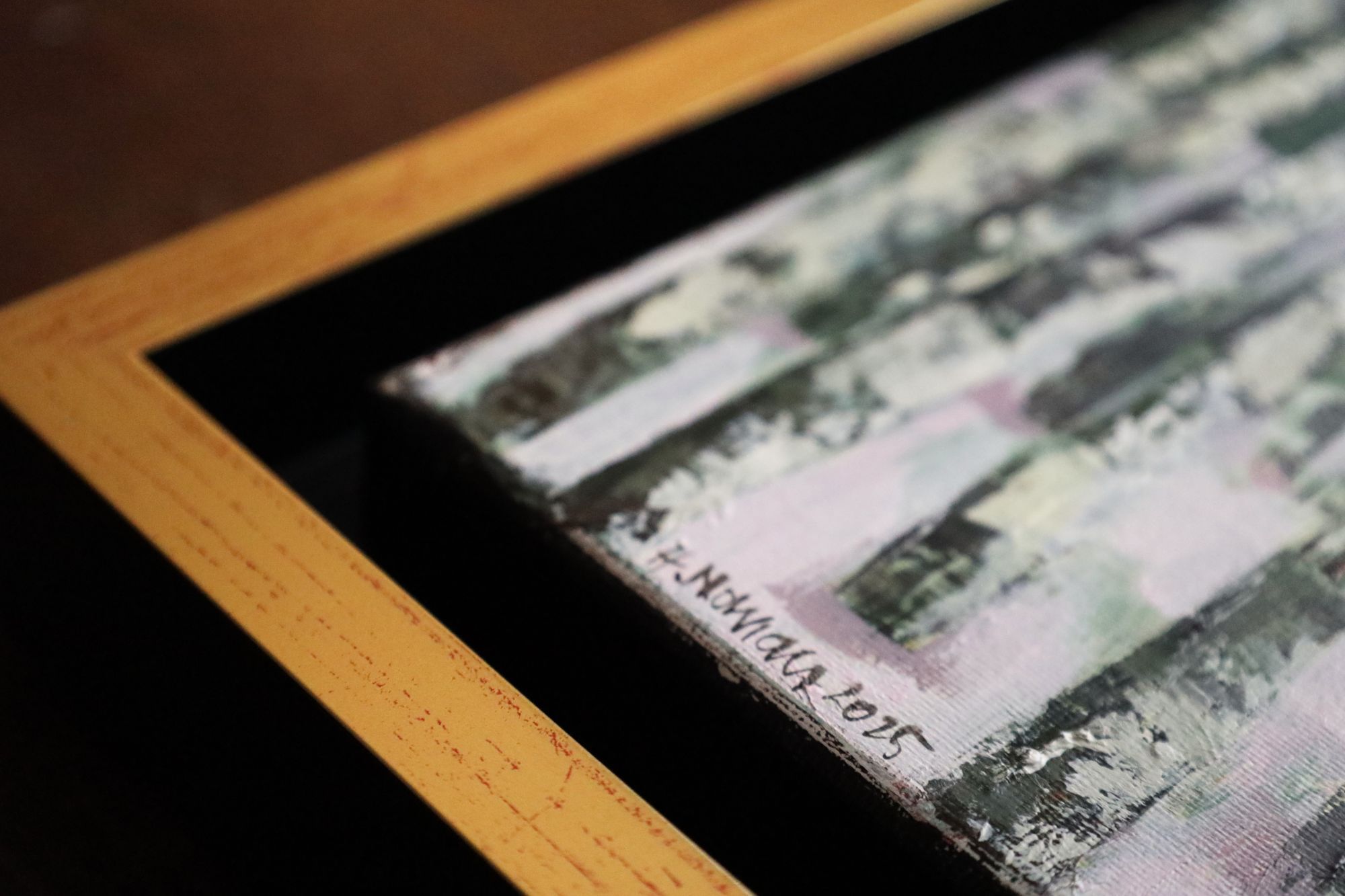 Obraz w stylu impresjonistycznym, przedstawiający fragment brzozowego zagajnika. Obraz bardzo nowoczesny, wykonany techniką akrylową na płótnie. Mały format.
