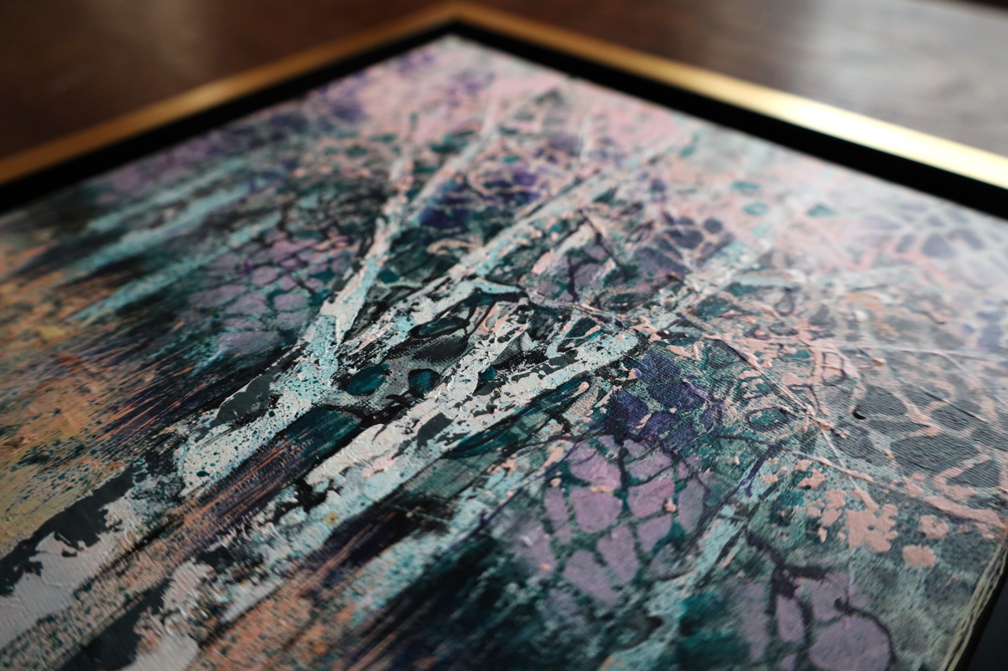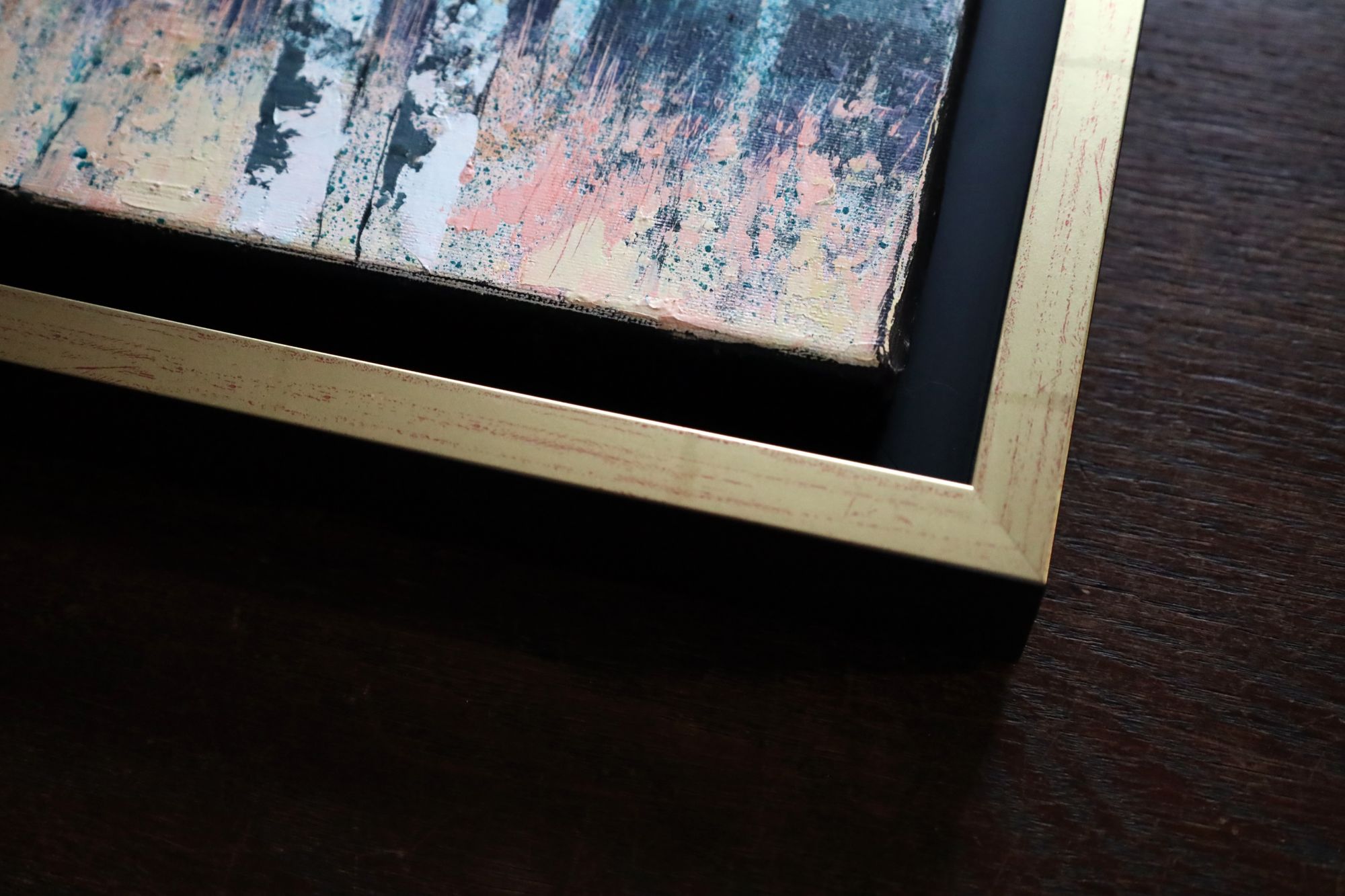 Obraz jest oprawiony w drewnianą ramę typu american box ze złotym wykończeniem, wnętrze i bok czarny mat. Obraz jest sprzedawany w oprawie.
