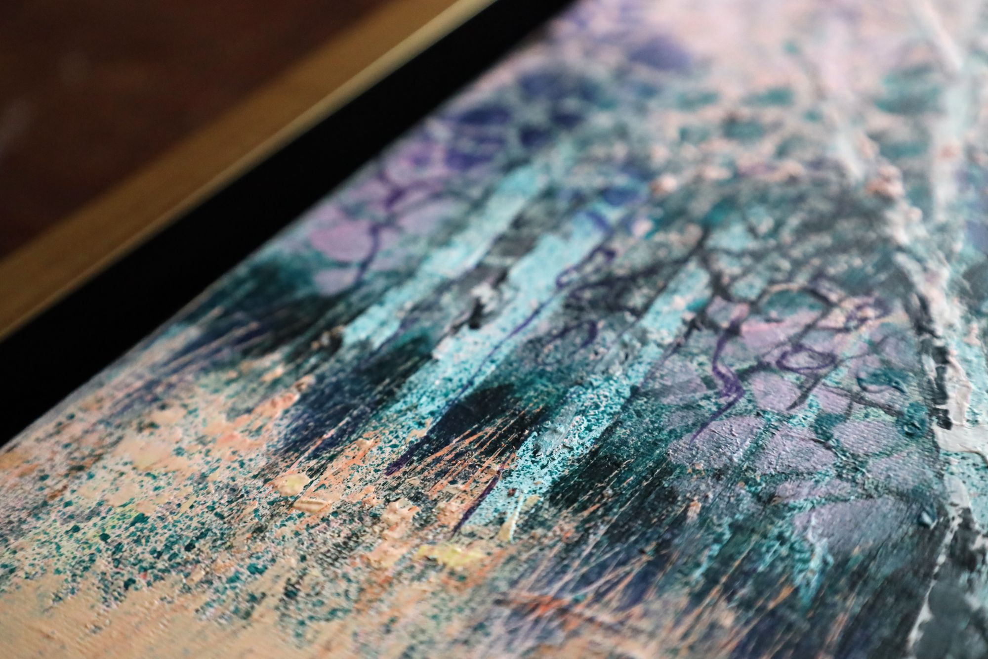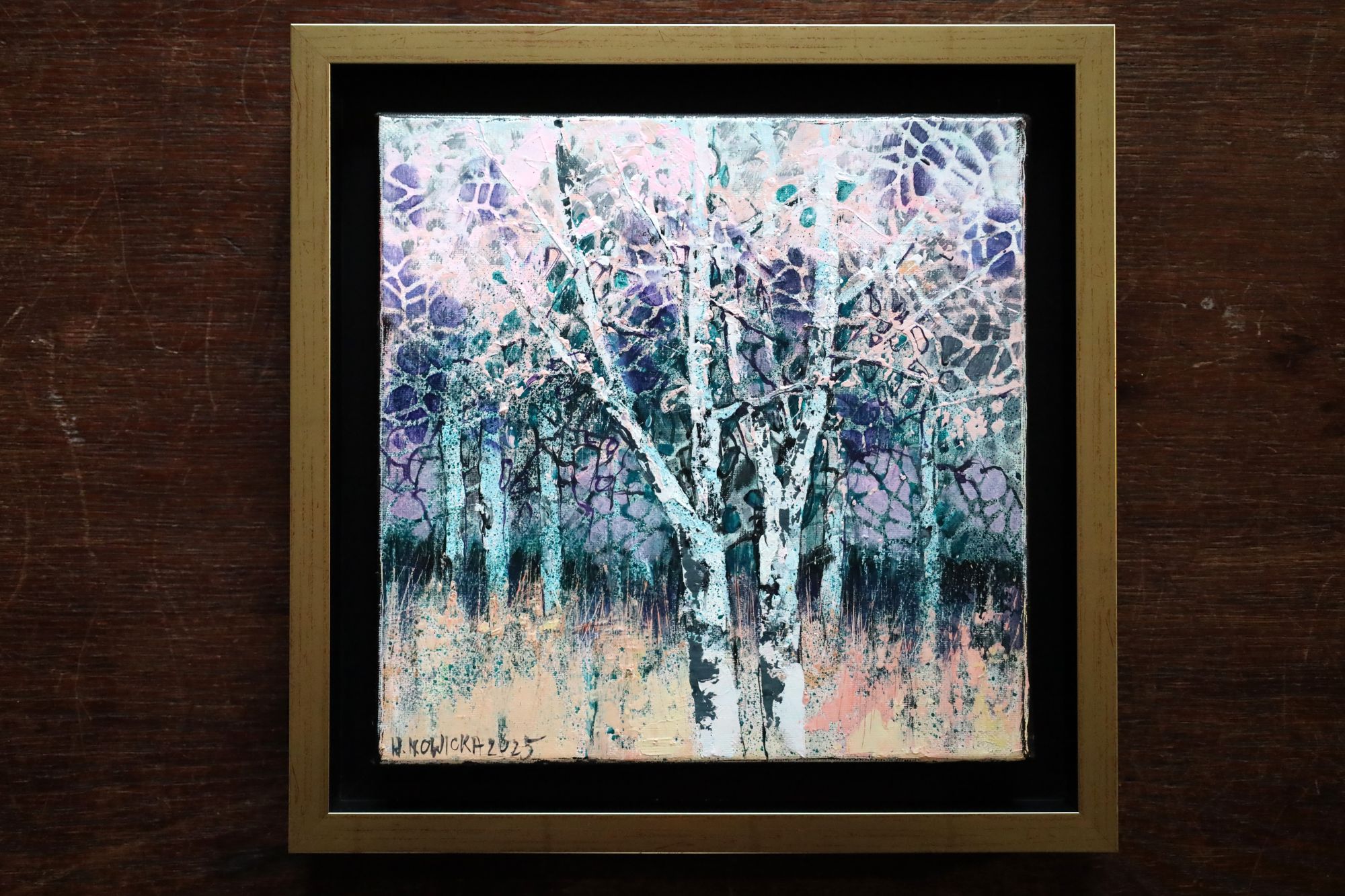 Obraz w stylu impresjonistycznym, przedstawiający zimowy pejzaż. Utrzymany w przyjemnych, jasnych, pastelowych kolorach. Obraz bardzo nowoczesny, wykonany techniką akrylową na płótnie. Mały format.