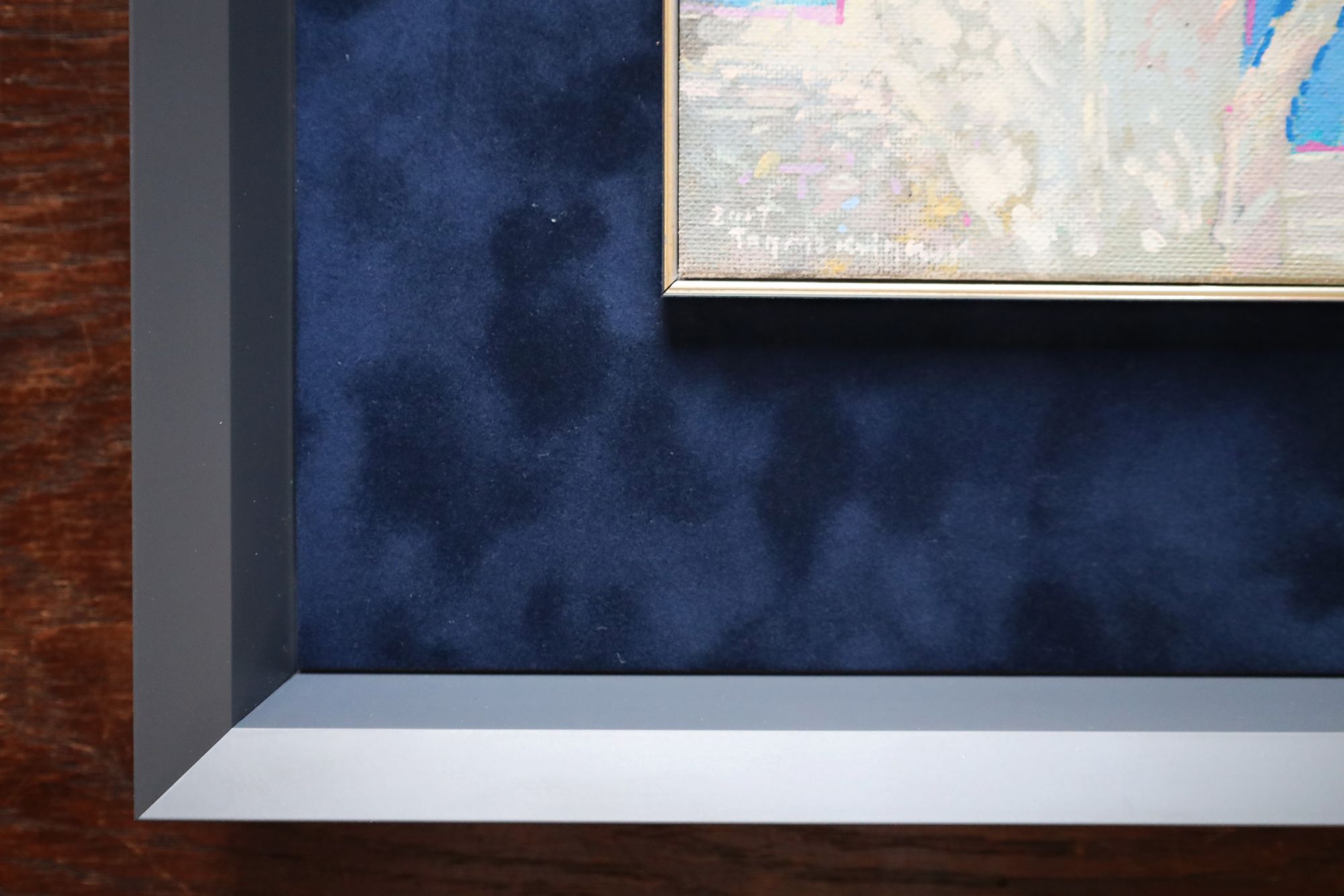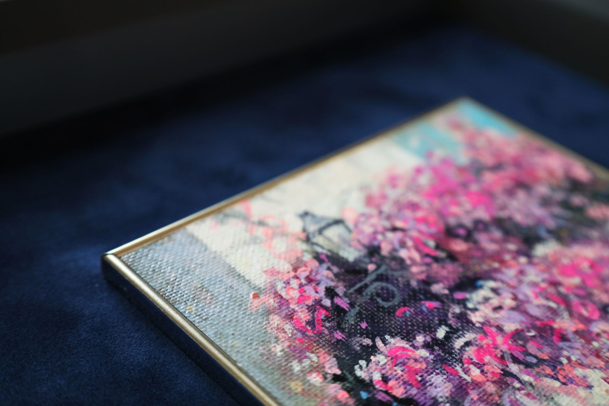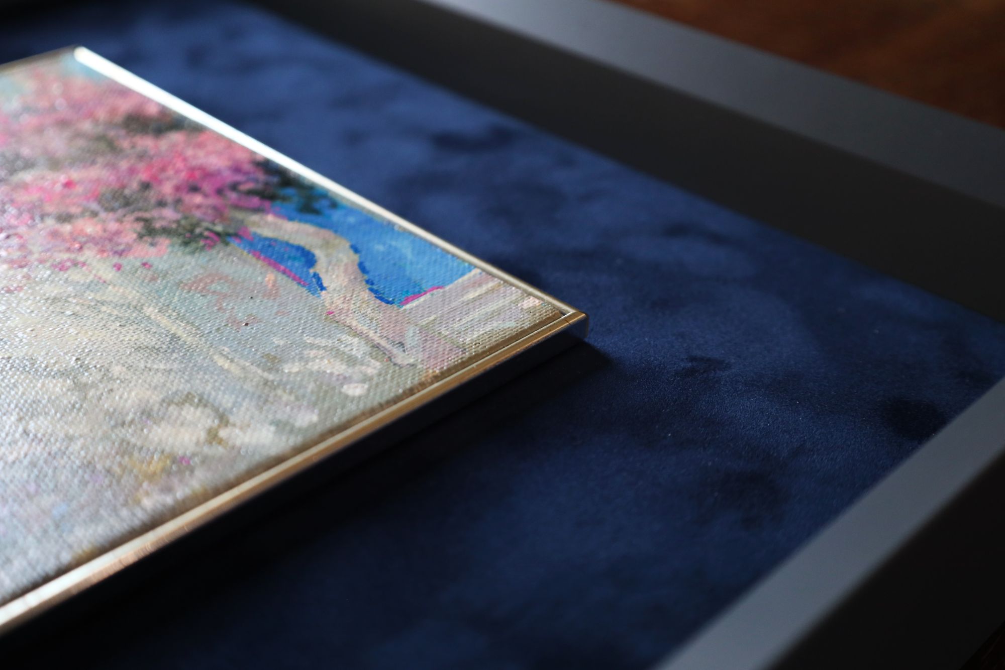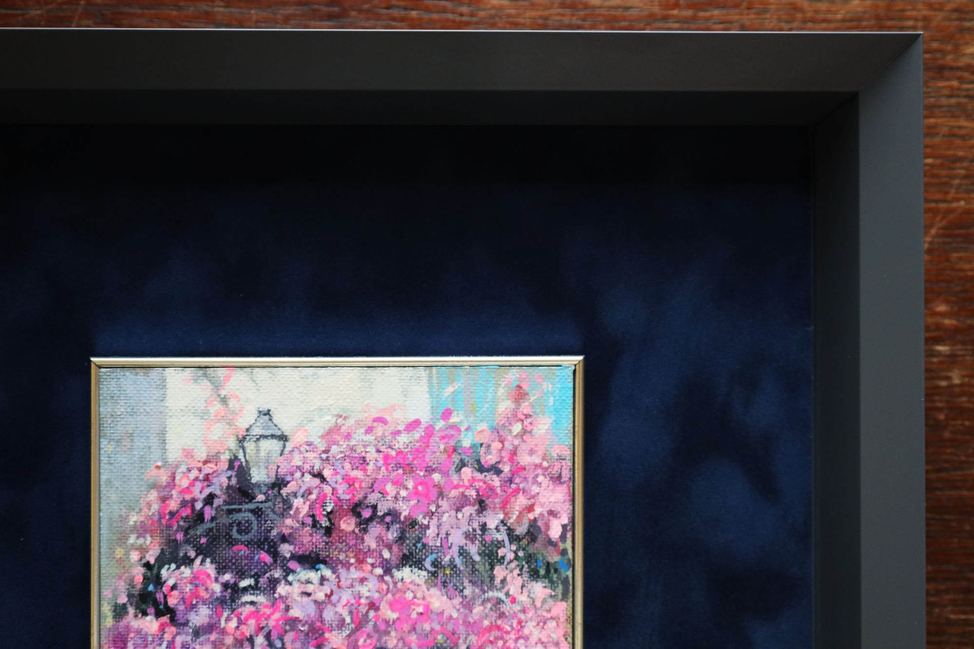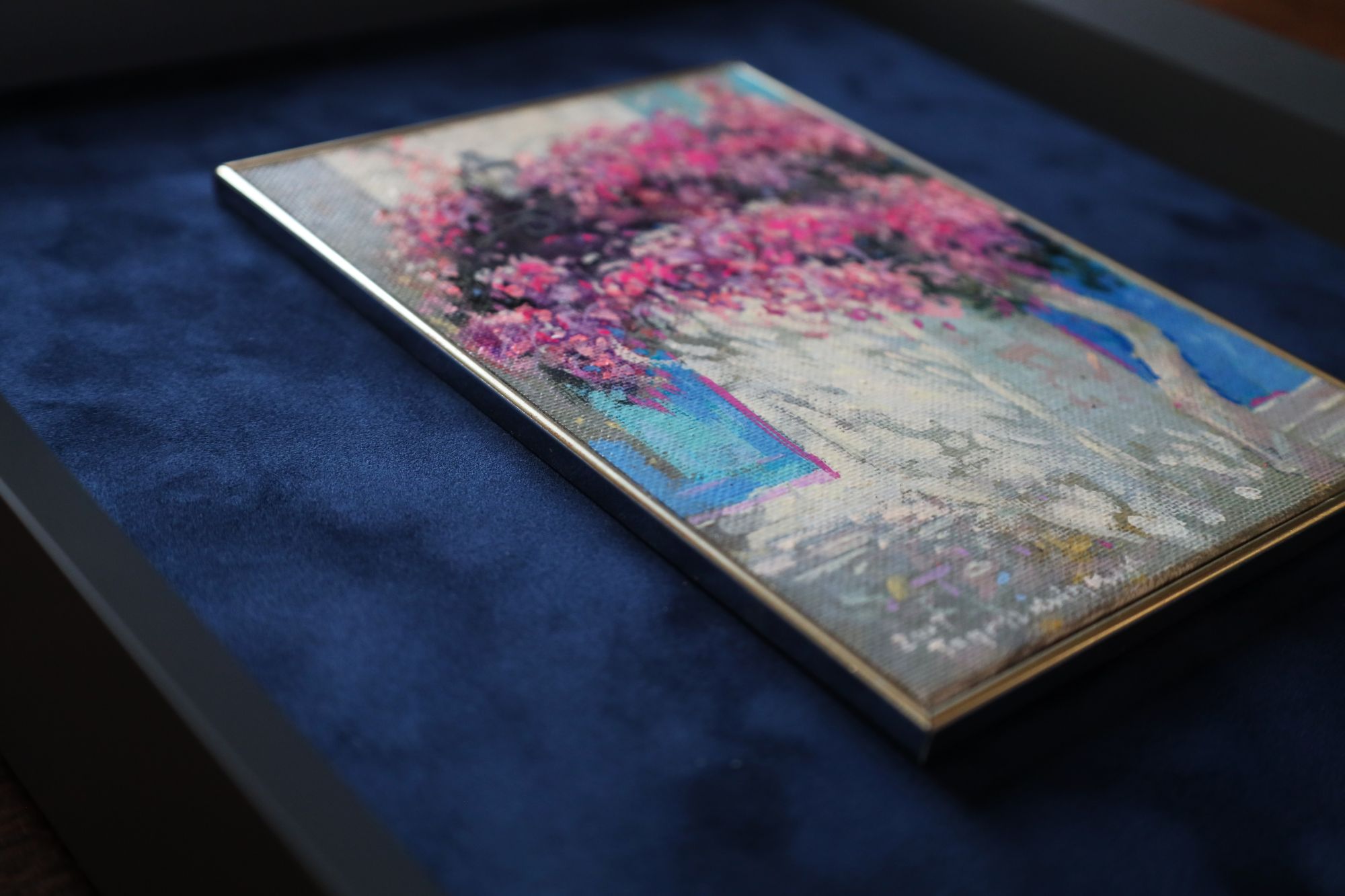Obraz akrylowy, ręcznie malowany przez artystę. Obraz przedstawia architekturę charaktersytyczną dla greckich wysp wraz z kwiecistą Bugenwillą. Obrazek jest oprawiony bardzo oryginalnie, zamknięty w srebrym slipie i wyeksoponowany na granatowym velurze. Całość zamknięta w grafitowej, matowej ramie. Obraz sprzedawany z oprawą.
