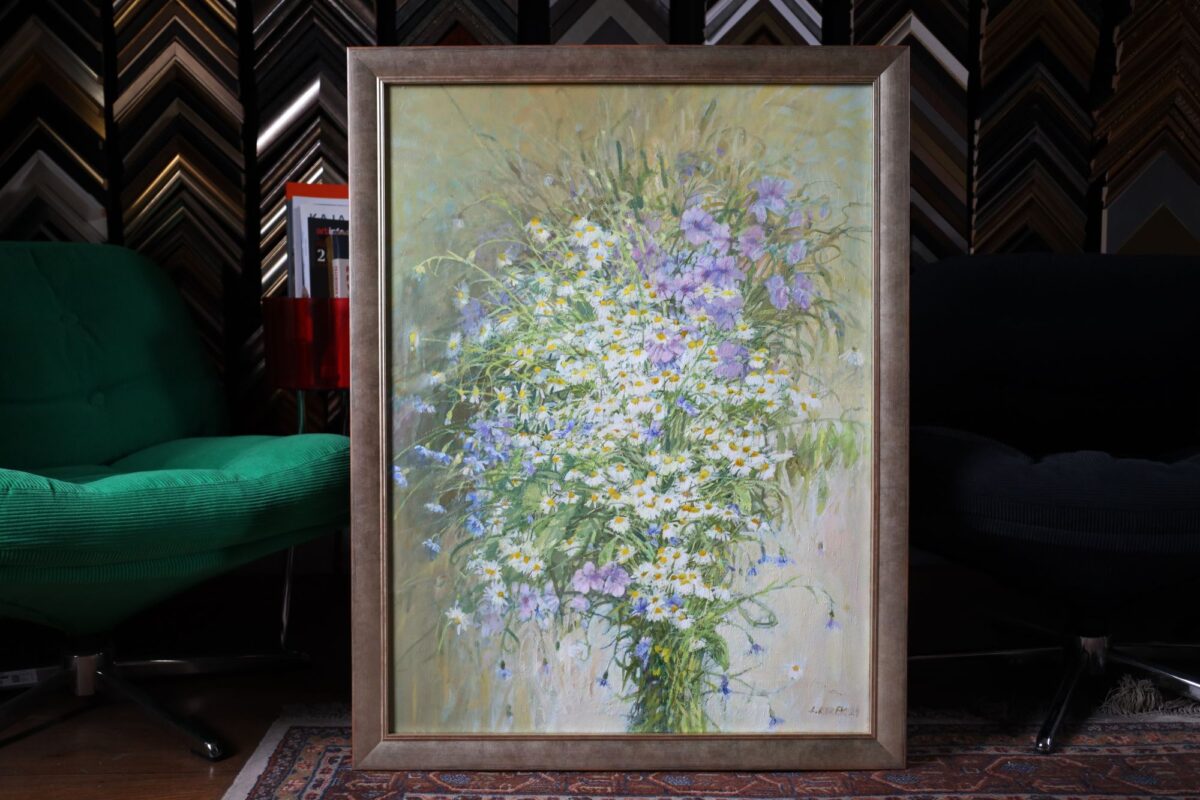 Obraz olejny na płótnie przedstawiający bukiet letnich kwiatów. Autorem jest Leszek Kurek, którego malarstwo charakteryzuje się niezwykłą subtelnością. Idealny do salonu lub sypialni. Obraz jest oprawiony w klasyczną, drewnianą ramę w kolorze szampańskiego złota ze srebrnym slipem wewnątrz.