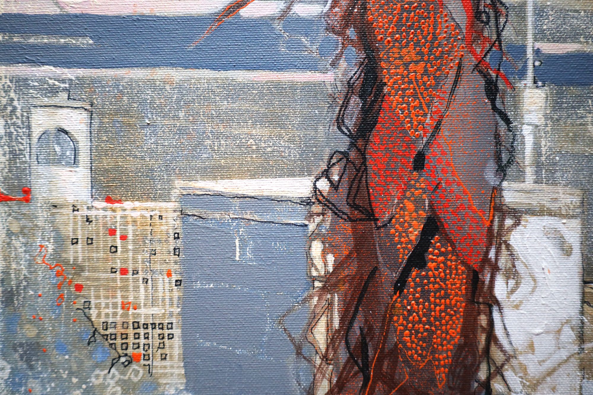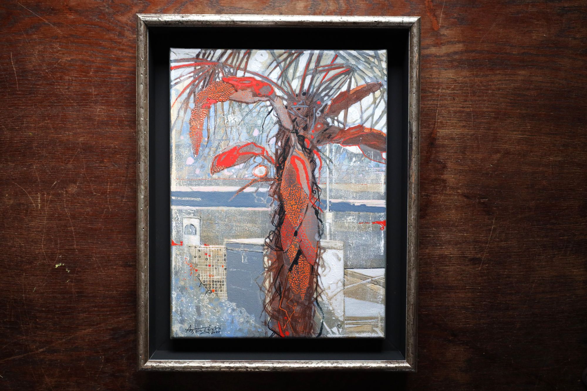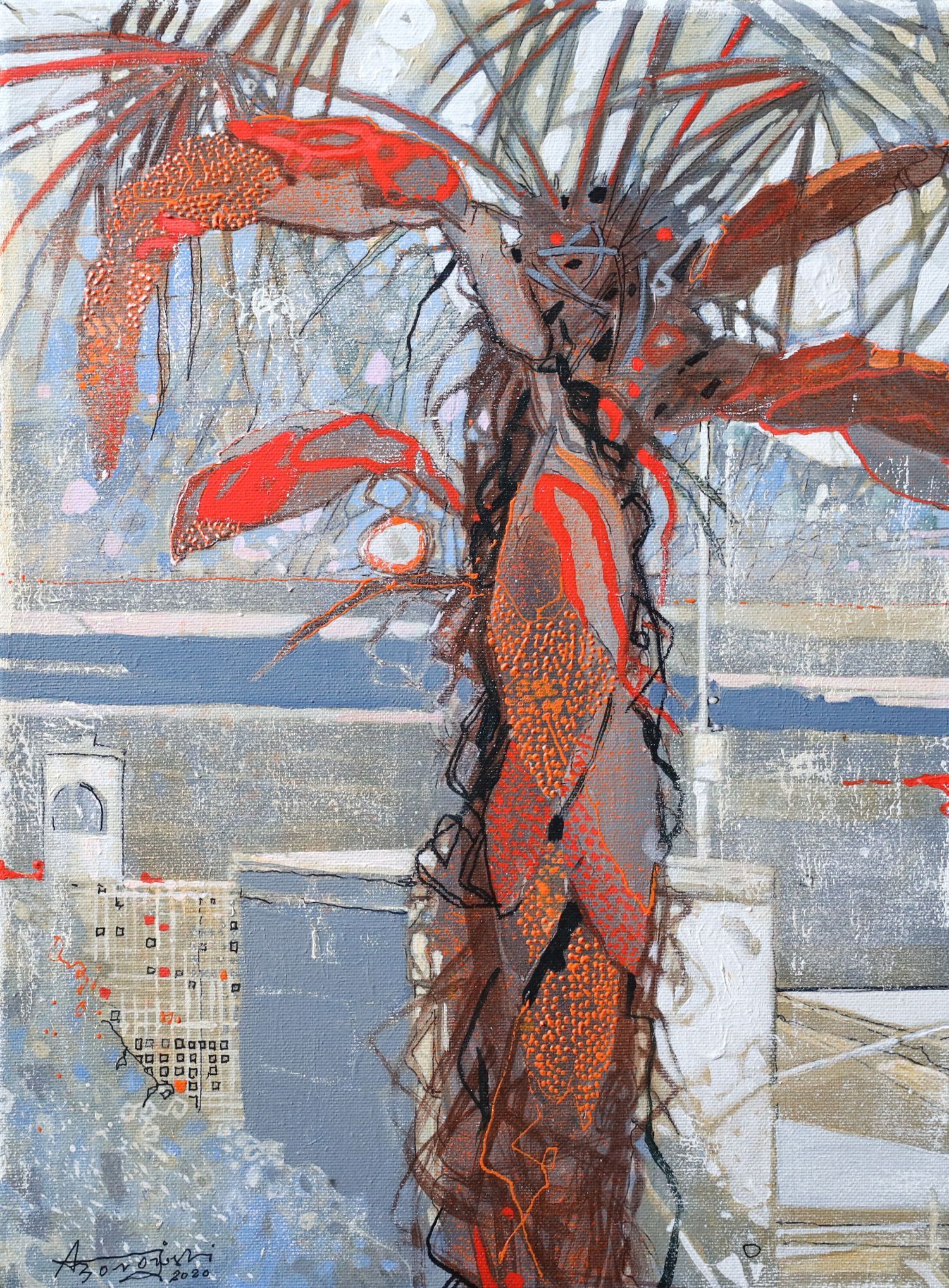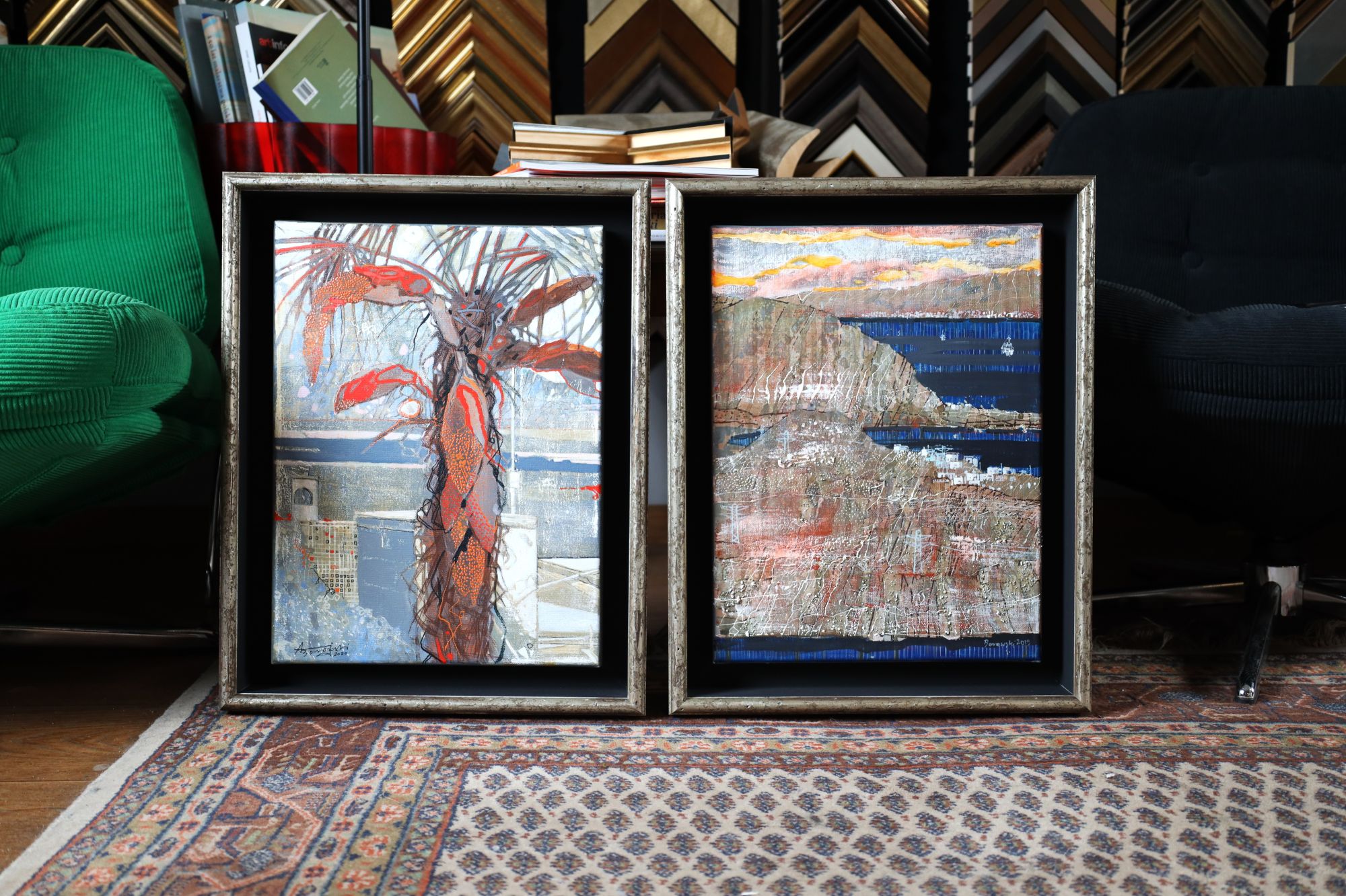 Obraz akrylowy na płótnie. Nowoczesny pejzaż. Obraz utrzymany w ciepłych kolorach. Oprawiony w wysokiej jakości ramę drewnianą typu american box, ręcznie wykończoną, wewnątrz czarna, matowa patyna, na zewnątrz płatkowana, postarzana.