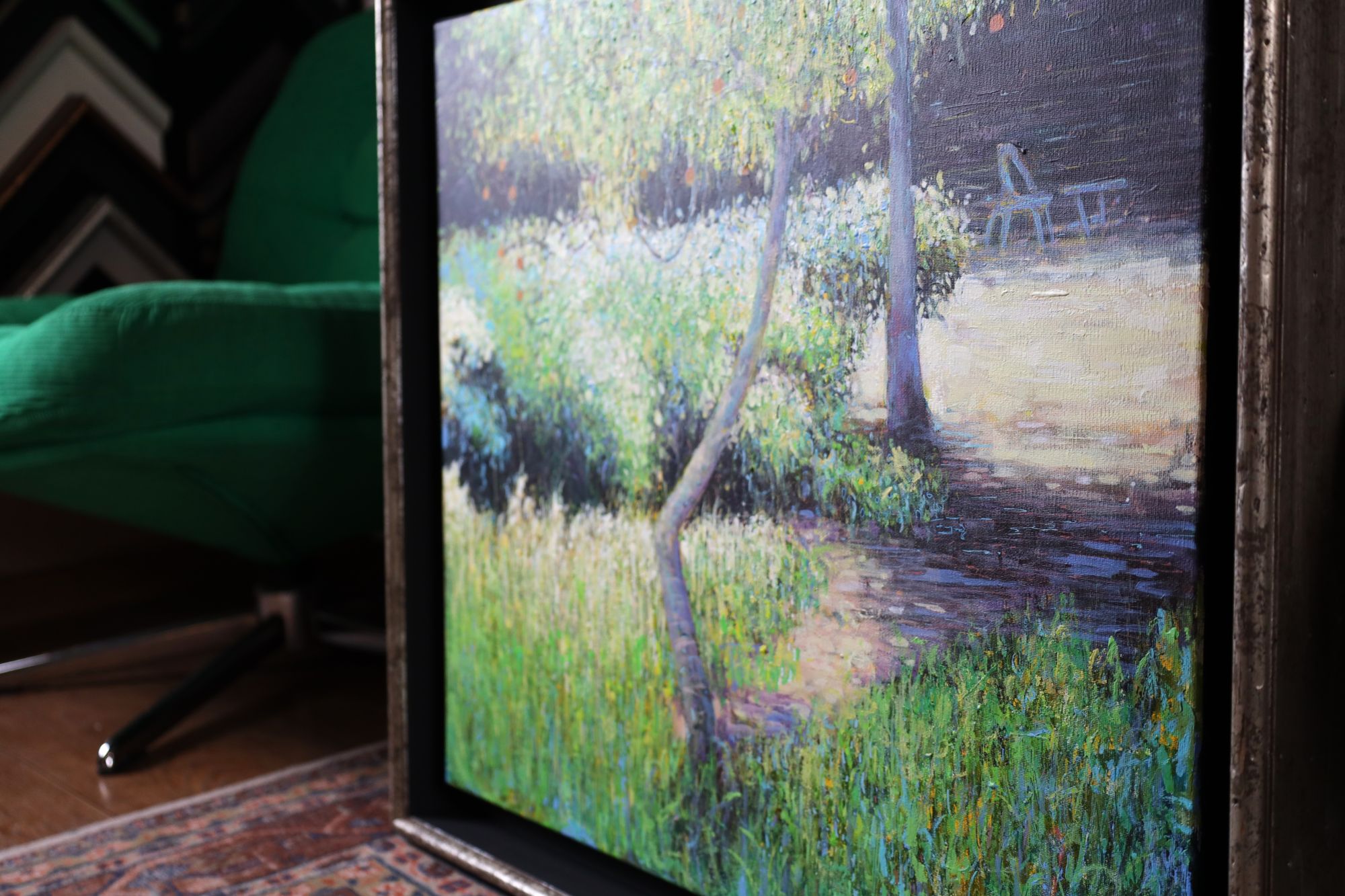 Obraz ręcznie malowany przez artystę. Nowoczesny obraz impresjonistyczny na płótnie. Obraz przedstawia fragment pięknego, tajemniczego ogrodu, utrzymany w ciepłych odcieniach zieleni, oprawiony w wysokiej jakości ramę drewnianą typu american box.