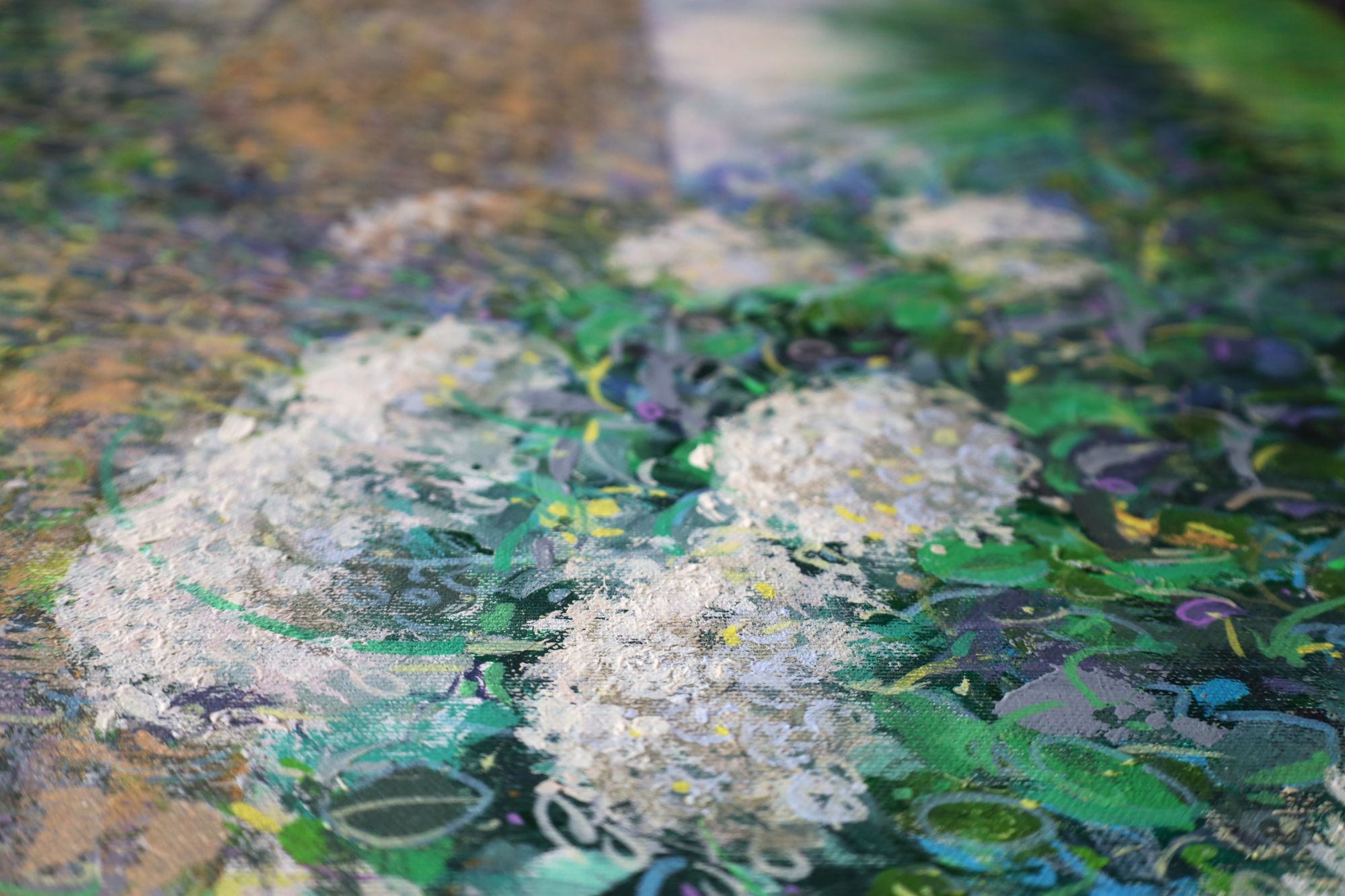 Obraz ręcznie malowany przez artystę. Nowoczesny obraz impresjonistyczny na płótnie. Obraz przedstawia fragment ogrodu, w którym największą rolę odgrywa światło. Artysta uchwycił słoneczny, ciepły dzień w ogrodzie pełnym różnych gatunków roślin. Wspaniały, pozytywny obraz dla miłośników natury.