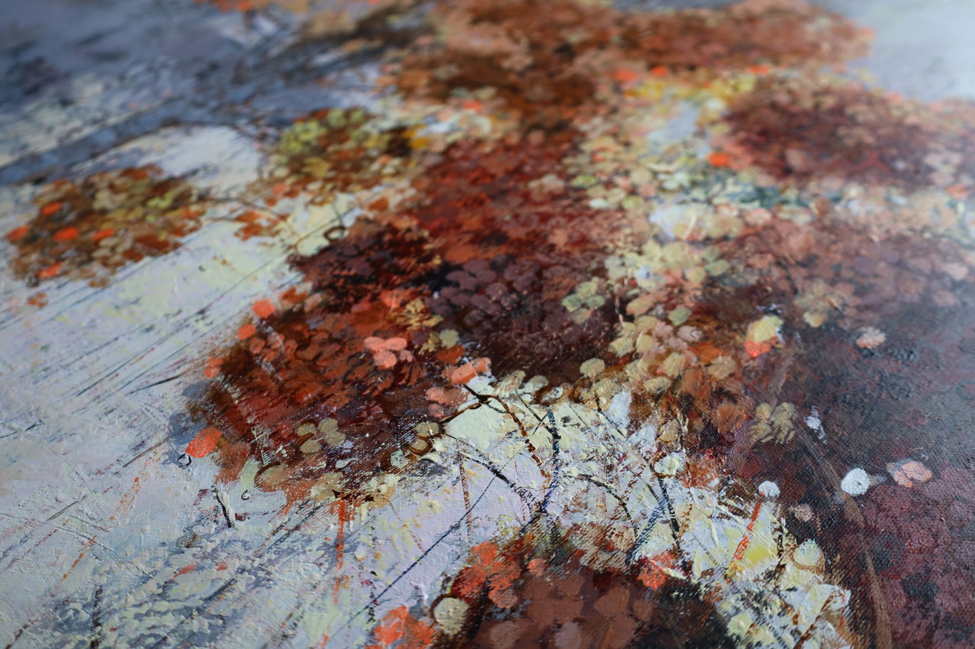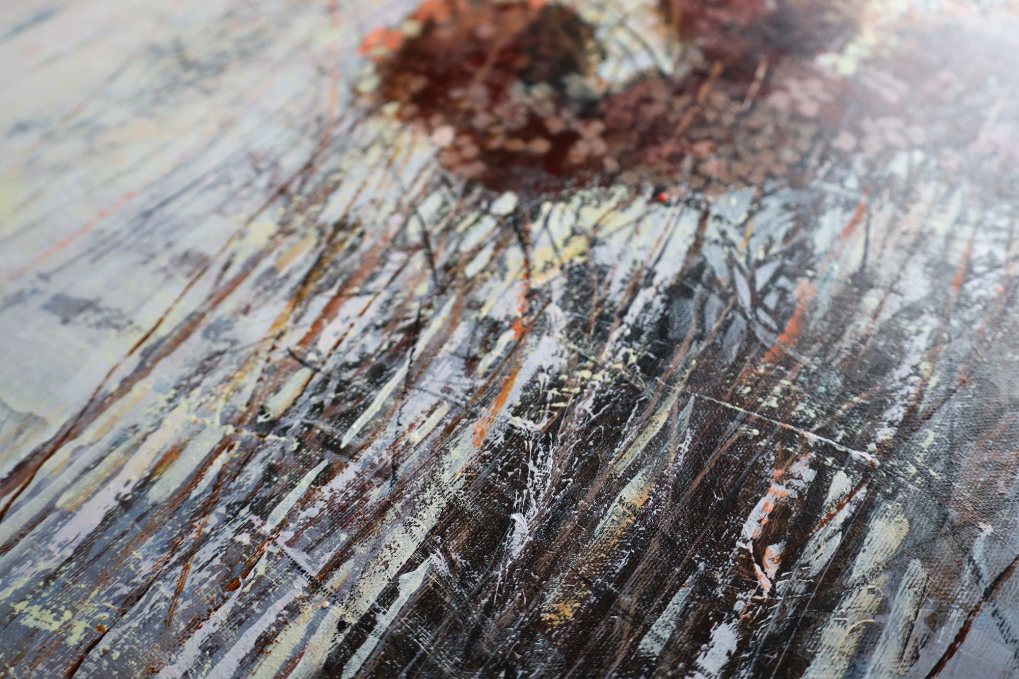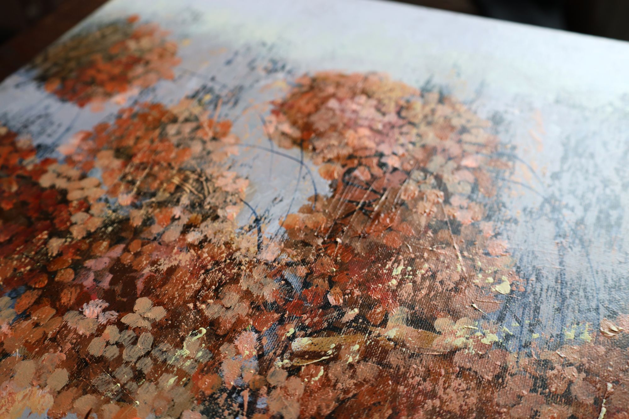 Obraz wykonany stylem impresjonistycznym, techniką akrylową, ręcznie malowany przez artystkę. Przedstawia krzew hortensji bukietowej w zimowej odsłonie. Duży format.
