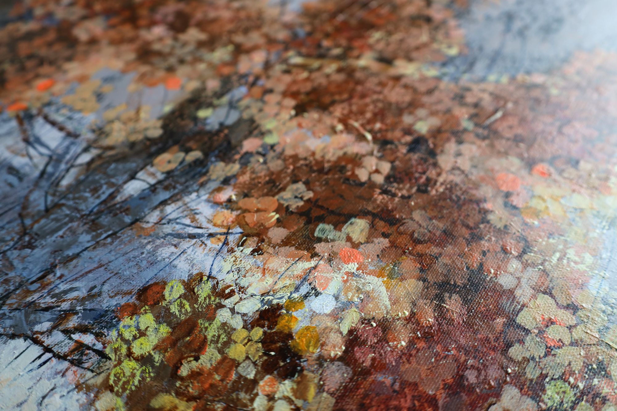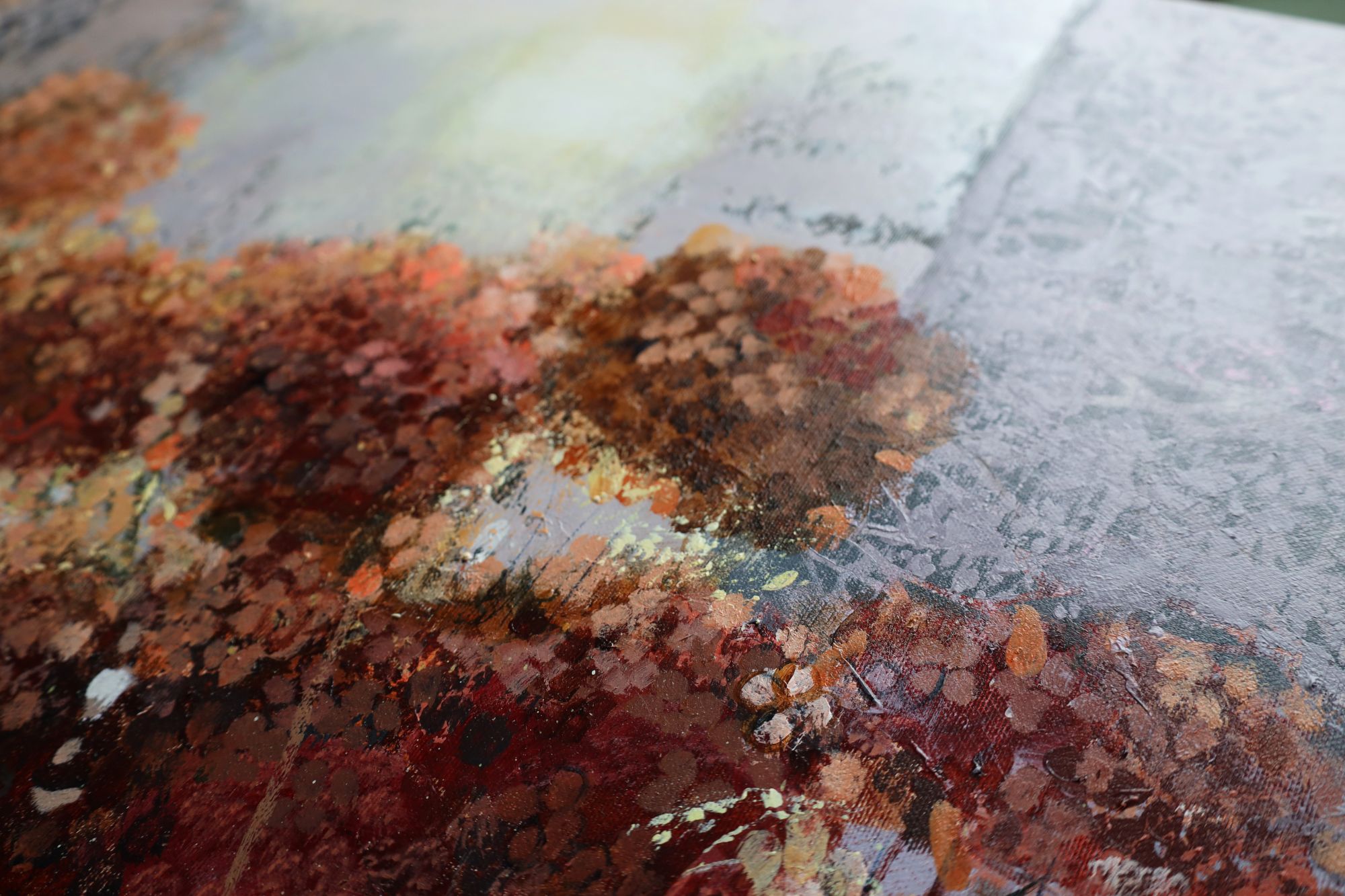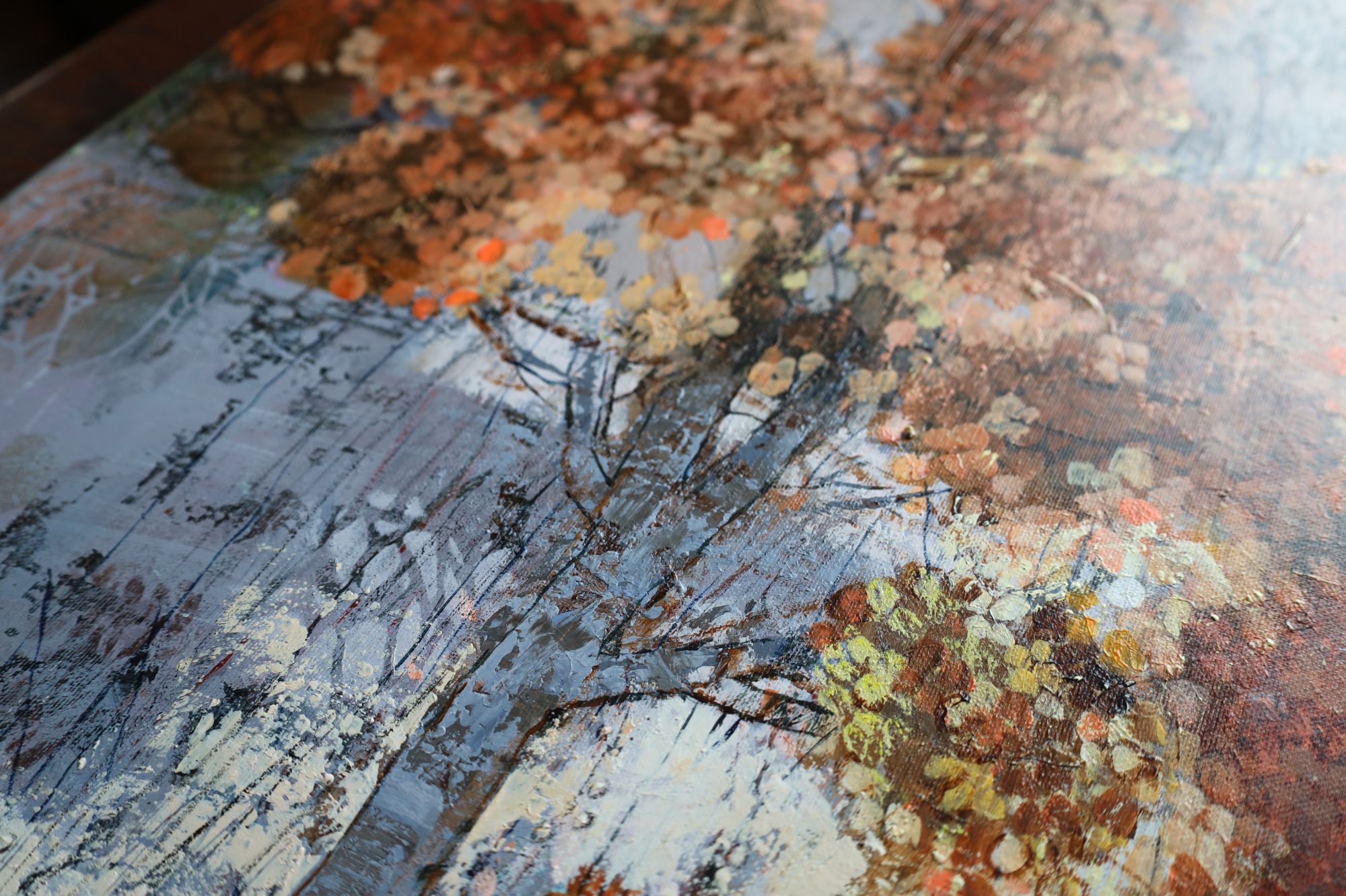 Obraz wykonany stylem impresjonistycznym, techniką akrylową, ręcznie malowany przez artystkę. Przedstawia krzew hortensji bukietowej w zimowej odsłonie. Duży format.