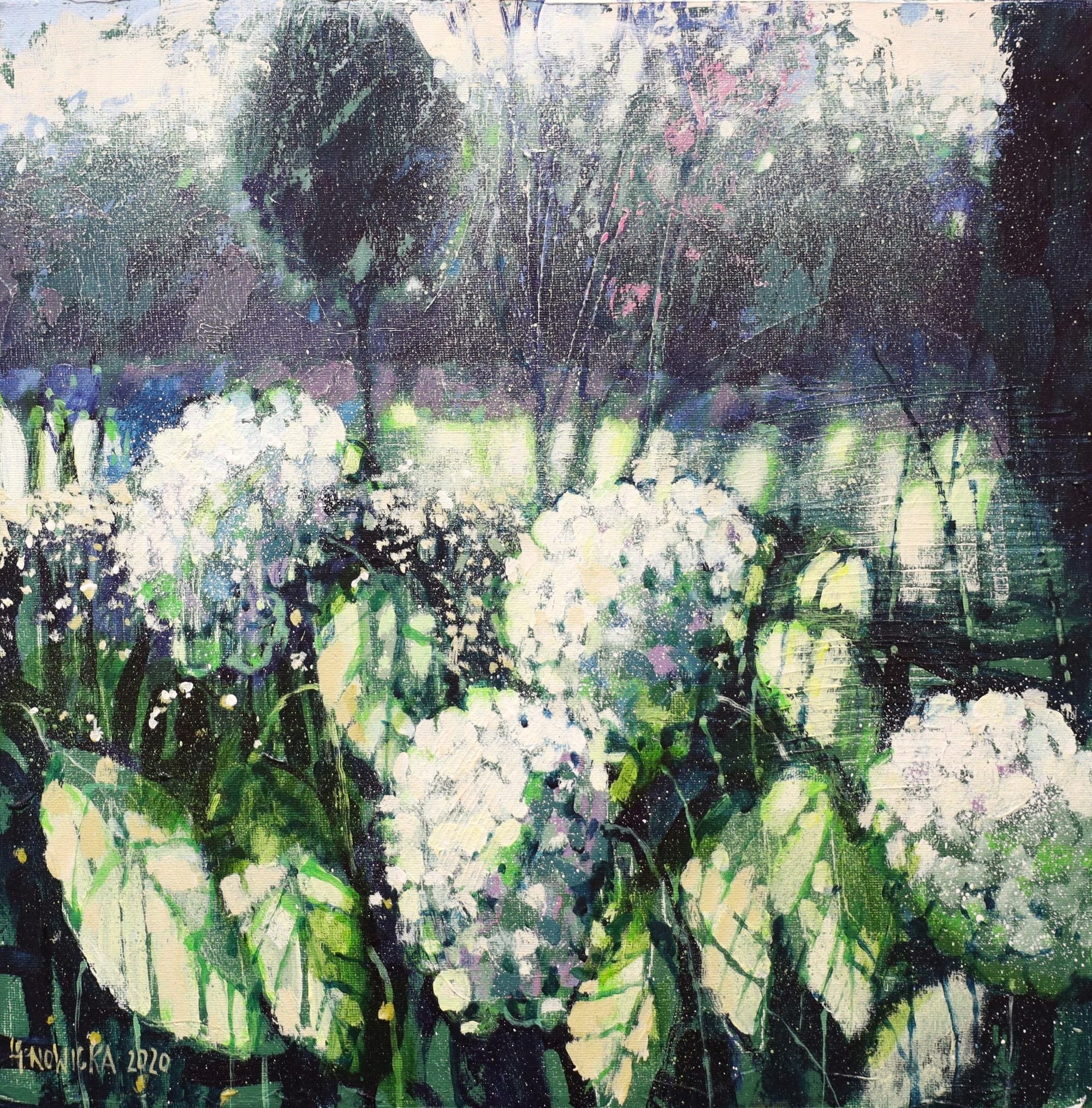 Obraz impresjonistyczny ręcznie malowany przez artystkę. Wykonany w technice akrylowej na płótnie. Obraz przedstawia kwiaty, hortensje.