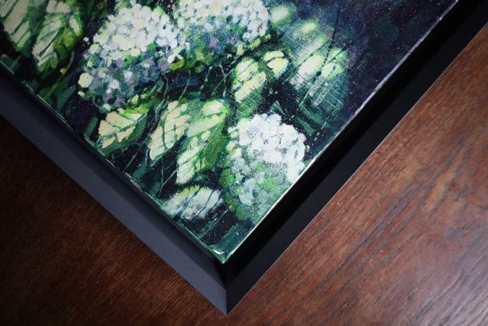 Obraz oprawiony w nowoczesną wysokiej jakości ramę drewnianą typu american box w kolorze grafitowym.