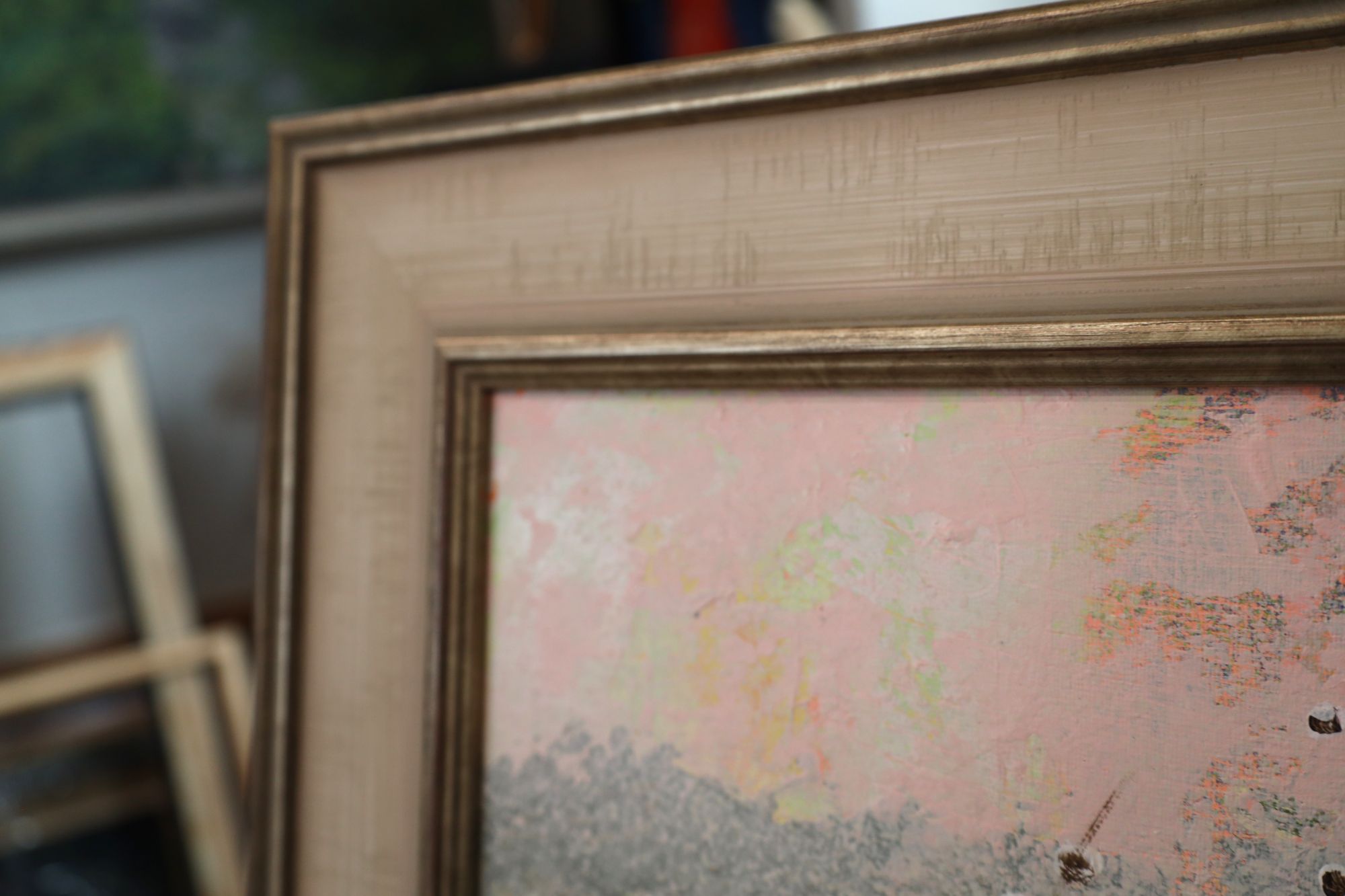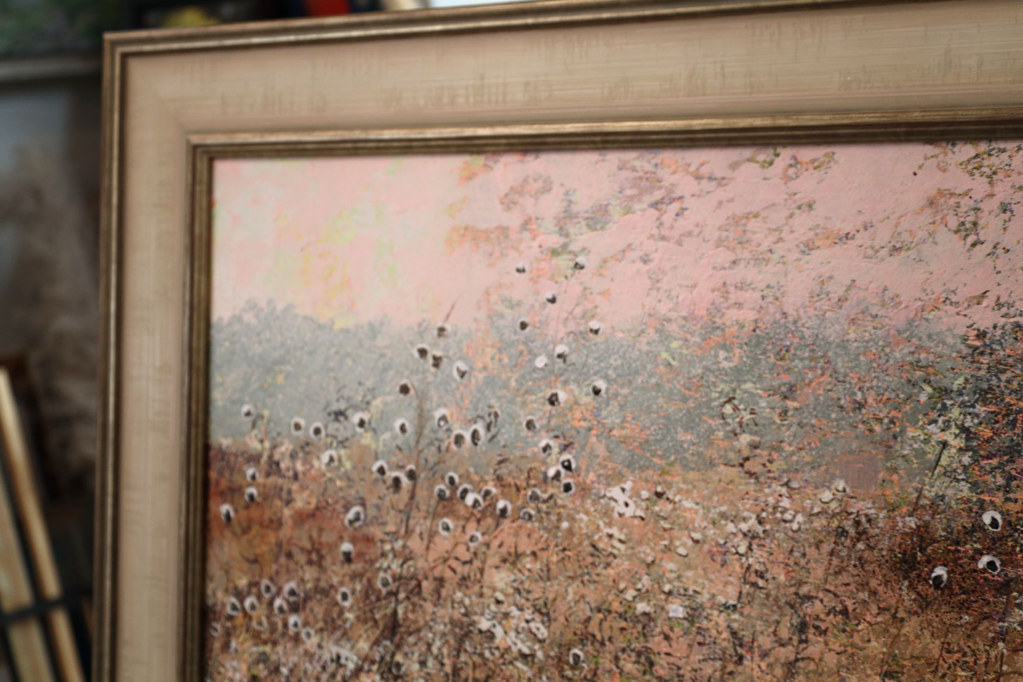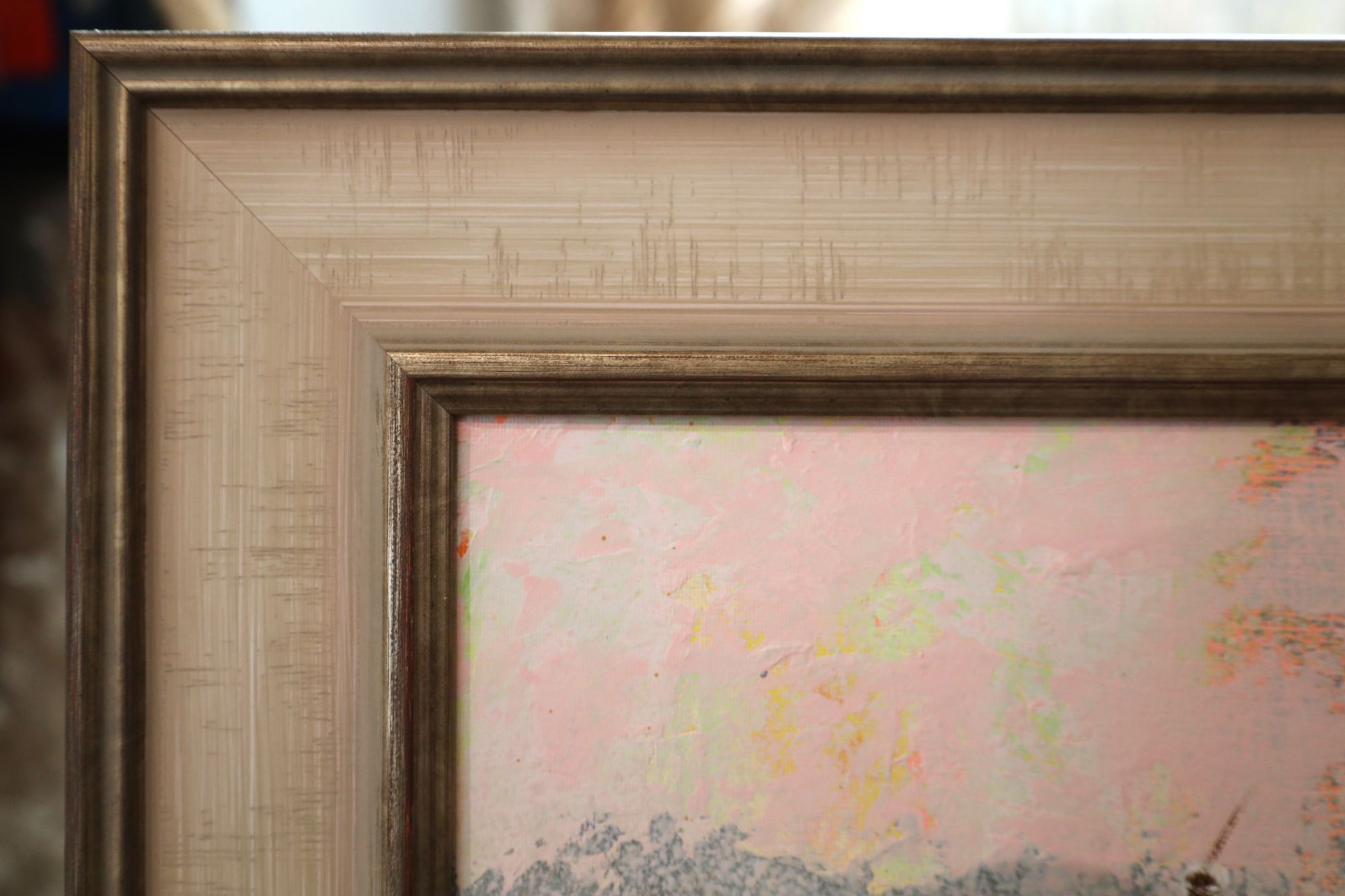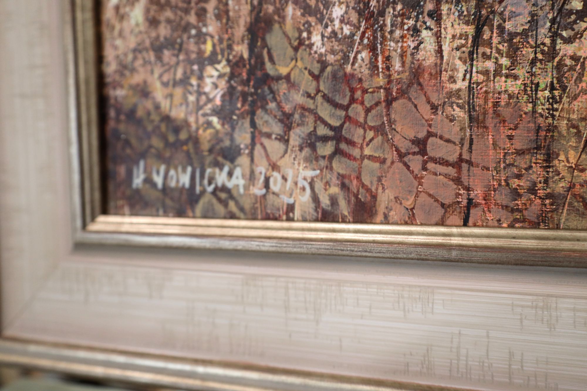 Obraz w stylu impresjonistycznym, przedstawiający jesienny pejzaż. Przyjemny obraz w jasnych, pastelowych kolorach. Obraz wykonany techniką akrylową na płótnie. Obraz jest oprawiony w szeroką, drewnianą ramę. Rama jest klasyczna w kolorze beżowym z przetarciami ciepłego srebra.