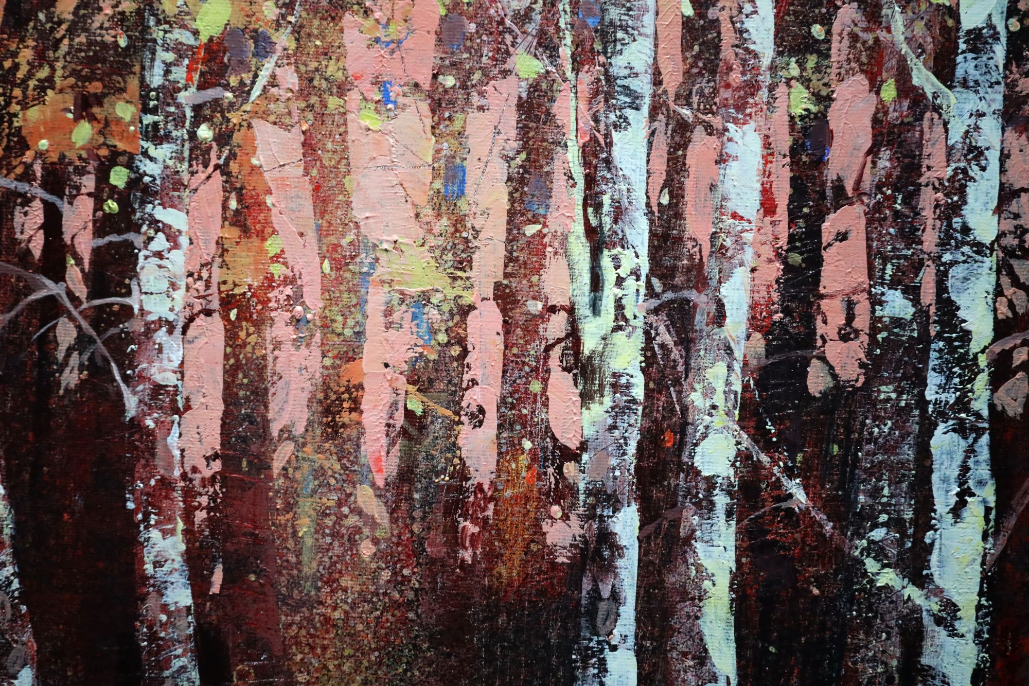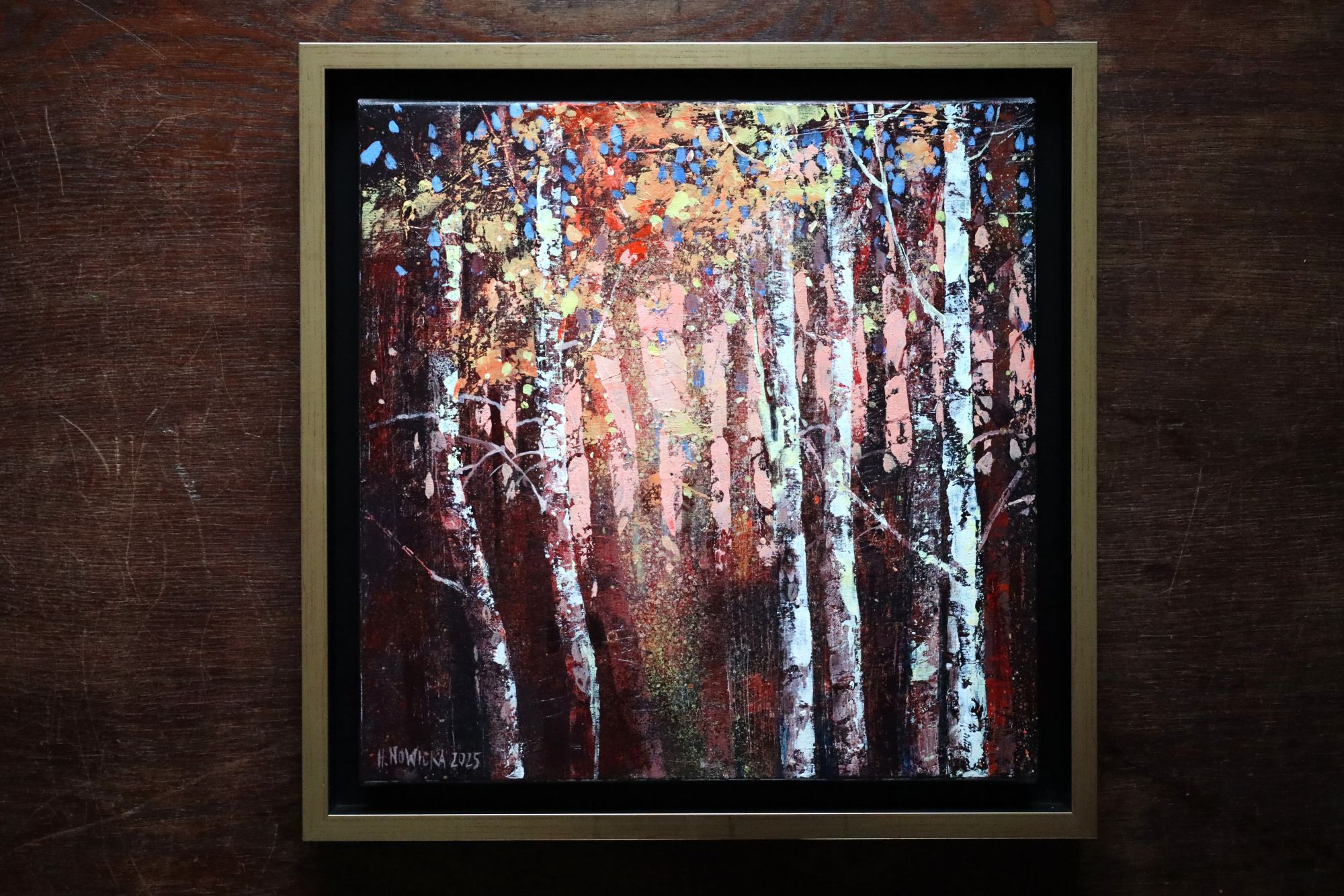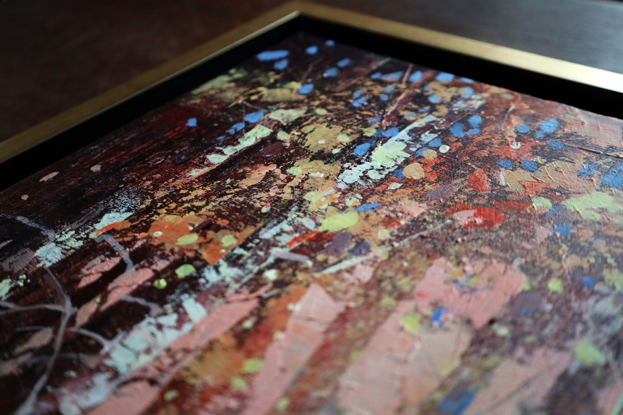 Obraz w stylu impresjonistycznym, przedstawiający jesienny pejzaż. Utrzymany w intensywnych, energetyzujących kolorach brązu i pomarańczy. Piękna, złota, polska jesień.
