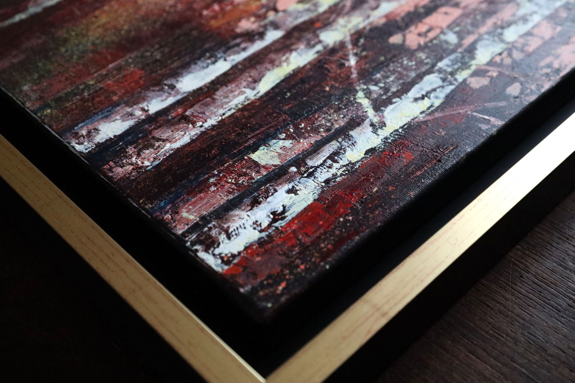 Obraz jest oprawiony w drewnianą ramę typu american box ze złotym wykończeniem, wnętrze i bok czarny mat. Obraz jest sprzedawany w oprawie.