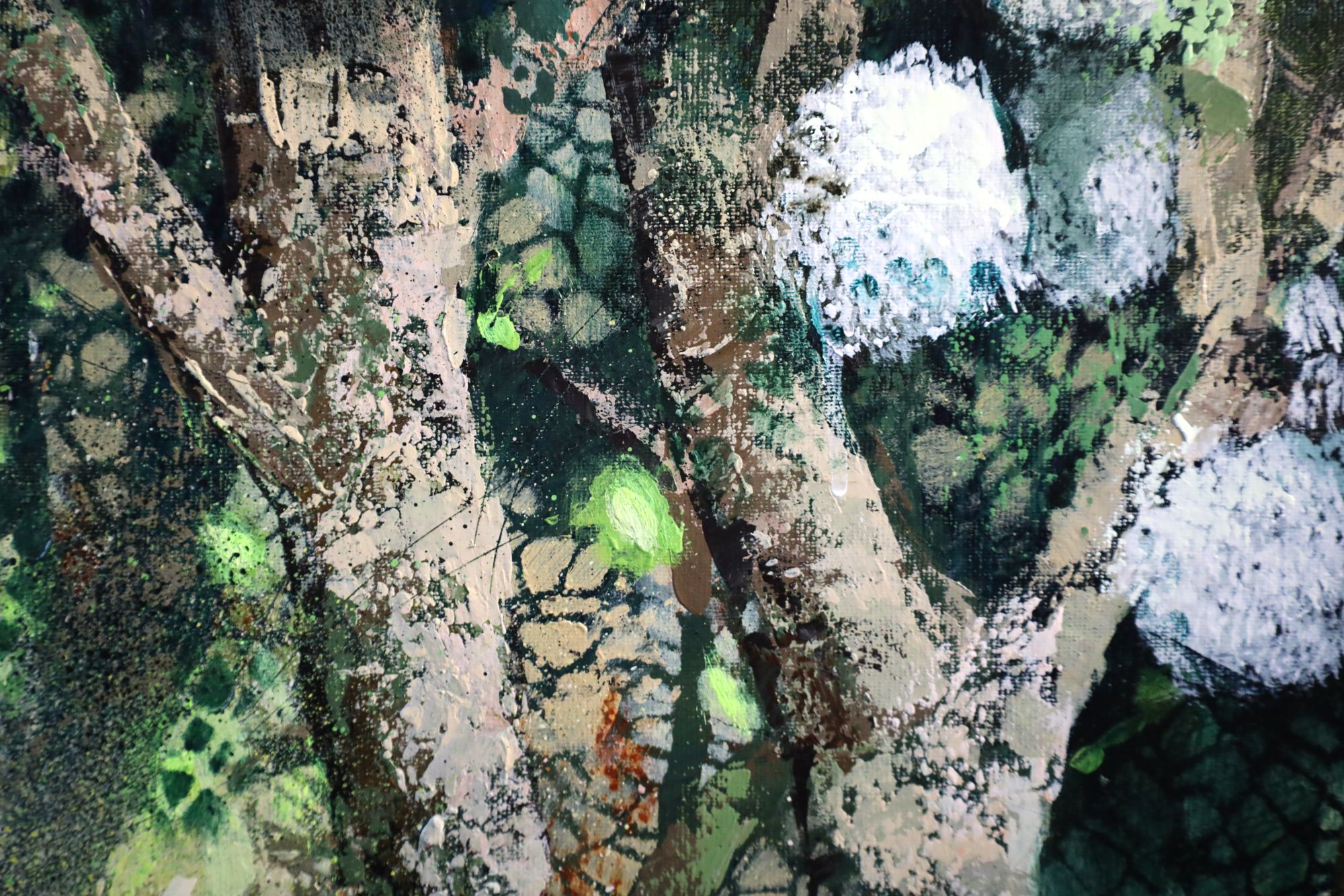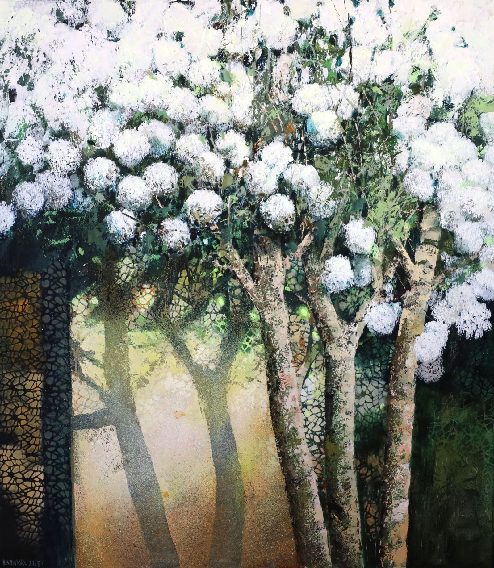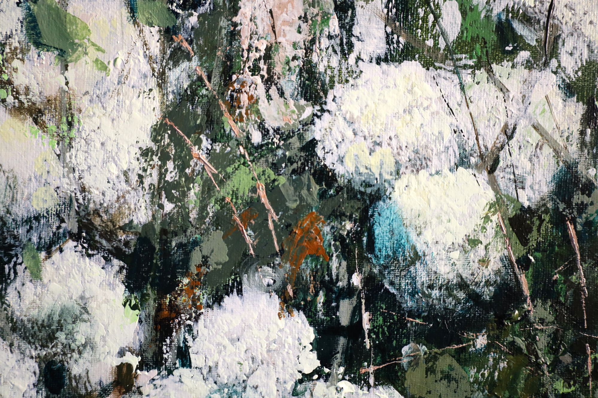 Obraz w stylu impresjonistycznym, przedstawiający krzew a właściwie drzewko kaliny koralowej w porze kwitnienia. Utrzymany w przyjemnych, energetycznych kolorach. Obraz wprowadza w pozytwyny, wiosenny klimat. Jeden z ulubionych motywów artystki. Obraz bardzo nowoczesny, wykonany techniką akrylową na płótnie. Idealny do salonu. Duży format.