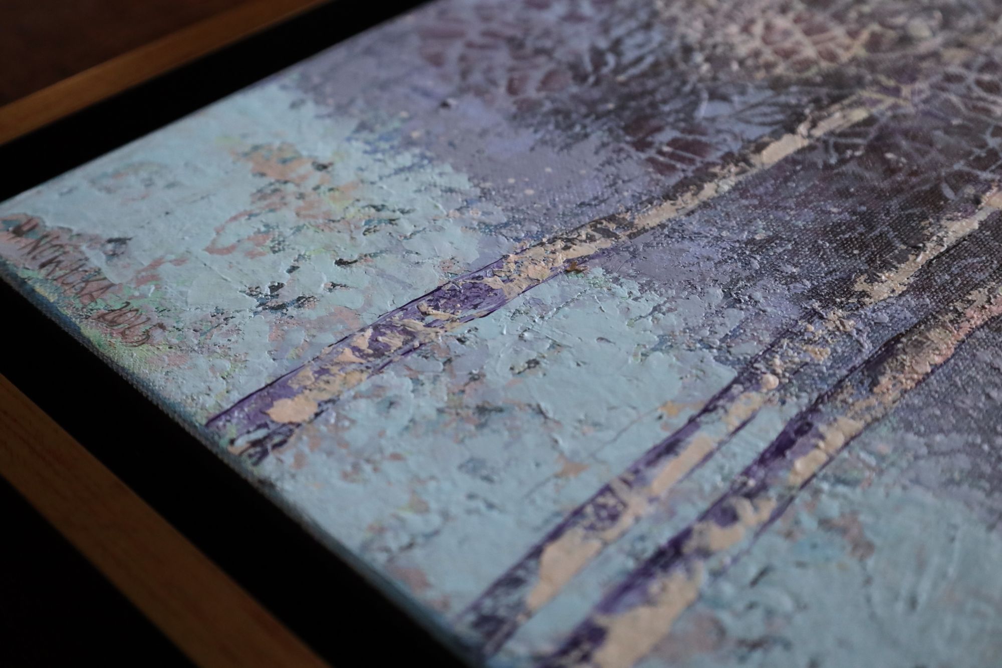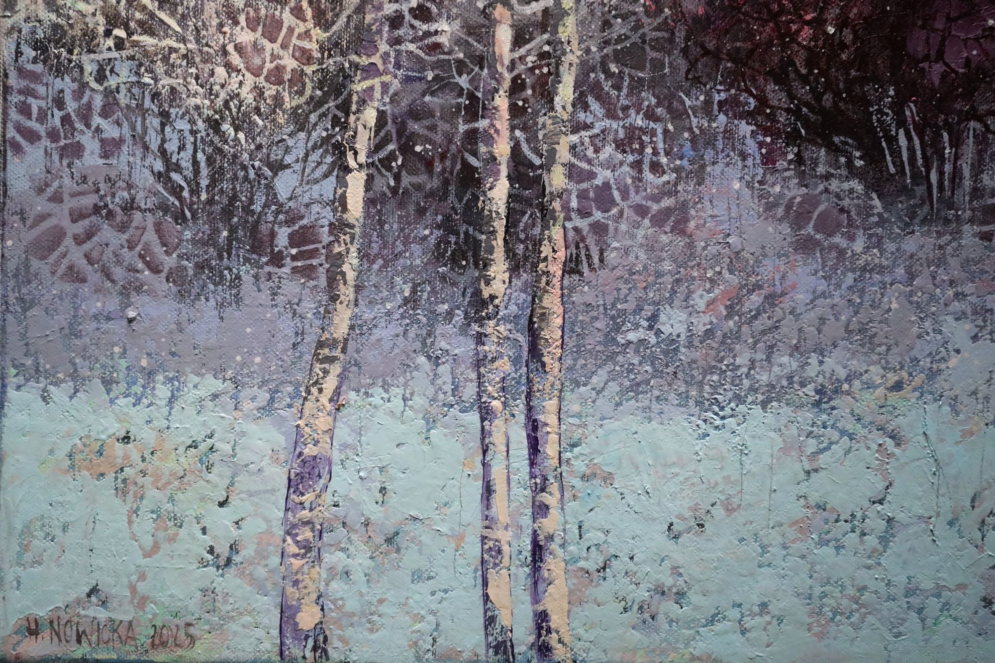 Obraz w stylu impresjonistycznym, przedstawiający zimowy pejzaż. Utrzymany w przyjemnych, jasnych, pastelowych kolorach. Obraz bardzo nowoczesny, wykonany techniką akrylową na płótnie. Średni format.