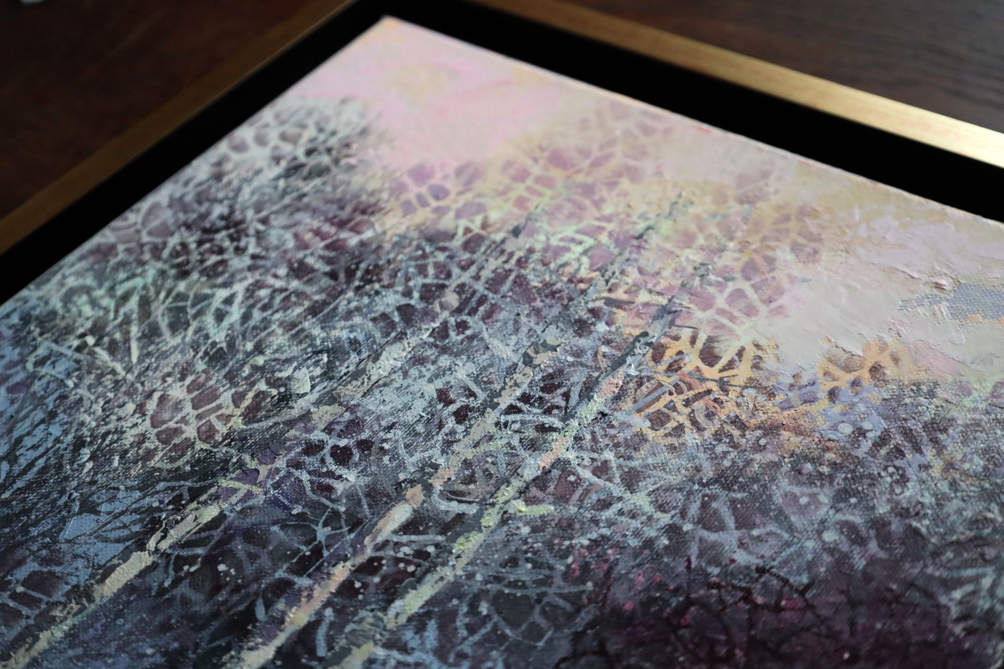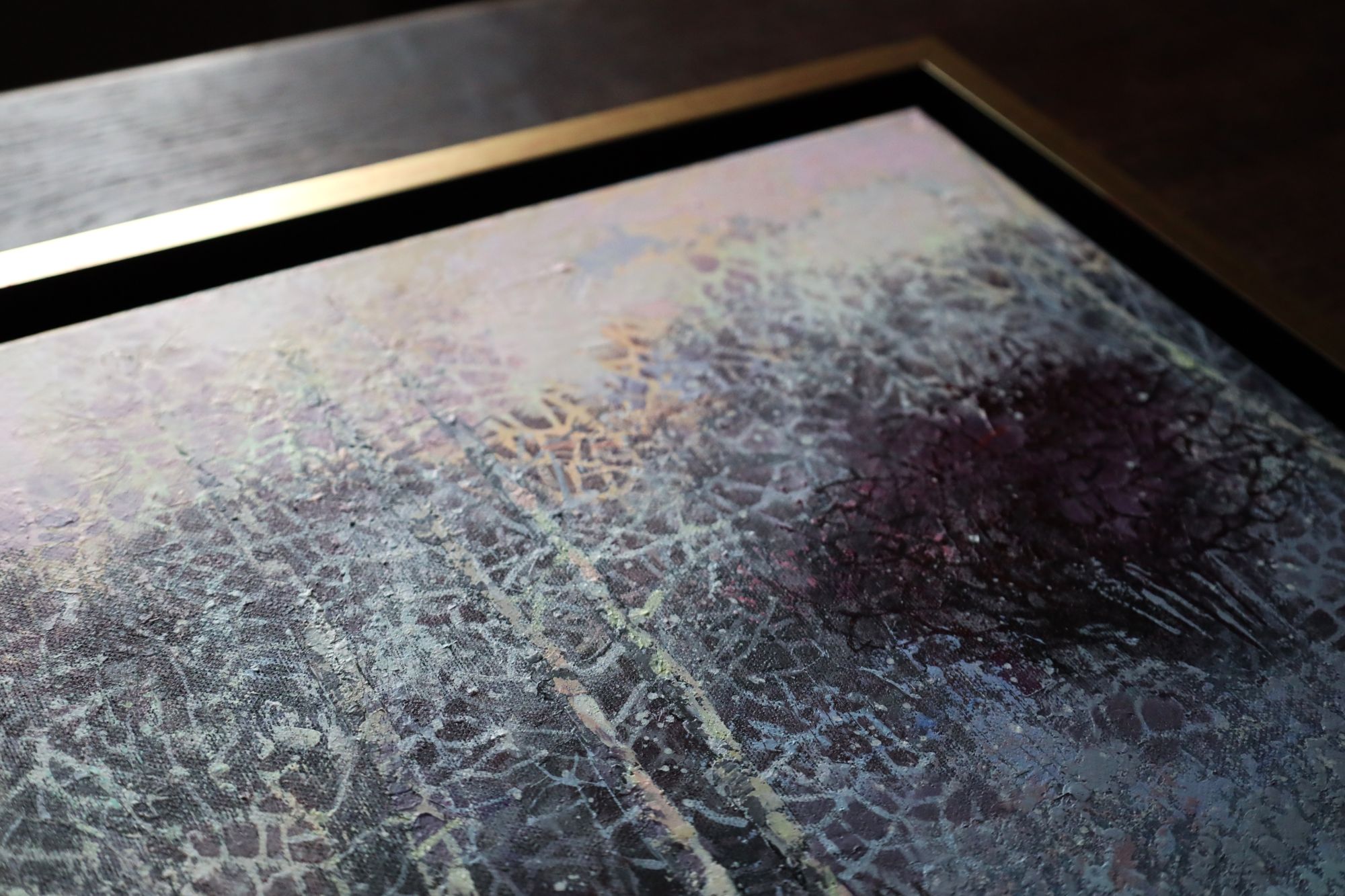 Obraz jest oprawiony w drewnianą ramę typu american box ze złotym wykończeniem, wnętrze i bok czarny mat. Obraz jest sprzedawany w oprawie.