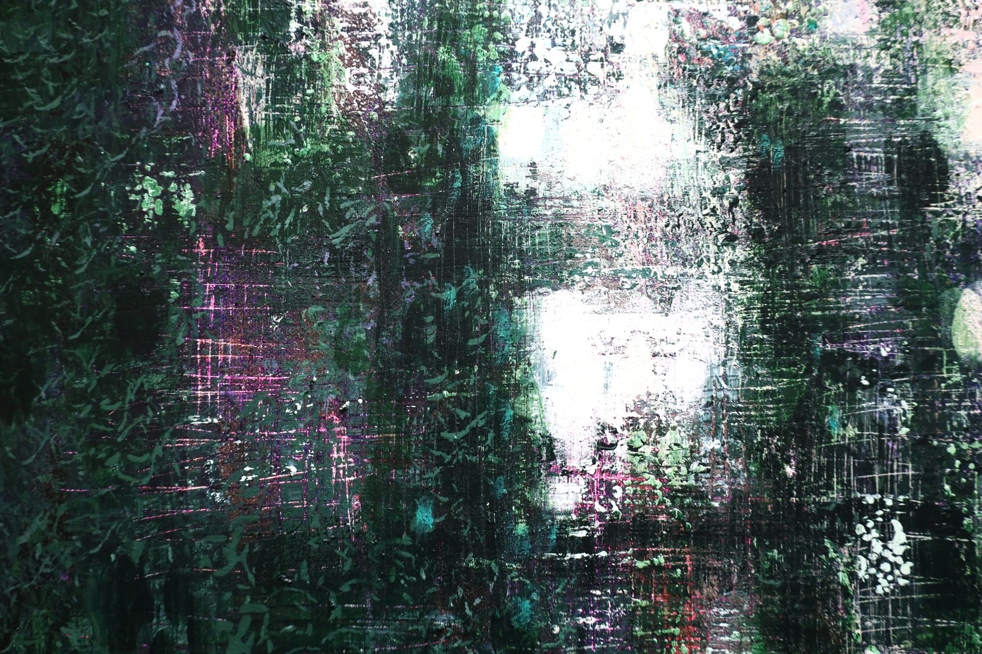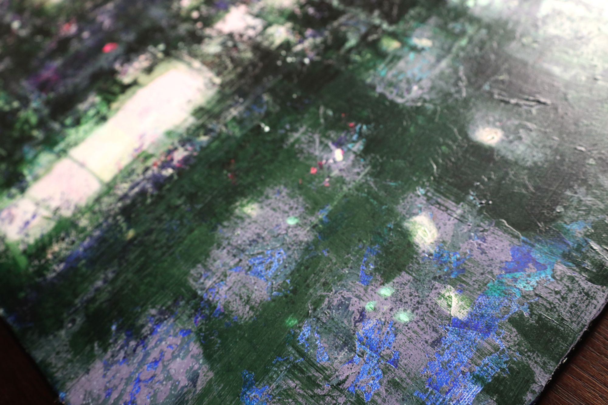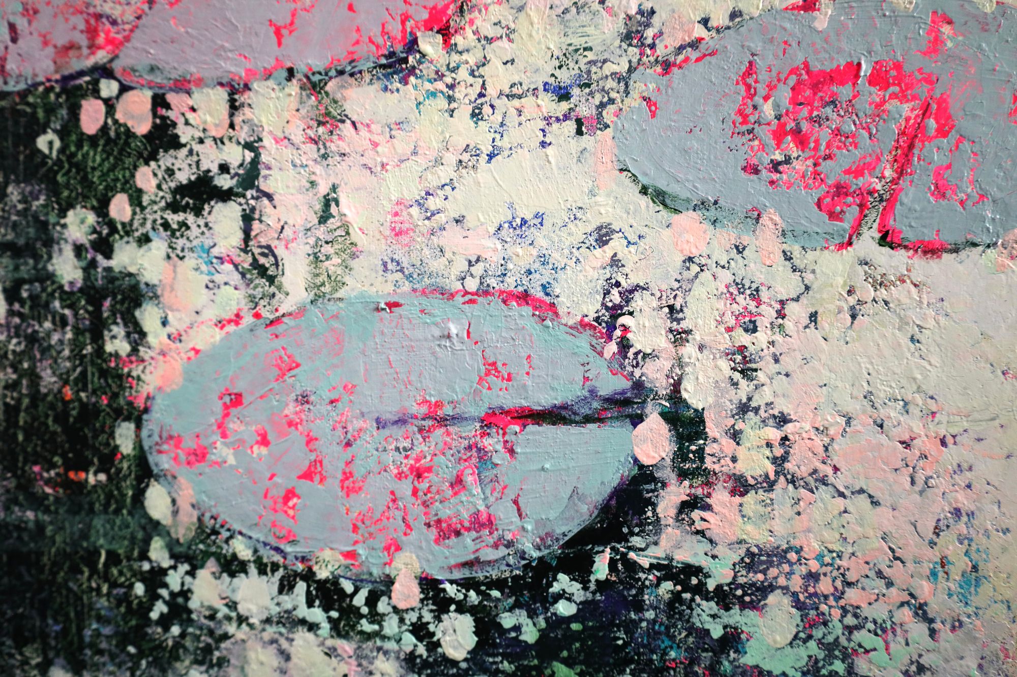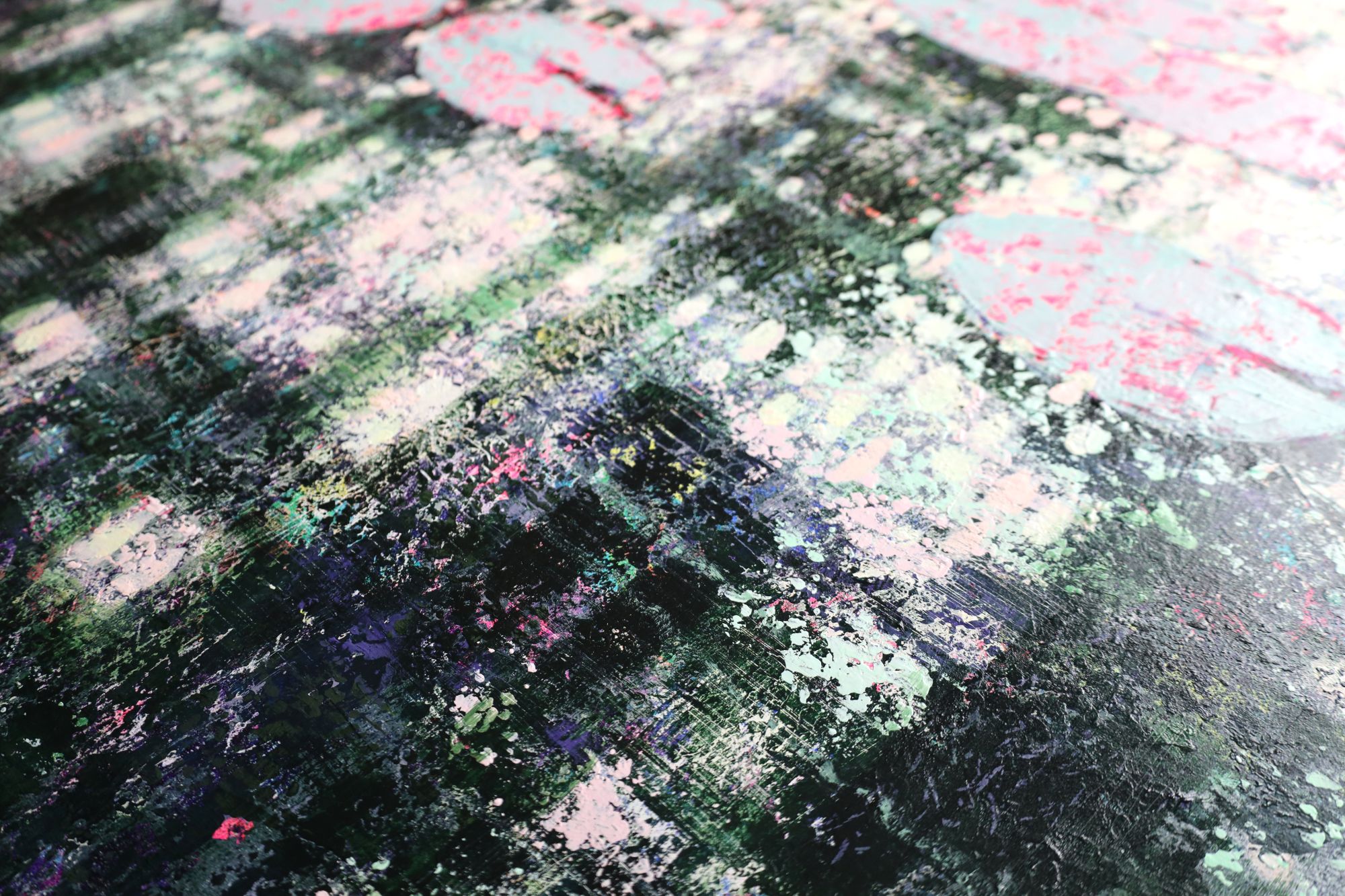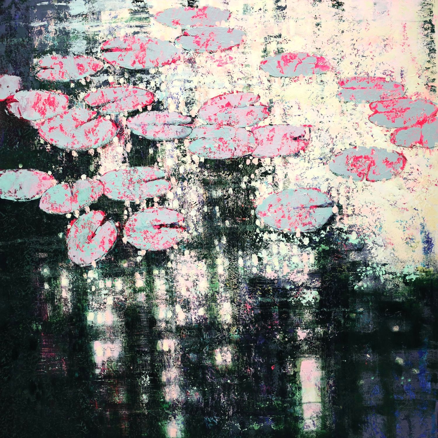 Obraz w stylu impresjonistycznym, przedstawiający liście na wodzie tańczące wśród refleksów światła. Obraz bardzo nowoczesny, wykonany techniką akrylową na płótnie. Duży format.