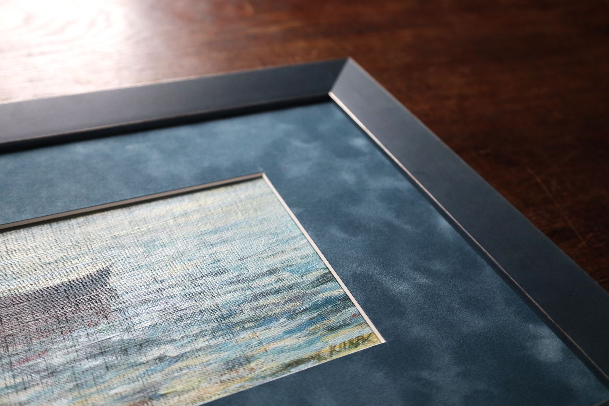Obraz jest sprzedawany w oprawie. Obraz oprawiony w wysokiej jakości ramę drewnianą w kolorze granatowym oraz niebieskie, welurowe passepartout.