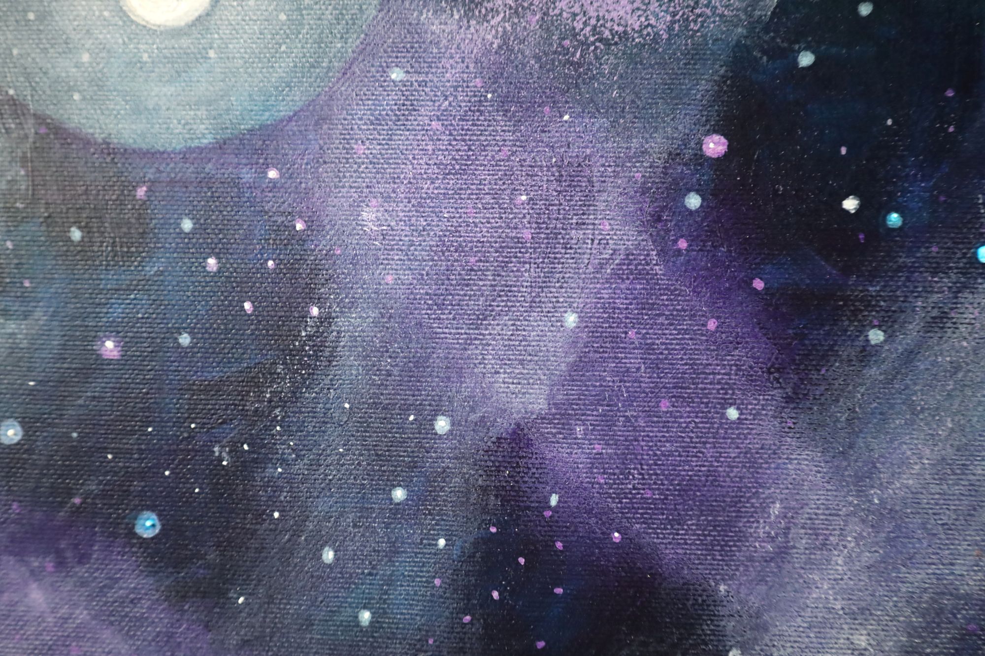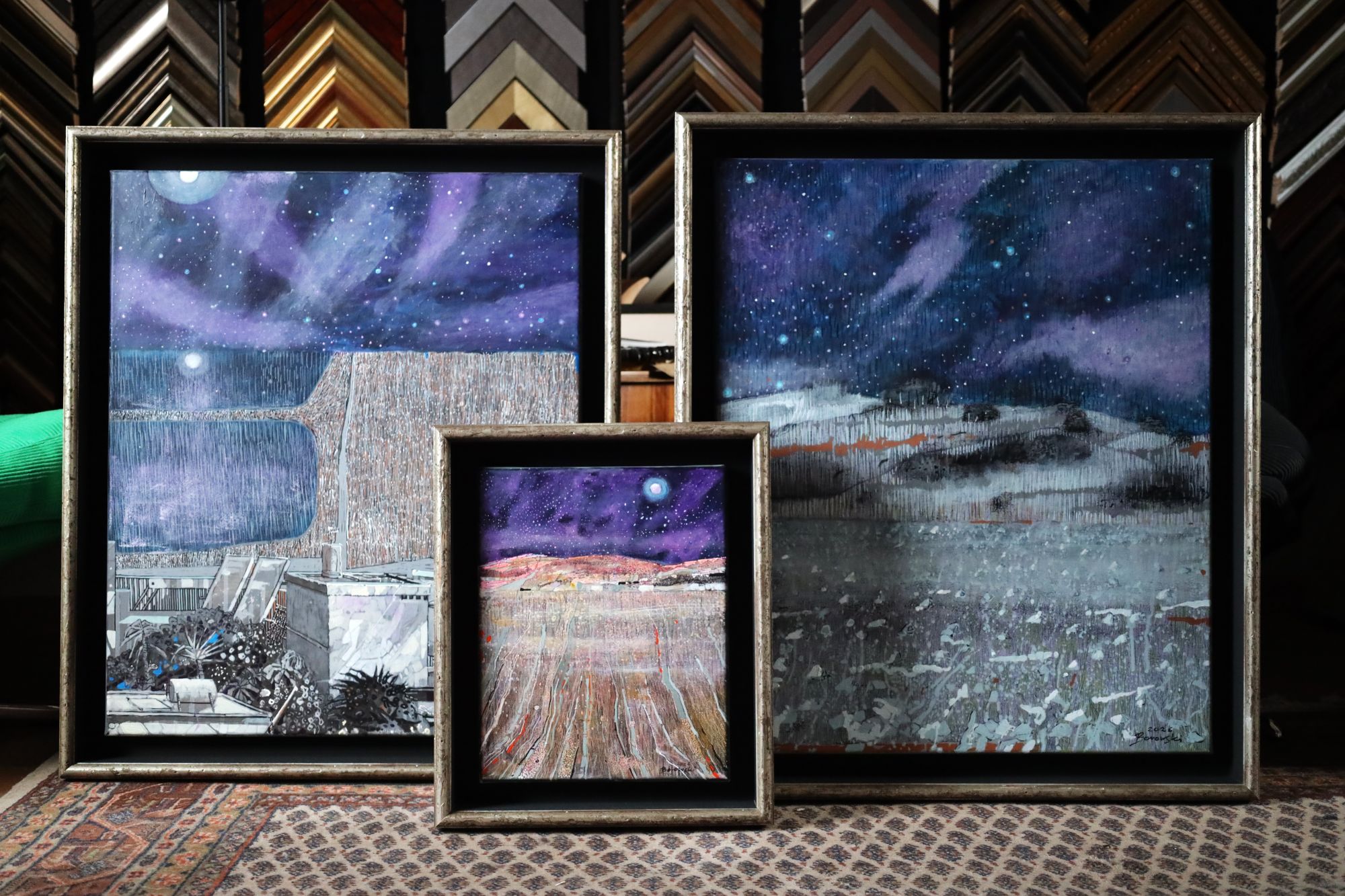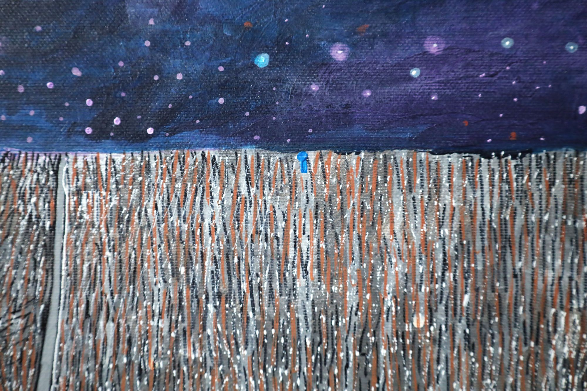 Obraz akrylowy na płótnie. Nowoczesny pejzaż z charakterystycznym nocnym, gwieździstym niebem. Obraz utrzymany w piękych kolorach. Oprawiony w wysokiej jakości ramę drewnianą typu american box, ręcznie wykończoną, wewątrz czarna, matowa patyna, za zewnątrz płatkowana, postarzana.