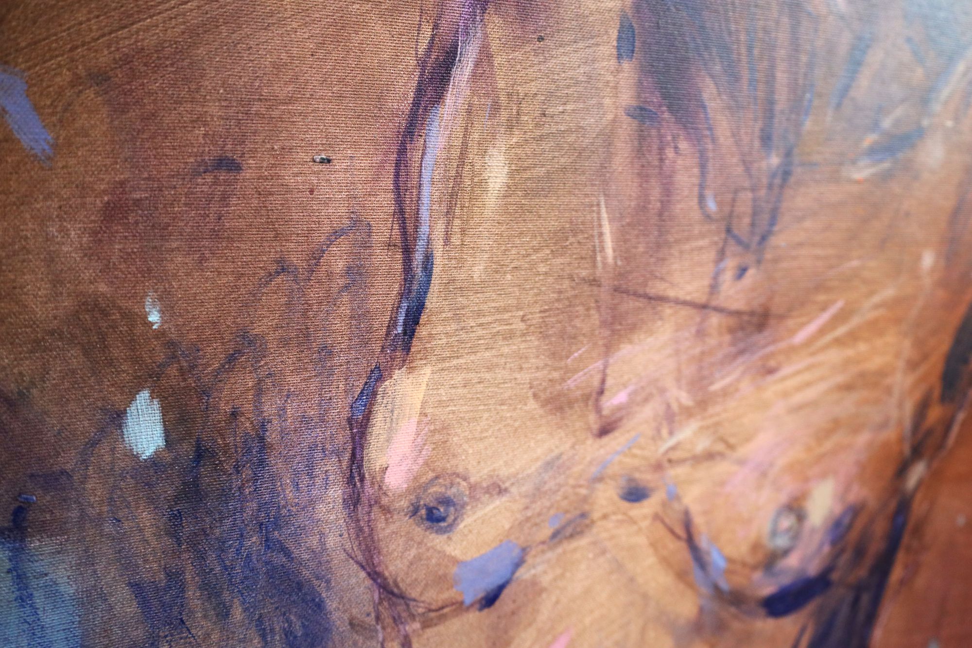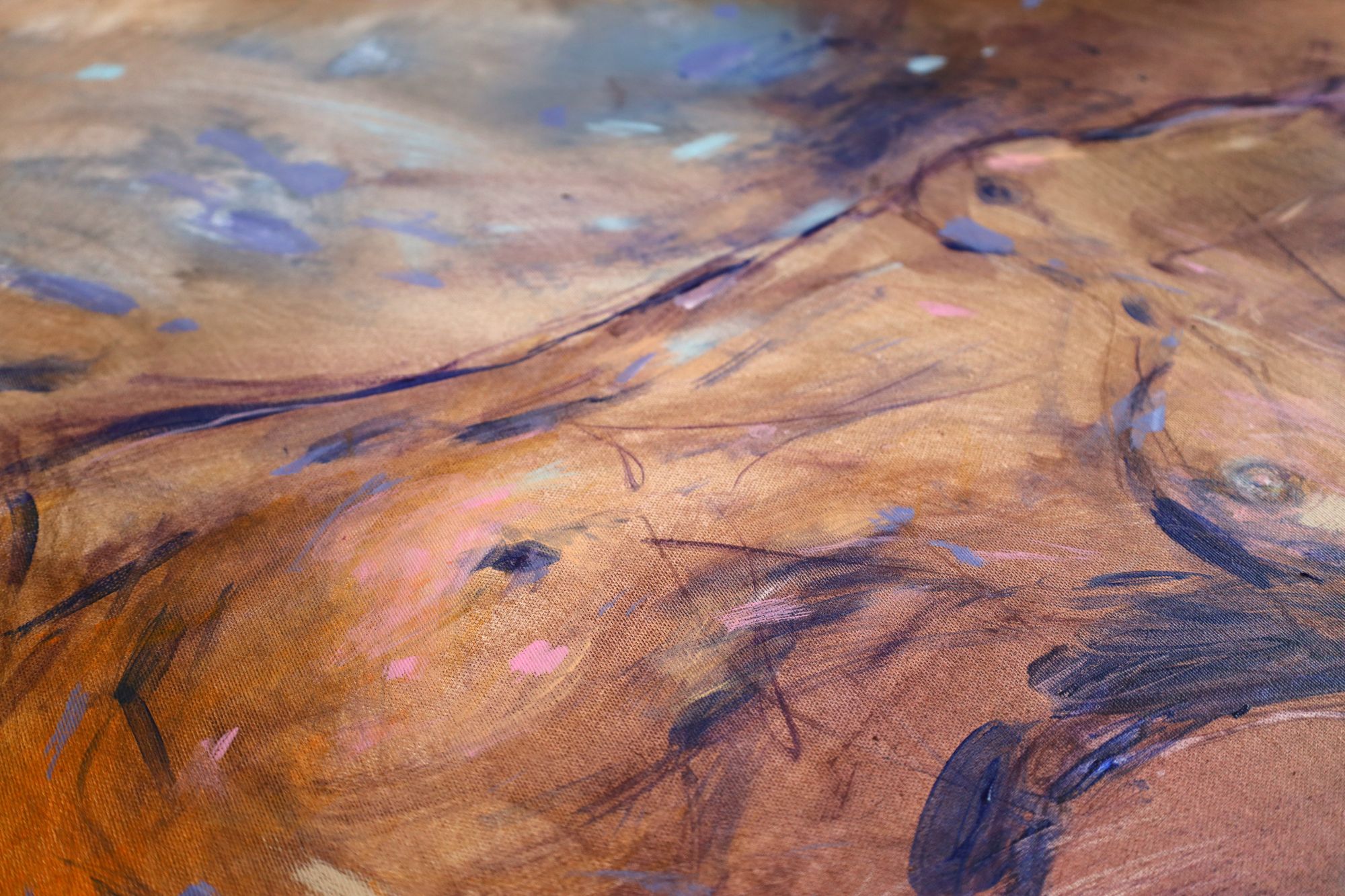 Obraz akrylowy, ręcznie malowany na płótnie. Obraz abstrakcyjny ukazuje akt kobiecy. Utrzymany w pastelowych kolorach, głównie beżach.