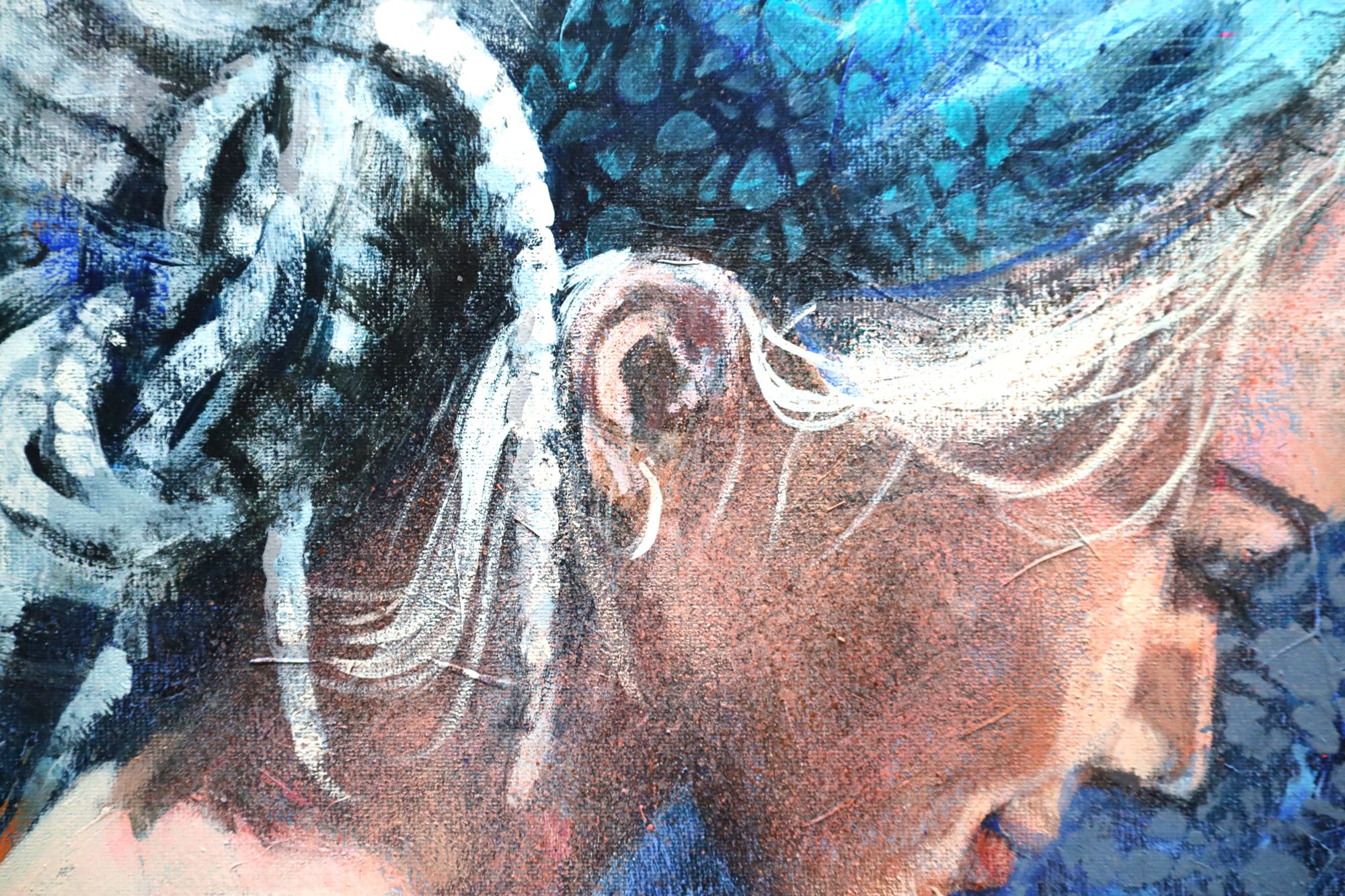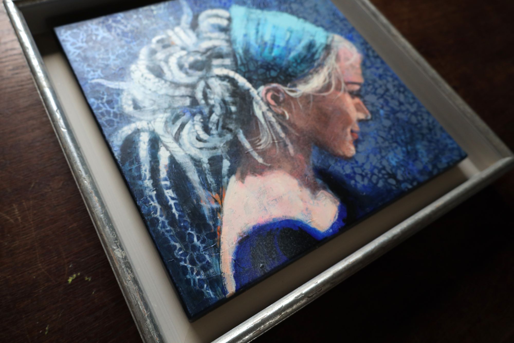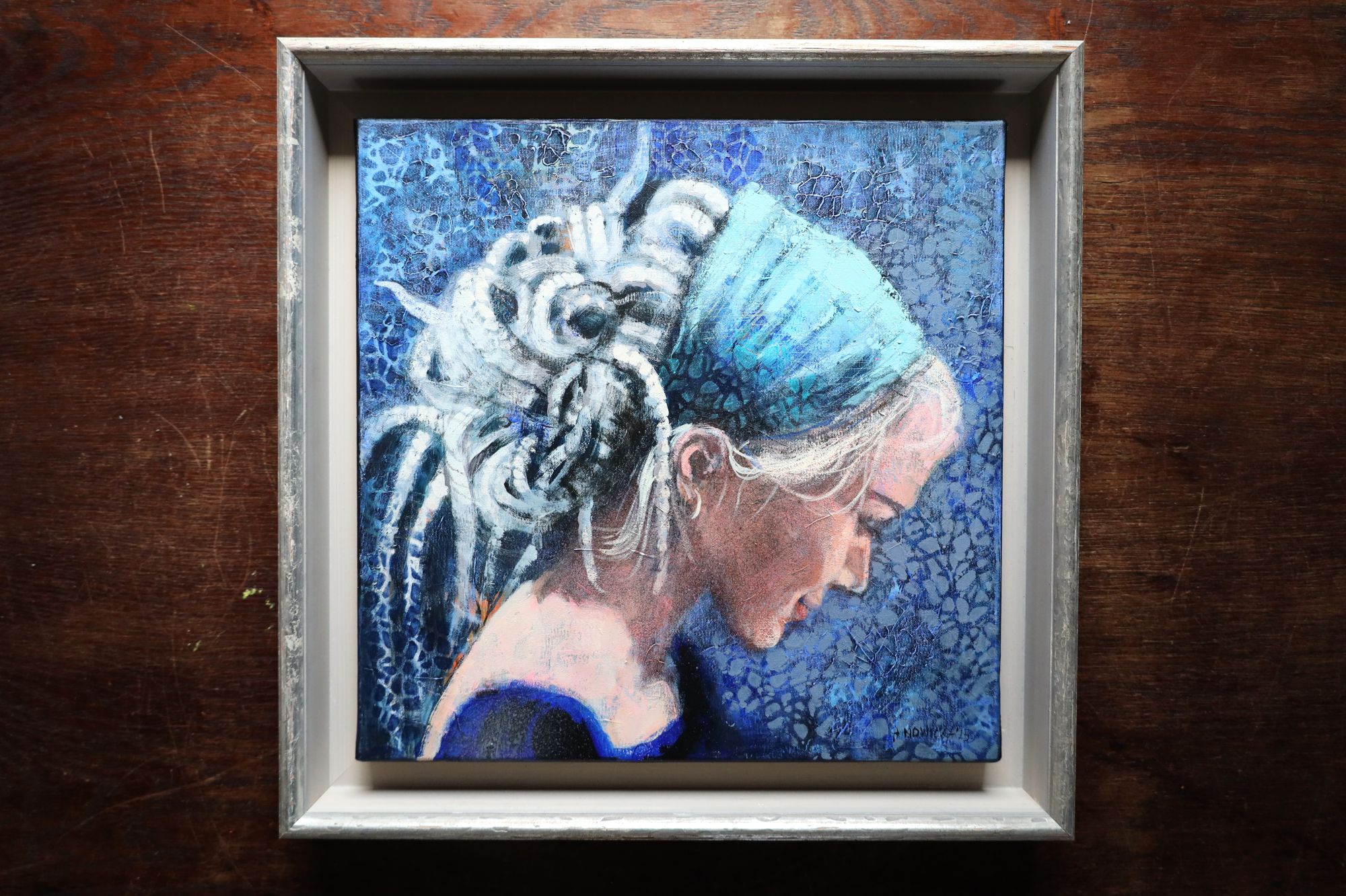 Obraz wykonany stylem impresjonistycznym, techniką akrylową, ręcznie malowany przez artystkę. Nowoczesny portret kobiety, artystki wykonany przez wspaniałą Halinę Nowicką. Znakomita interpretacja kobiecości. Utrzymana w odcieniach koloru niebieskiego.