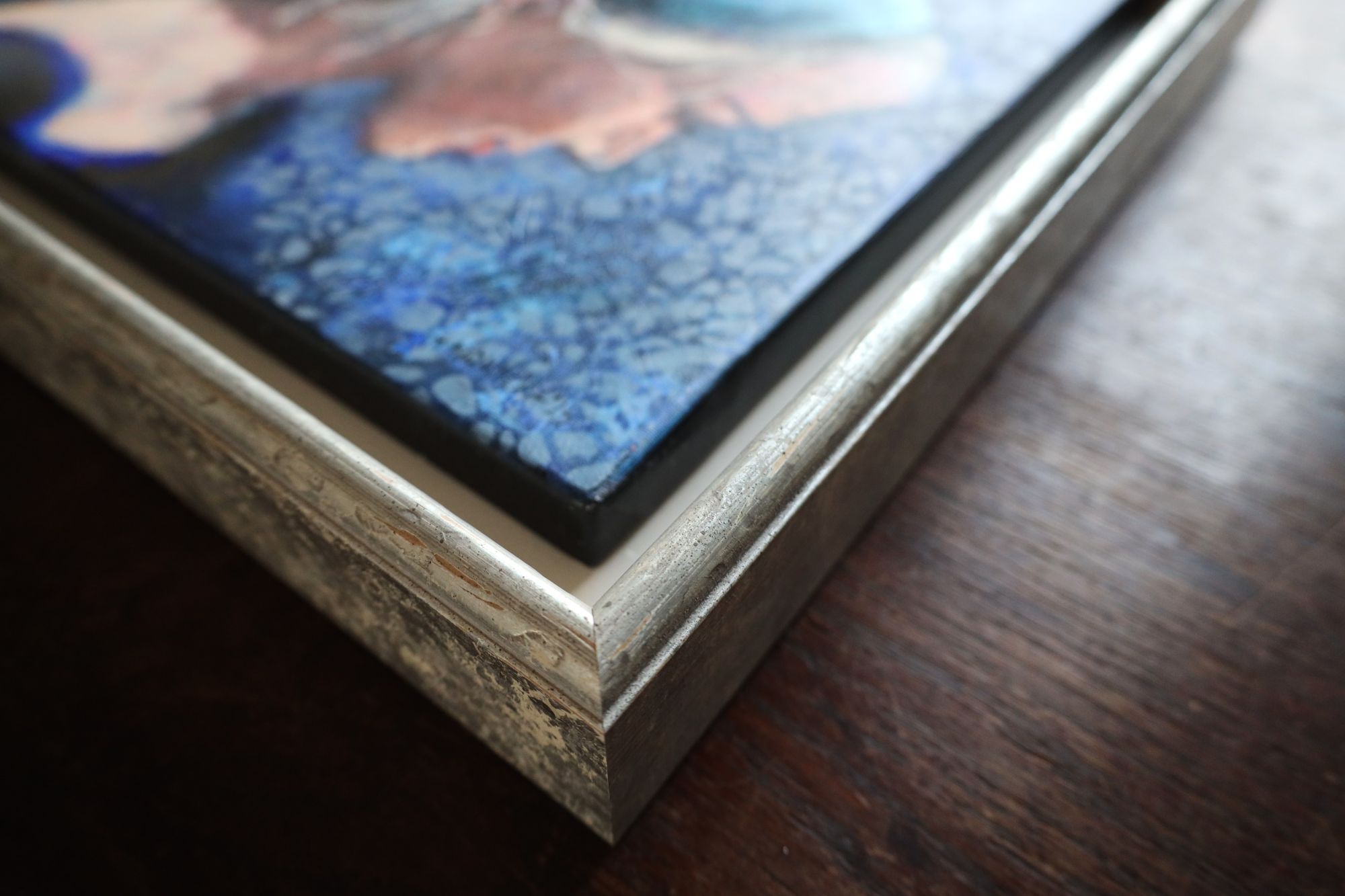 Obraz jest oprawiony w najwyższej jakości ramę drewnianą typu american box, posrebrzoną o beżowym wykończeniu wewnętrz, ręcznie wykończona.