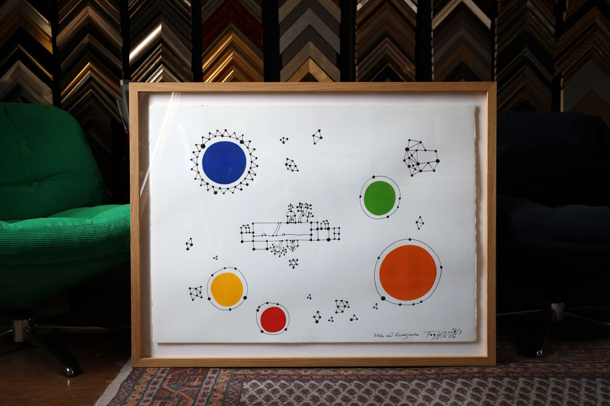 Obraz jest oprawiony za szkłem w drewnianą ramę, fornir dąb. Oprawa autorska.