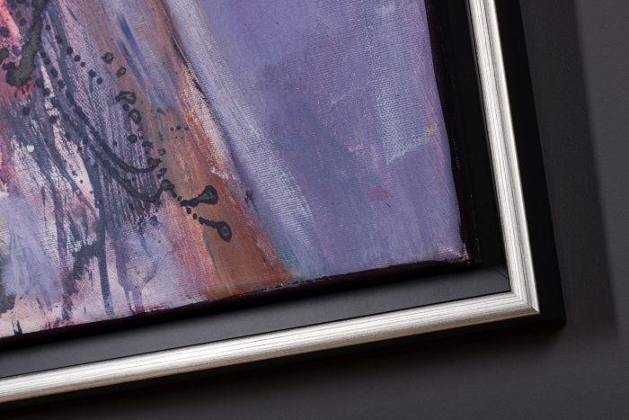 Obraz oprawiony w wysokiej jakości ramę drewnianą typu american box. Bok i wnętrze ramy w kolorze czarnym, matowym. Front ramy srebrny.