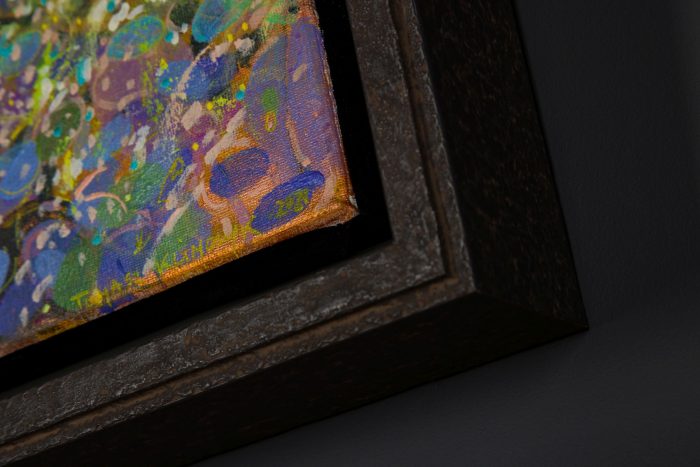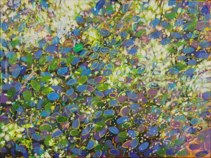 Mały obraz akrylowy na płótnie ręcznie malowany przez artystę. Przedstawia fragment ogrodu, utrzymany w kolorystyce fioletowo-niebieskiej.