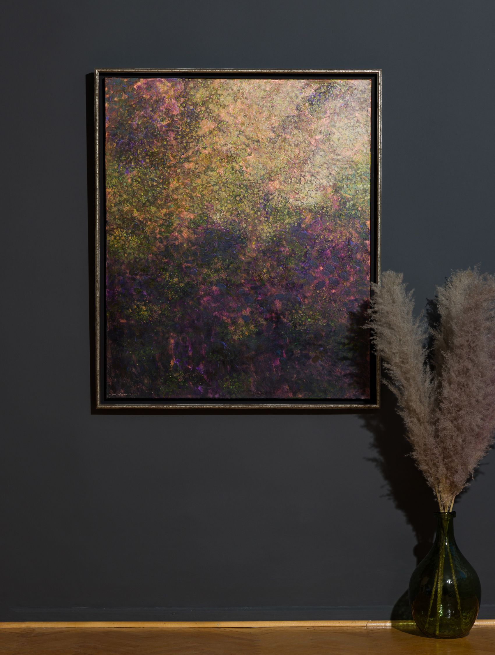 Nowoczesny obraz ręcznie malowany przez artystę. Ciekawy obraz impresjonistyczny o stonowanej, ciepłej barwie i niesamowitej głębi. Motywem jest fragment ogrodu. Duży format.