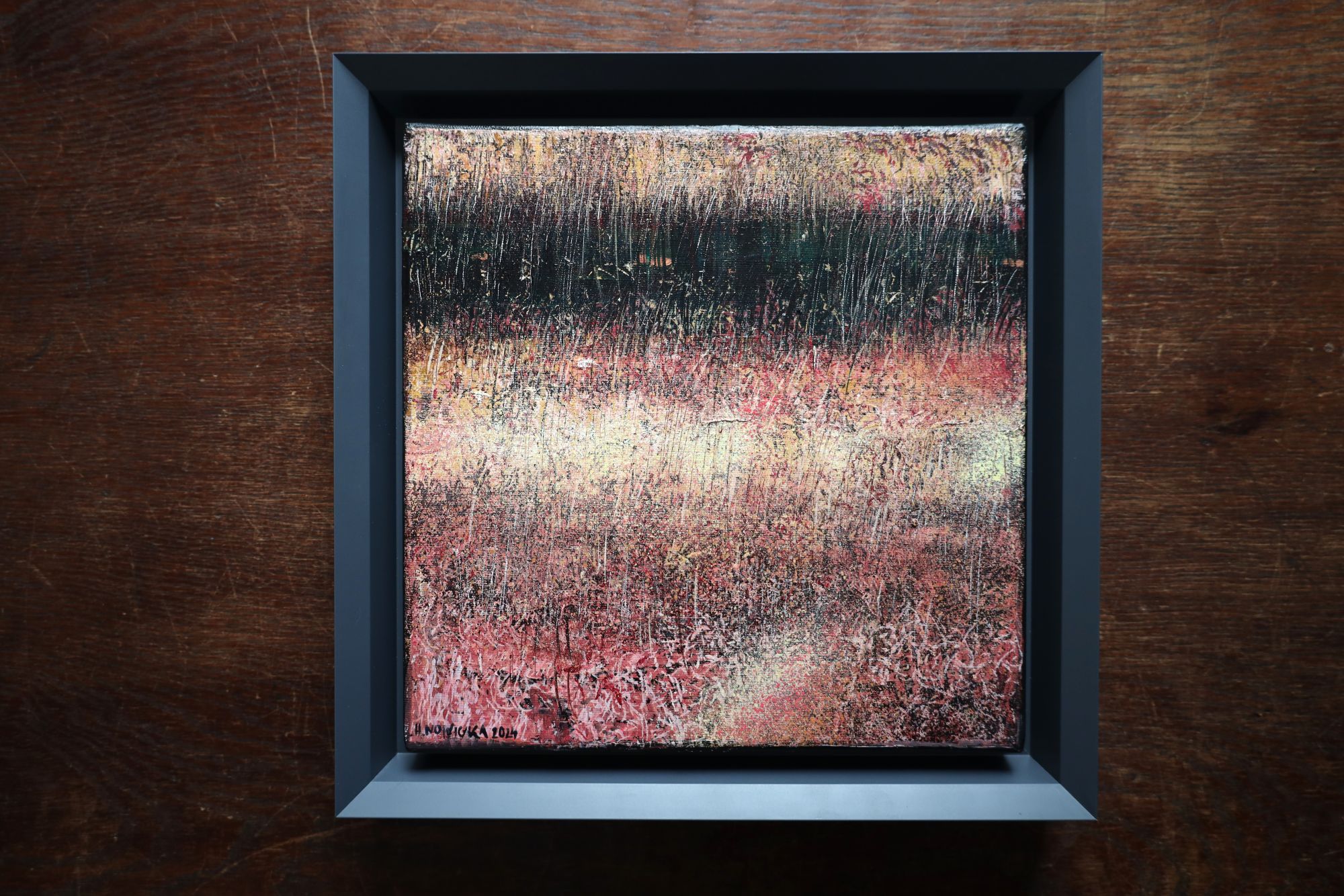 Mały obrazek ręcznie malowany, oprawiony w nowoczesną ramę. Przedstawia fragment łąki. Piękny pejzaż w ciekawej kolorystyce. Idealny obraz na prezent.