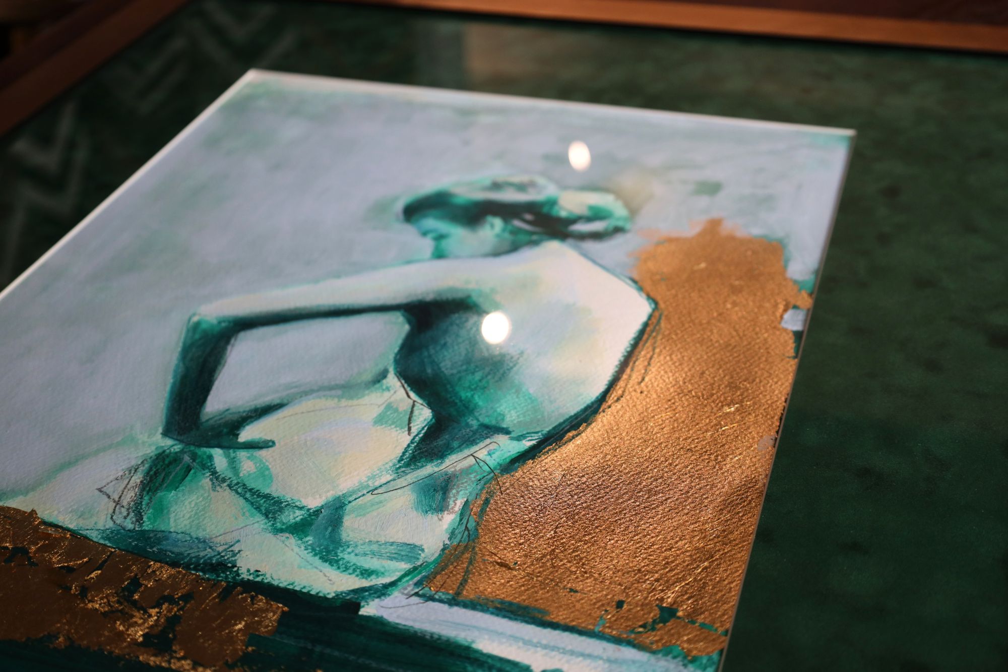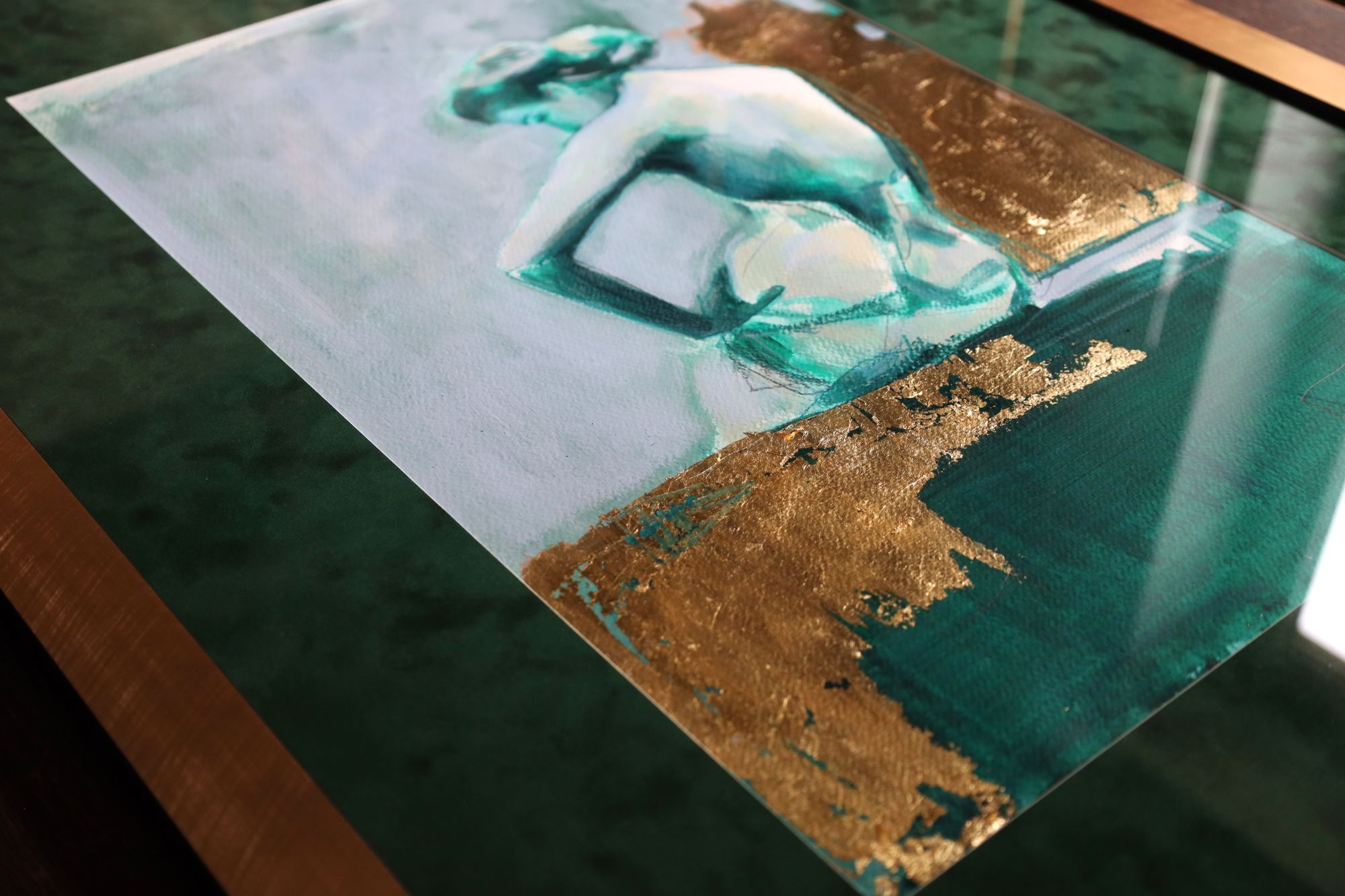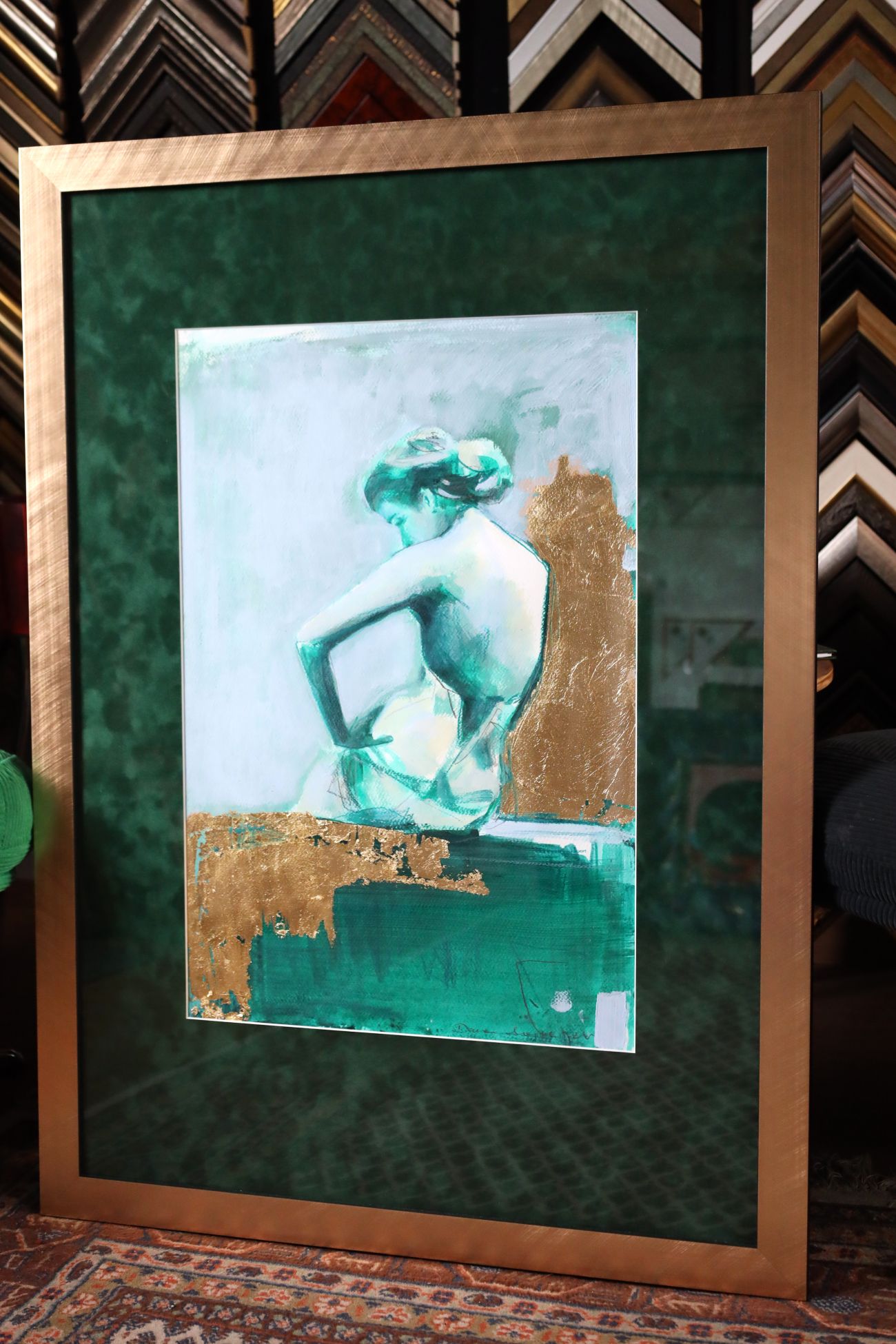 Obraz jest sprzedawany w oprawie. Obraz oprawiony w wysokiej jakości ramę drewnianą w kolorze złota za szkłem i velurowym, zielonym passepartout .