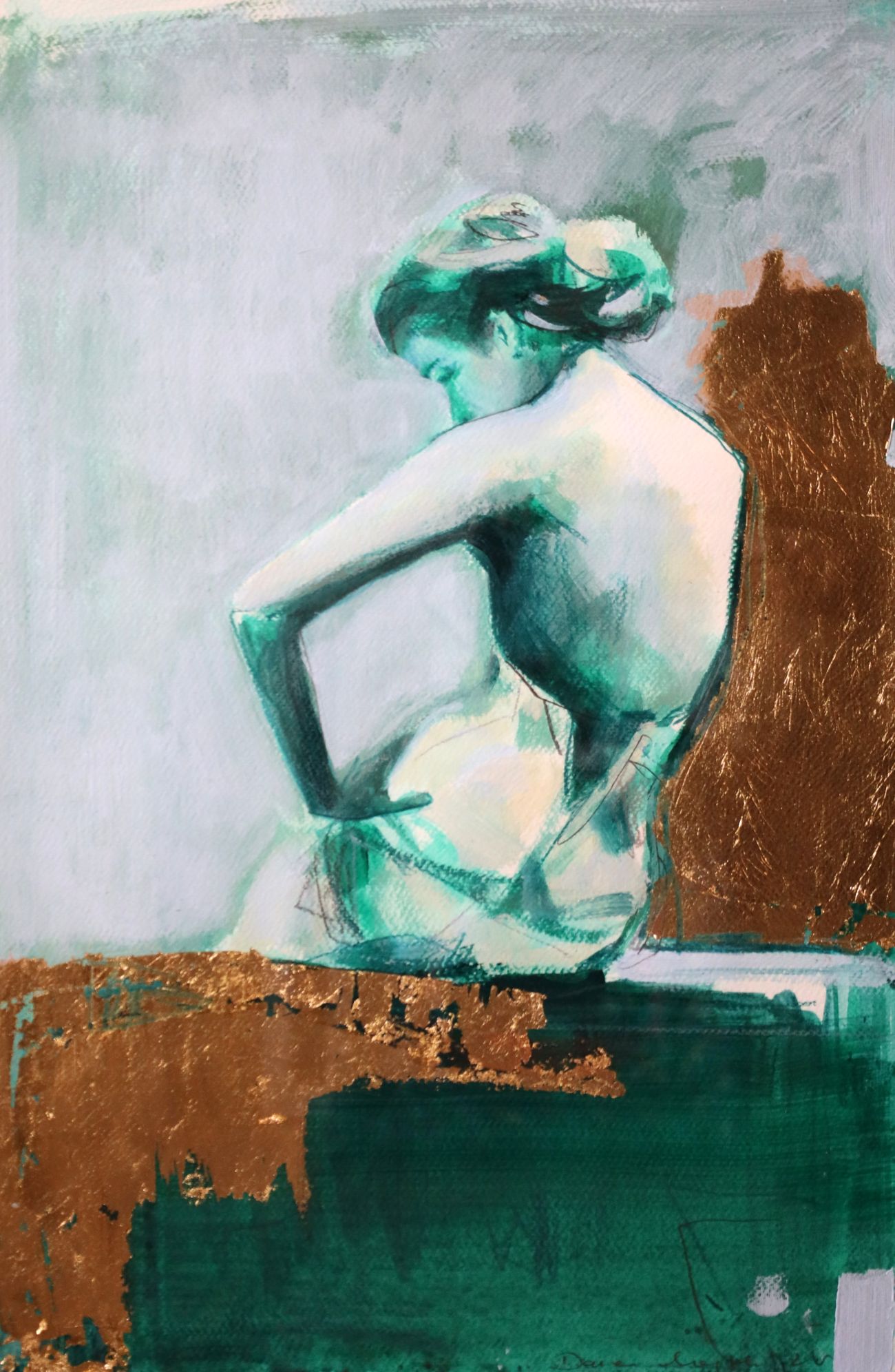 Obraz wykonany ręcznie techniką mieszaną przez artystkę na papierze. Mały format, utrzymany w kolorystyce beżowo-zielonej.
