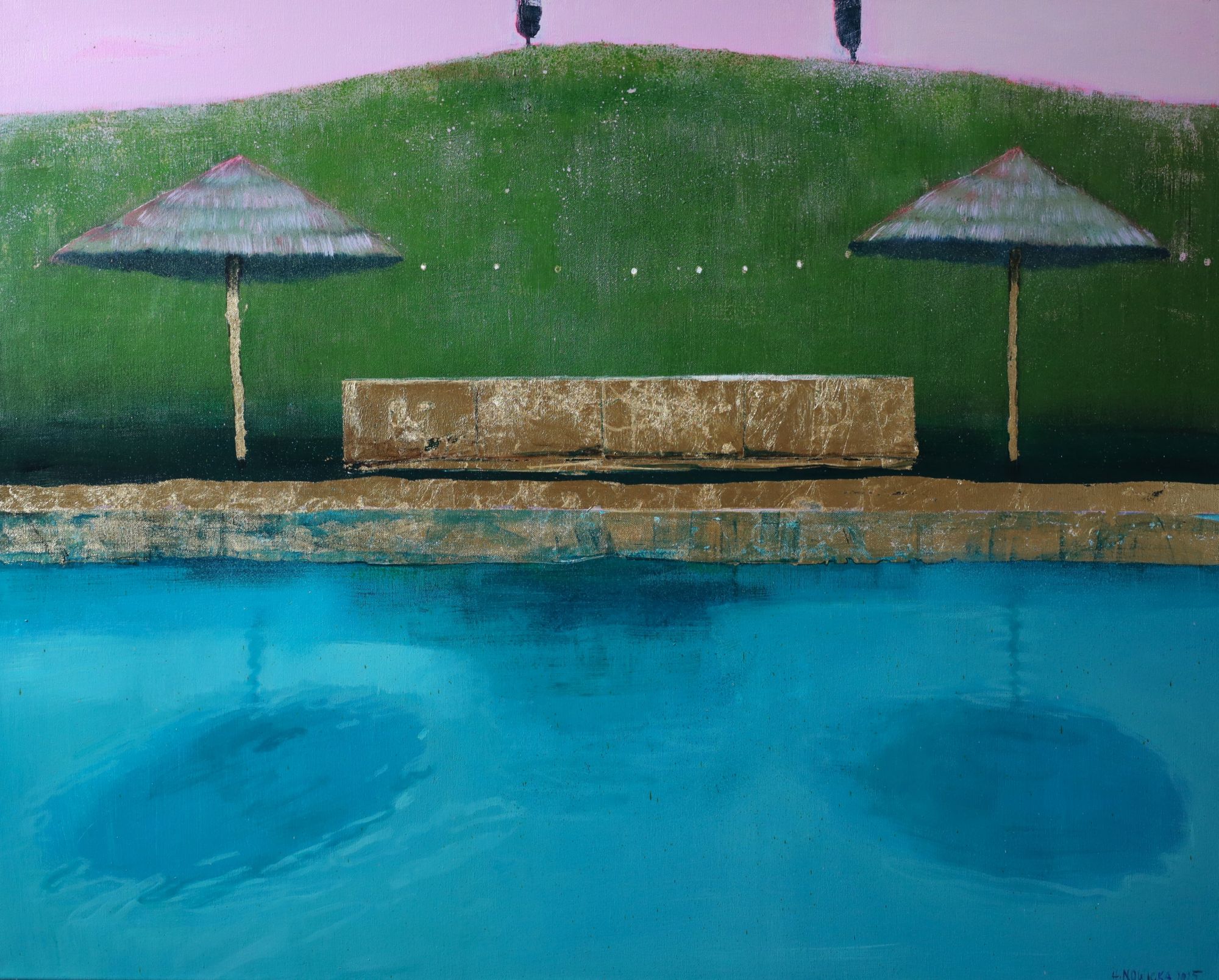 Nowoczesny, duży obraz z motywem złota. Ciepły wieczór w Toskanii, basen, złoty stół i lampki….zaraz odbędzie się przyjęcie i zakłóci spokój panujący na obrazie…Piękny, minimalistyczny w odbiorze obraz o wspaniałych kolorach.