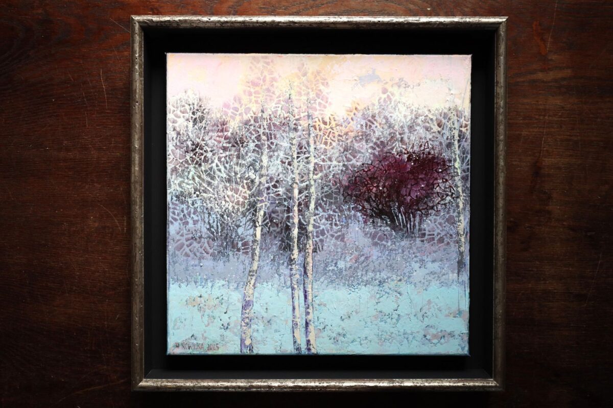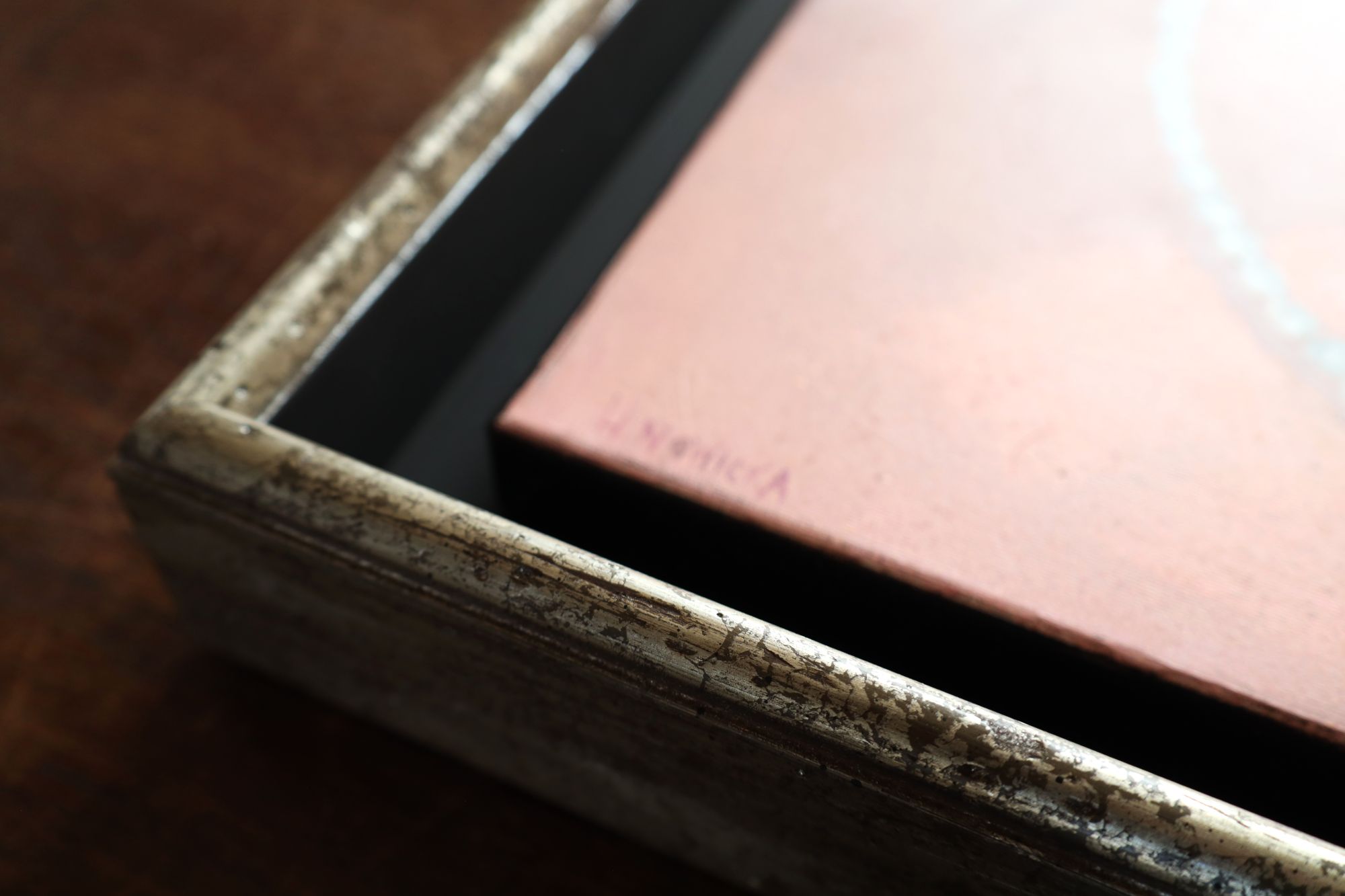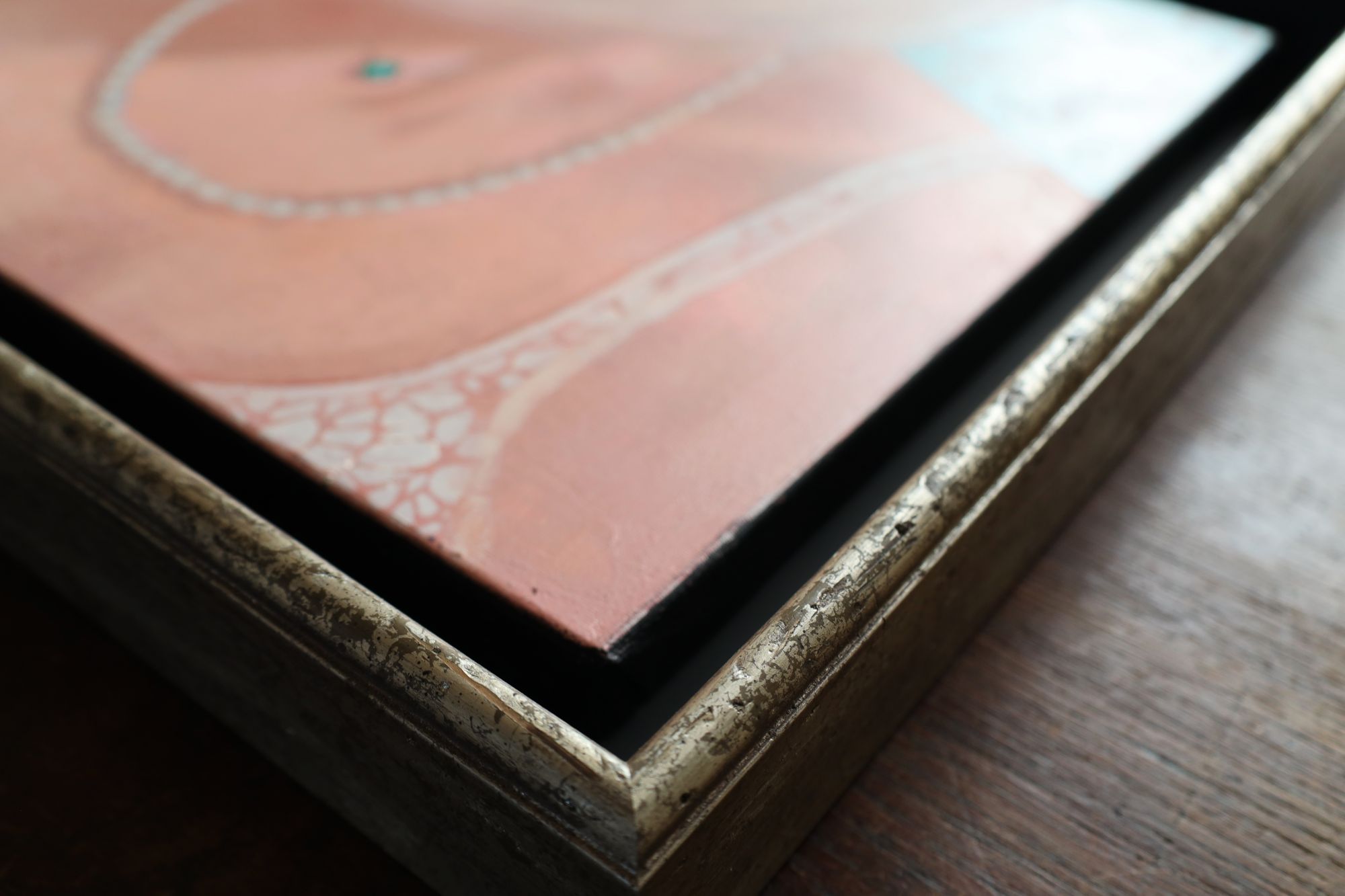 Obraz oprawiony w wysokiej jakości ramę drewnianą typu american box, ręcznie wykończoną, wewnątrza czarny mat, na zewnątrz srebrno-beżowa, postarzana.