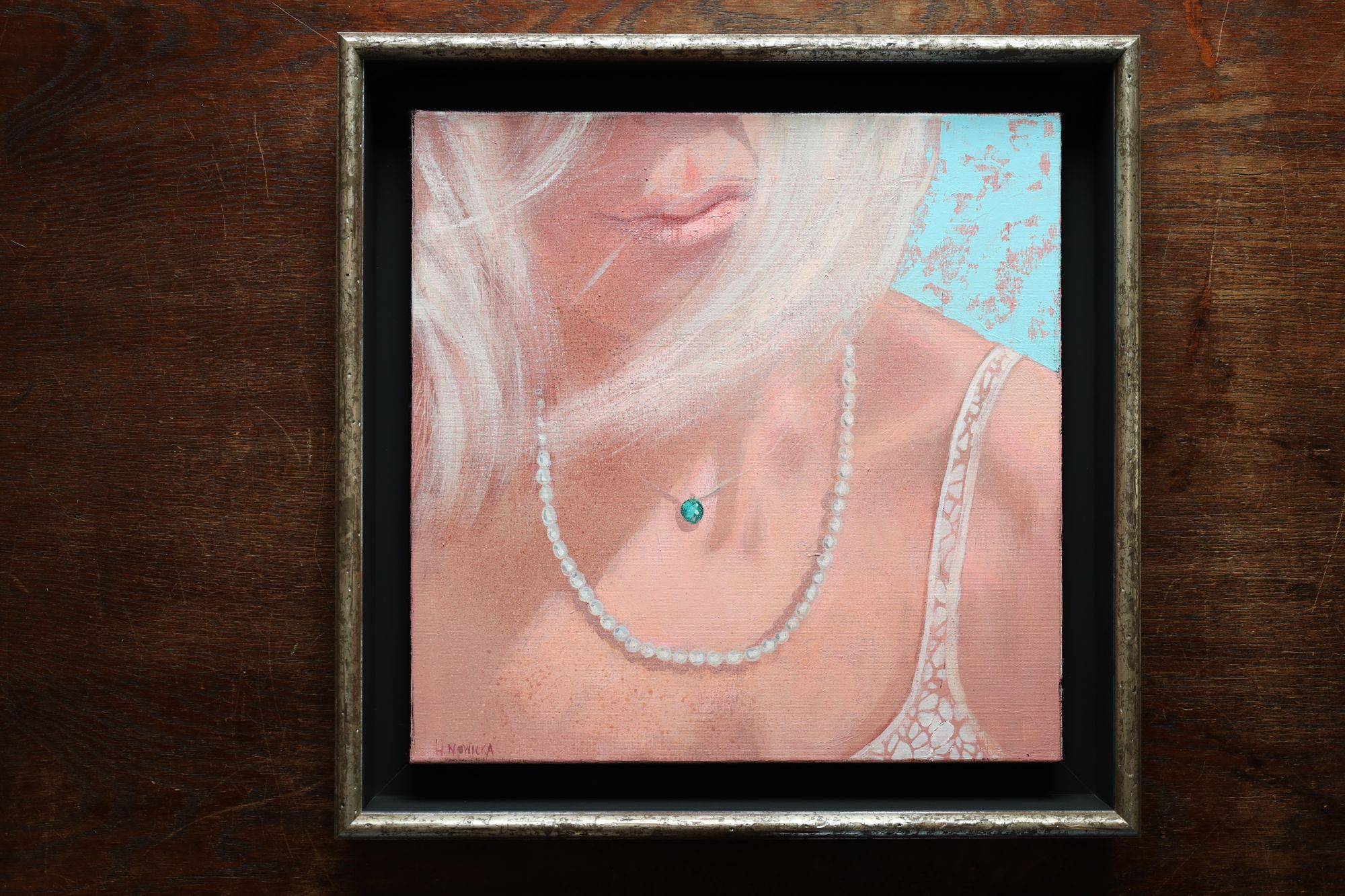 Obraz wykonany stylem impresjonistycznym, techniką akrylową, ręcznie malowany przez artystkę. Nowoczesny portret kobiety, artystki wykonany przez wspaniałą Halinę Nowicką. Znakomita interpretacja kobiecości. Obraz bardzo jasny, utrzymany w pastelowych kolorach.