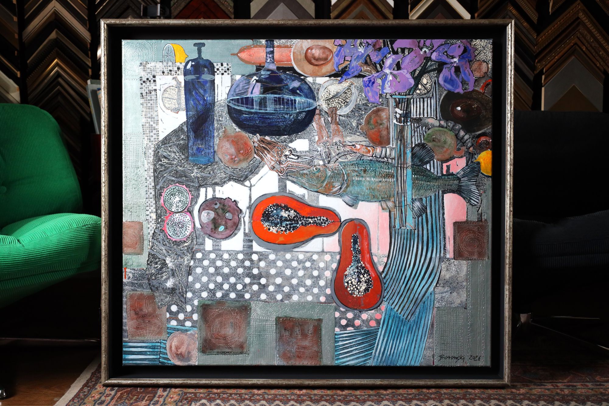 Obraz akrylowy na płótnie. Nowoczesna martwa natura. Duży obraz, idealny do salonu. Oprawiony w wysokiej jakości ramę drewnianą typu american box, ręcznie wykończoną, wewnątrz czarna, matowa patyna, na zewnątrz płatkowana, postarzana.