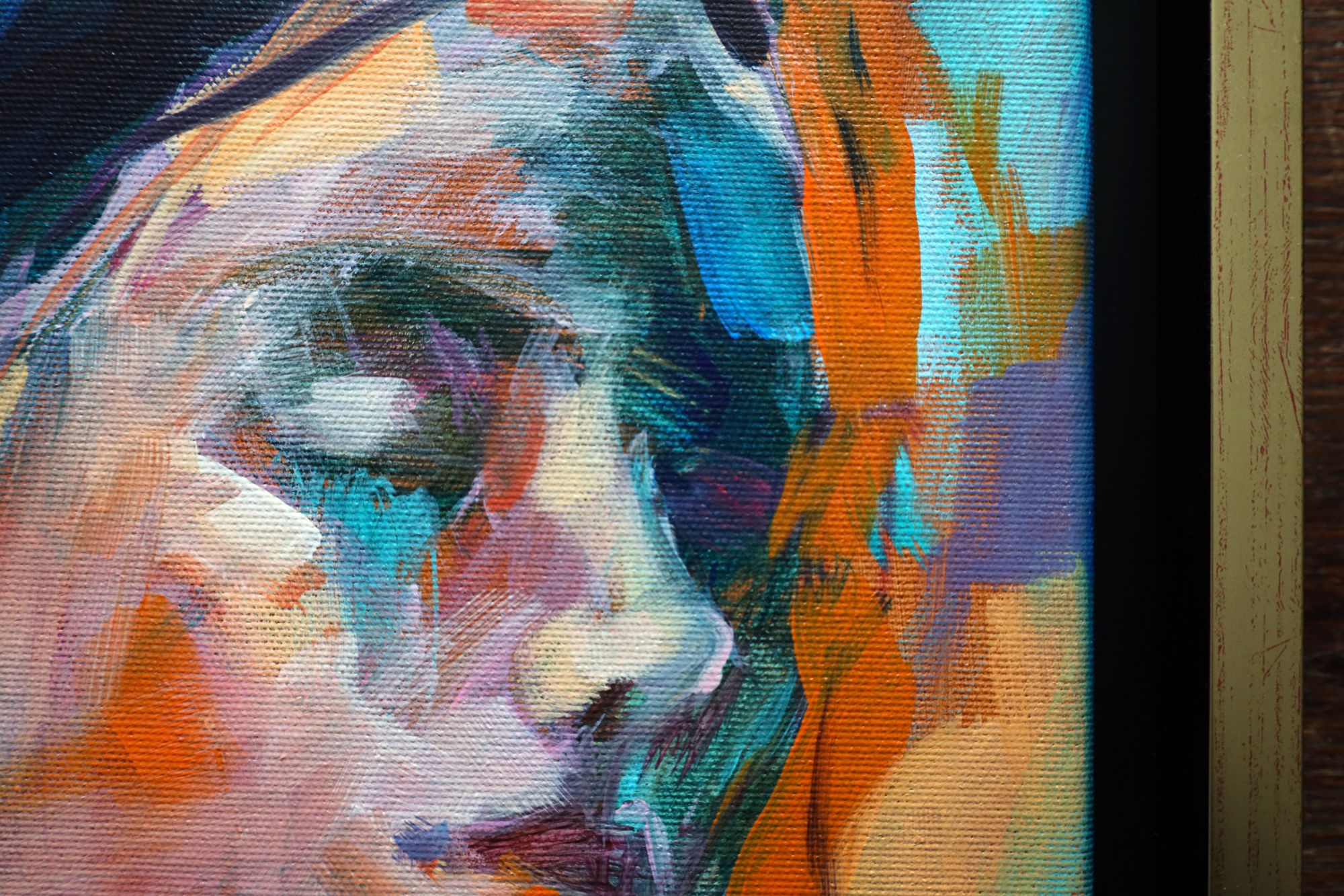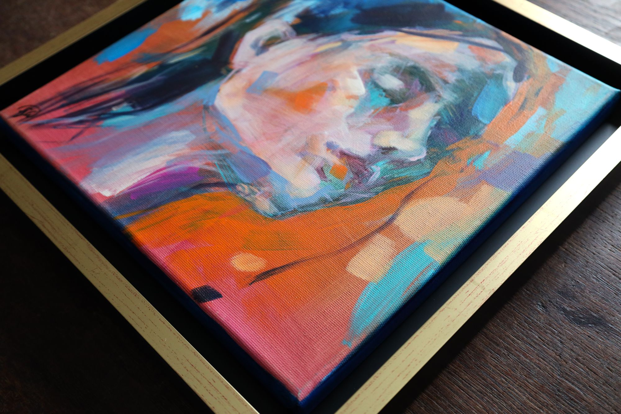 Mały obraz akrylowy, ręcznie malowany na płótnie. Obraz abstrakcyjny ukazuje portret kobiety, złożonej z feeri barw.