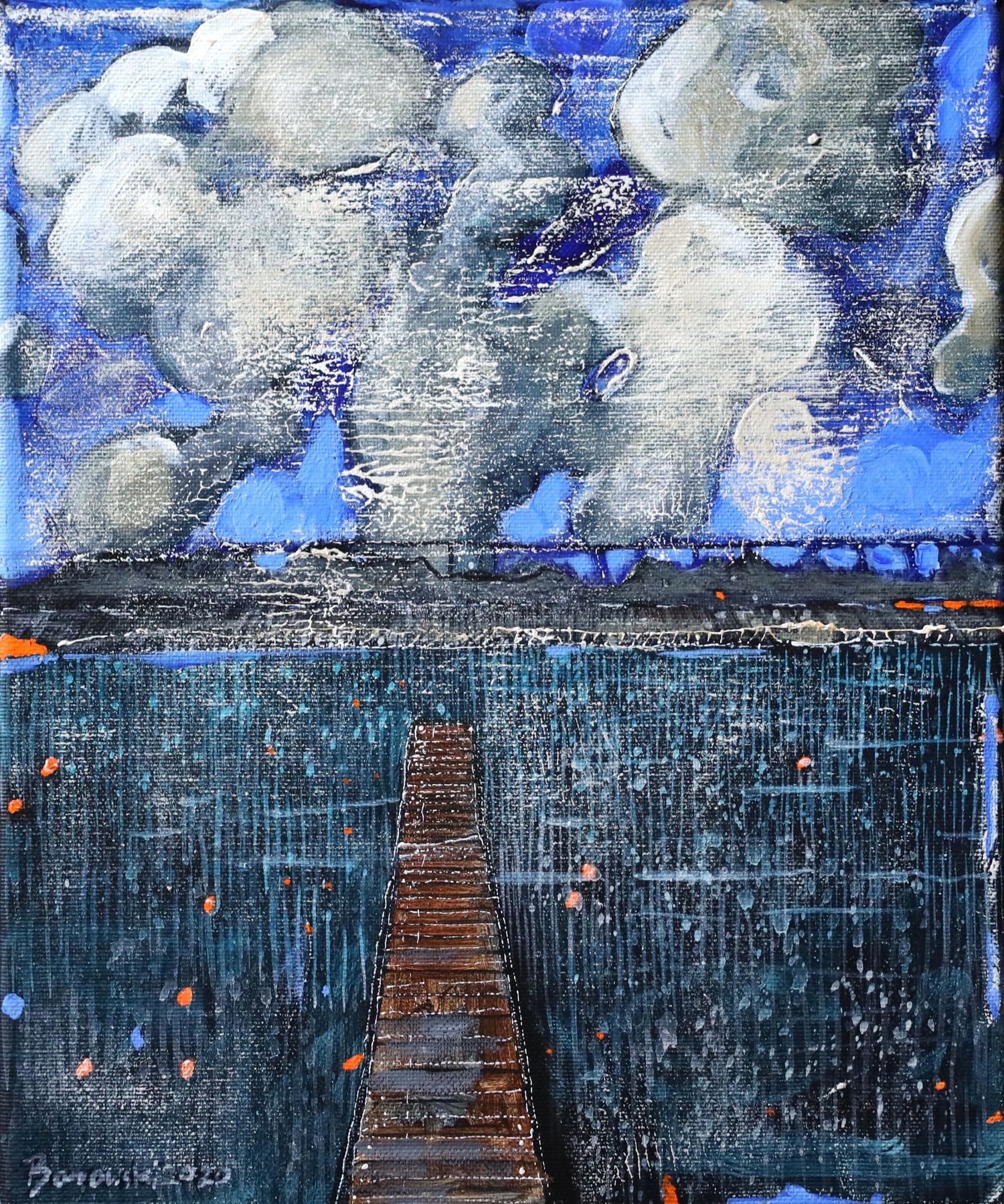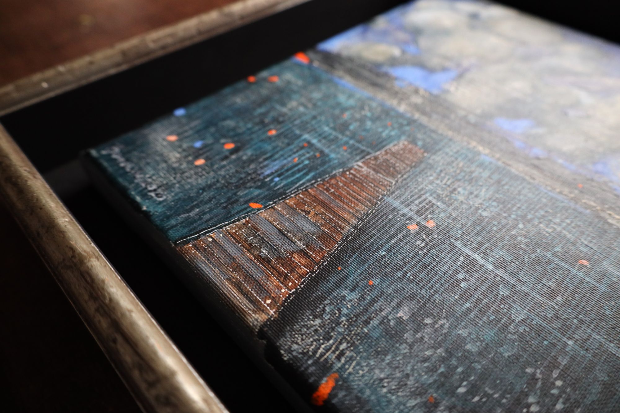 Obraz akrylowy na płótnie. Inspiracją do powstania obrazu były mazurskie widoki. Obraz utrzymany w pięknych kolorach. Oprawiony w wysokiej jakości ramę drewnianą typu american box, ręcznie wykończoną, wewnątrz czarna, matowa patyna, na zewnątrz płatkowana, postarzana.