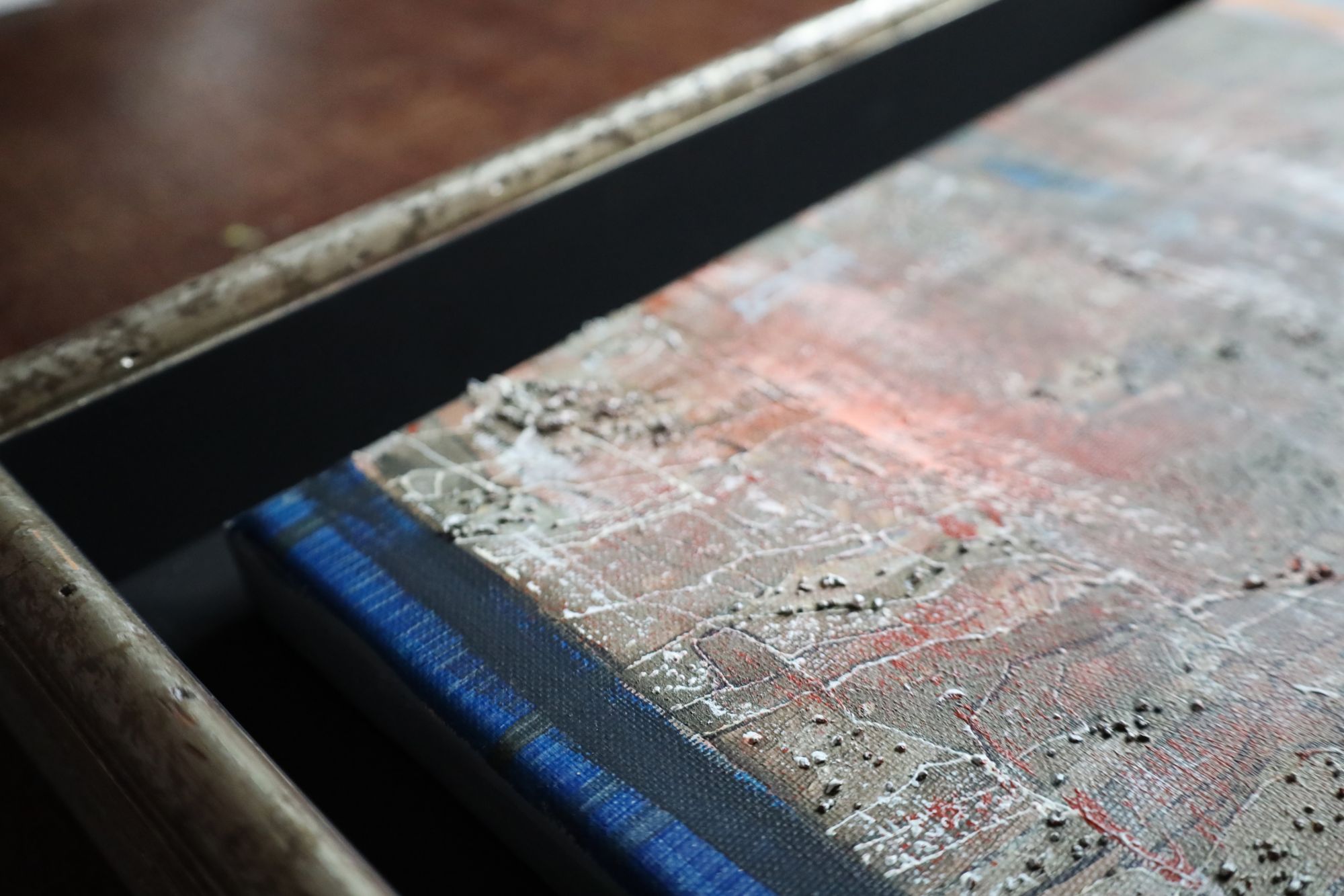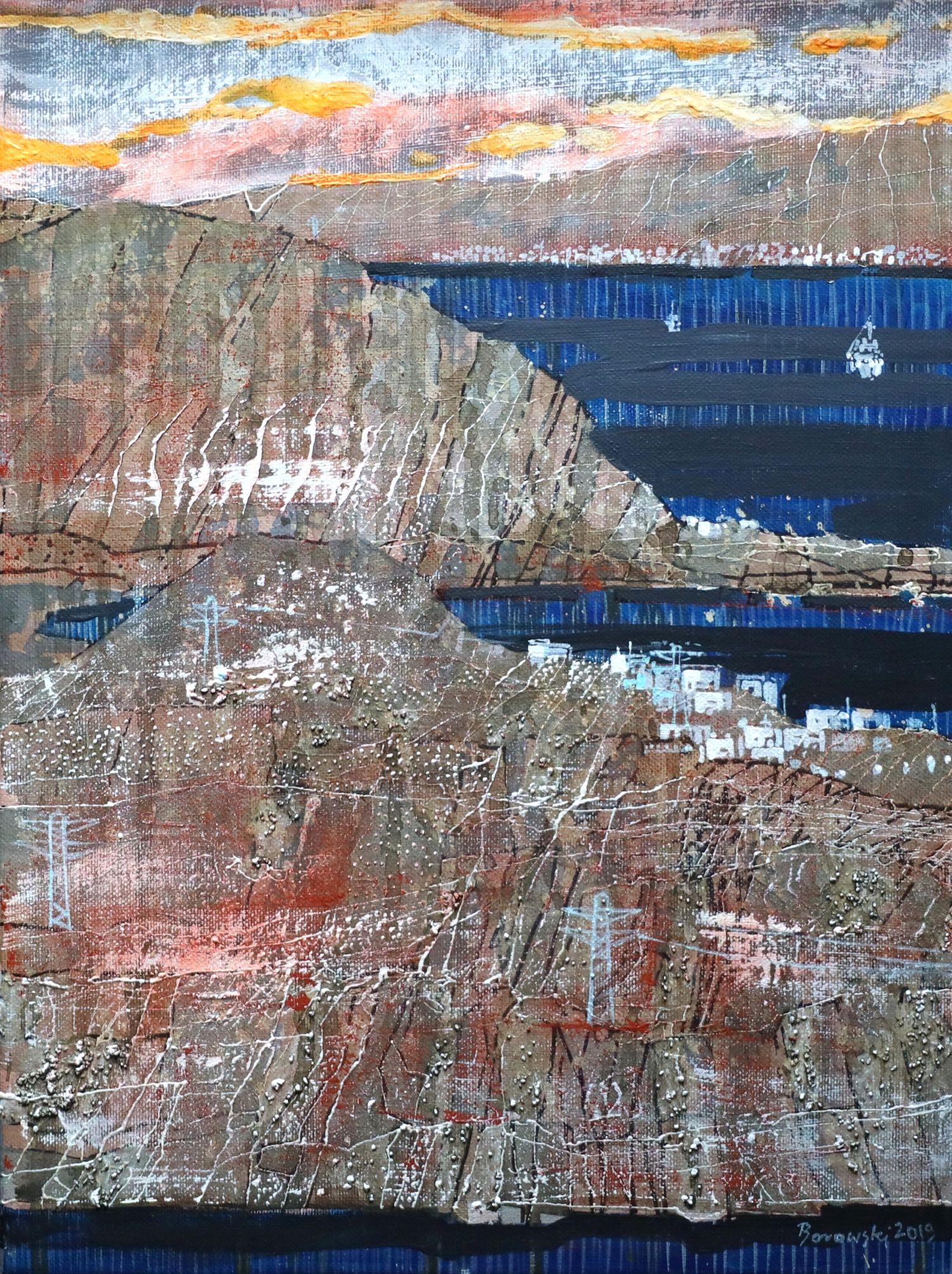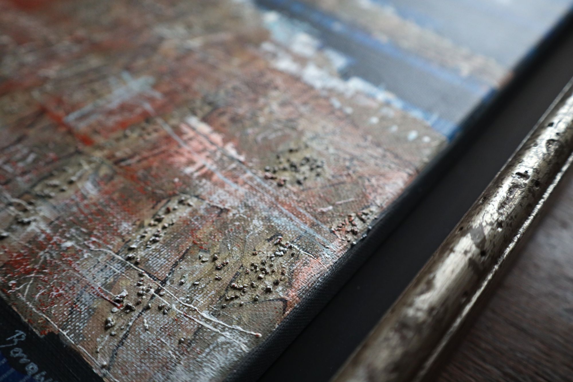 Obraz akrylowy na płótnie. Nowoczesny pejzaż. Obraz utrzymany w ciepłych kolorach. Oprawiony w wysokiej jakości ramę drewnianą typu american box, ręcznie wykończoną, wewnątrz czarna, matowa patyna, na zewnątrz płatkowana, postarzana.