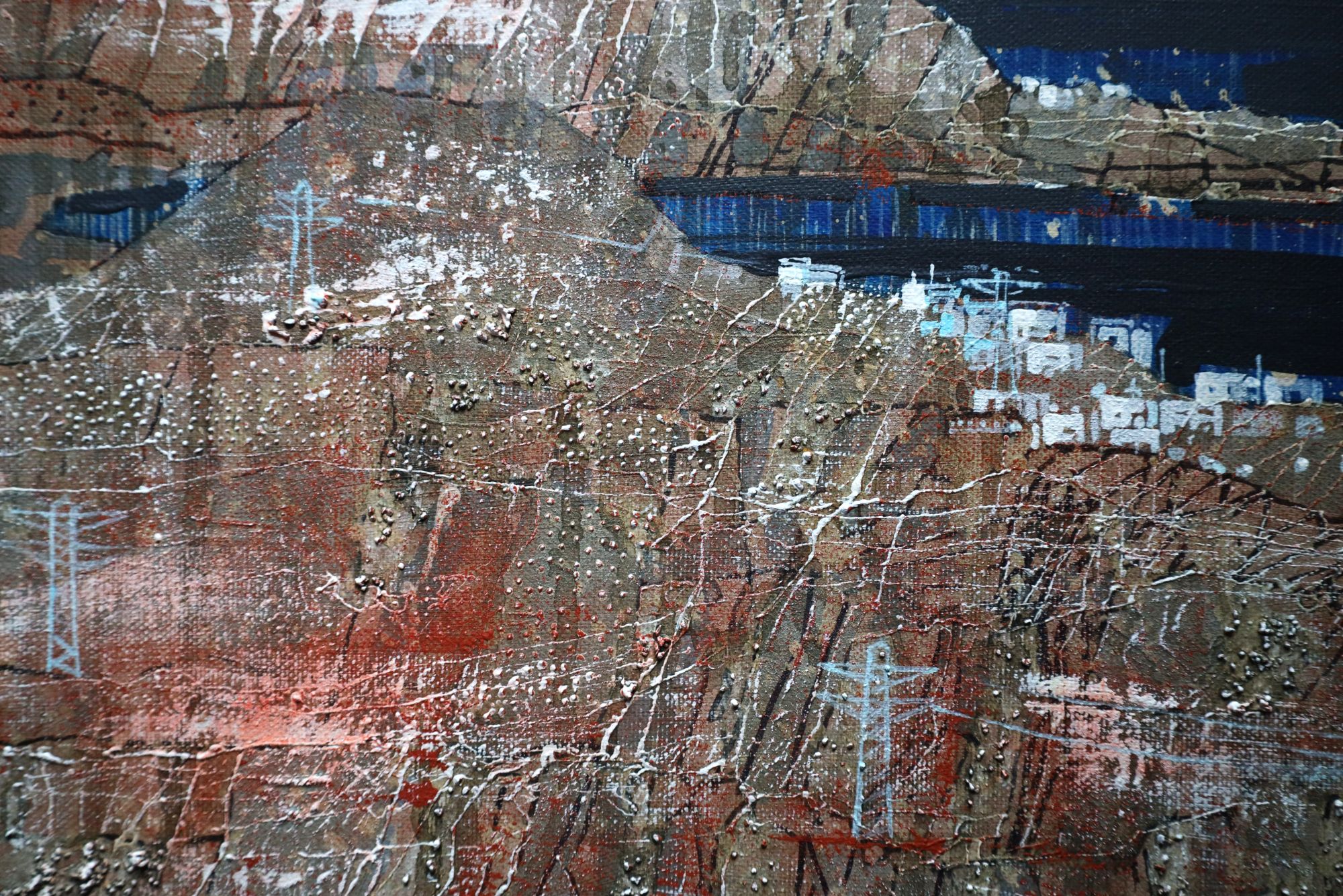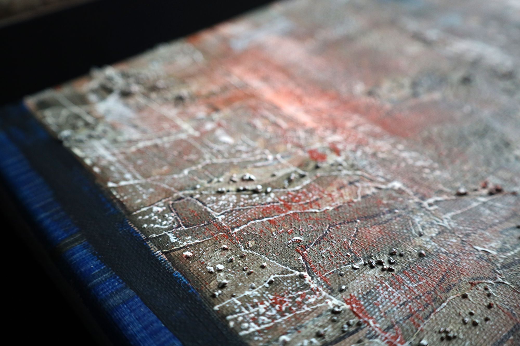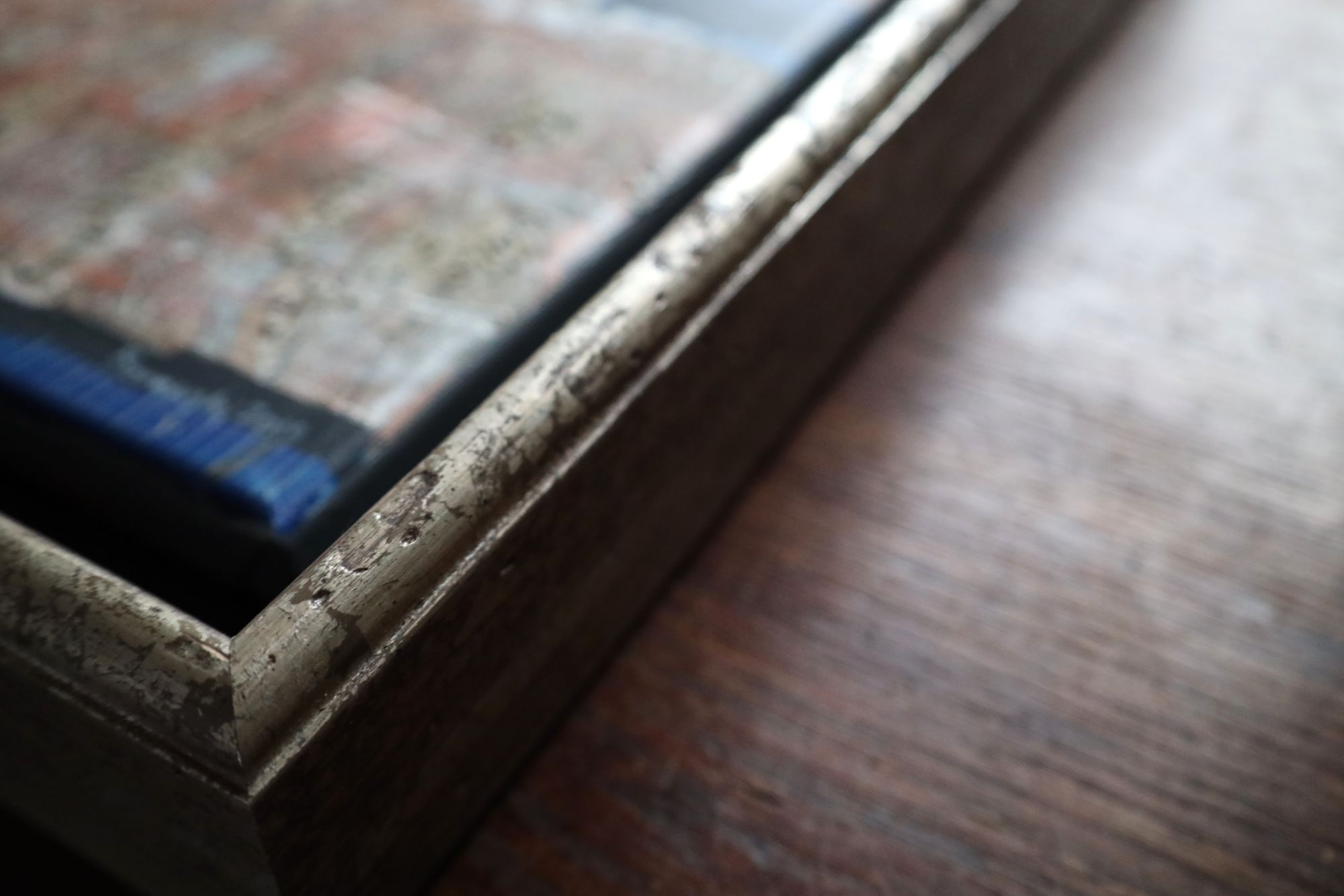 Obraz akrylowy na płótnie. Nowoczesny pejzaż. Obraz utrzymany w ciepłych kolorach. Oprawiony w wysokiej jakości ramę drewnianą typu american box, ręcznie wykończoną, wewnątrz czarna, matowa patyna, na zewnątrz płatkowana, postarzana.