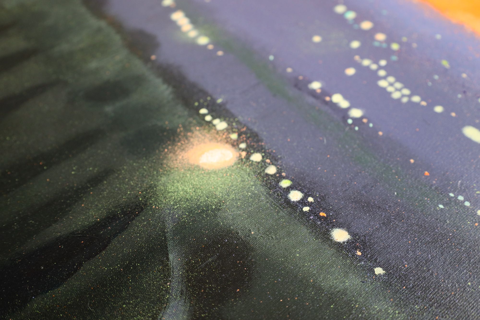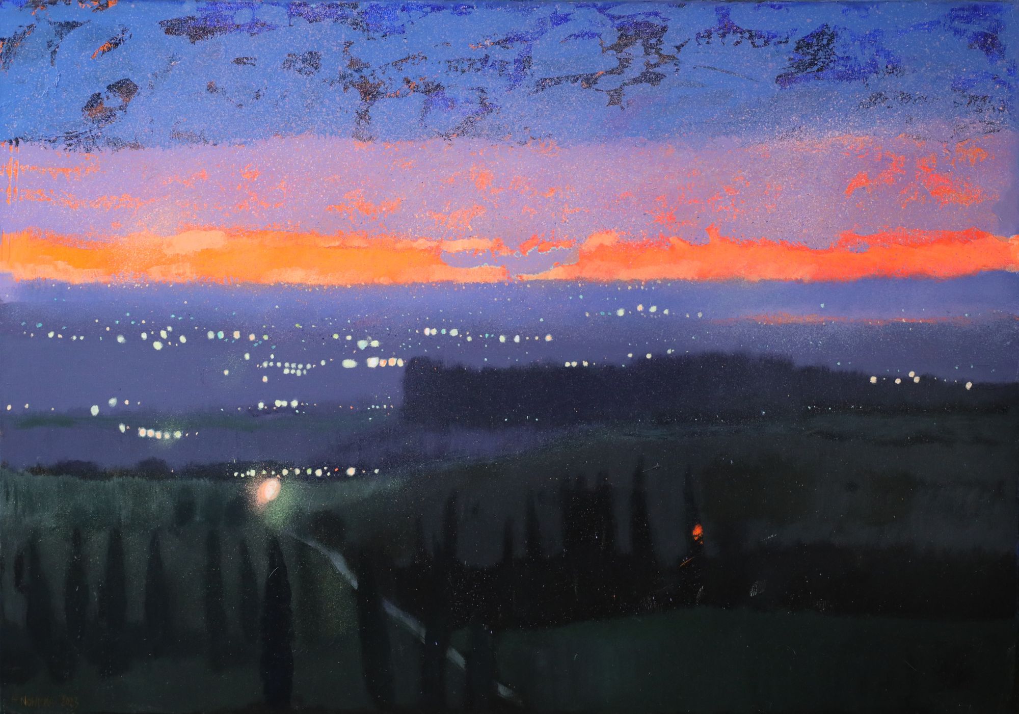Nowoczesny, duży obraz w stylu impresjonistycznym. Przedstawia widok na włoskie miasteczko Siena wieczorową porą. Jest to obraz z serii toskańskich pejzaży. Zaskakujące połączenie kolorów, niesamowity w odbiorze na żywo. Piękny, unikatowy pejzaż.