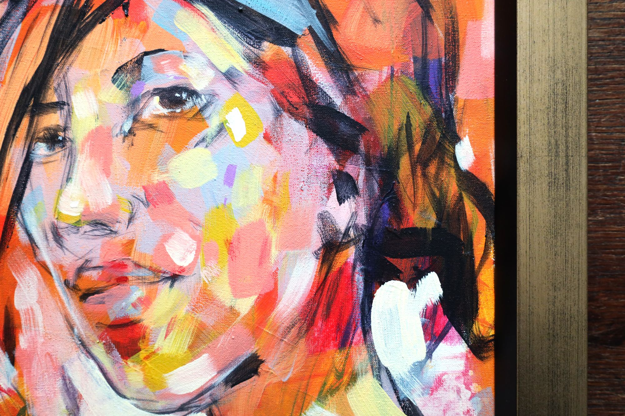 Mały obraz akrylowy, ręcznie malowany na płótnie. Obraz abstrakcyjny ukazuje portret kobiety, złożonej z feeri barw.